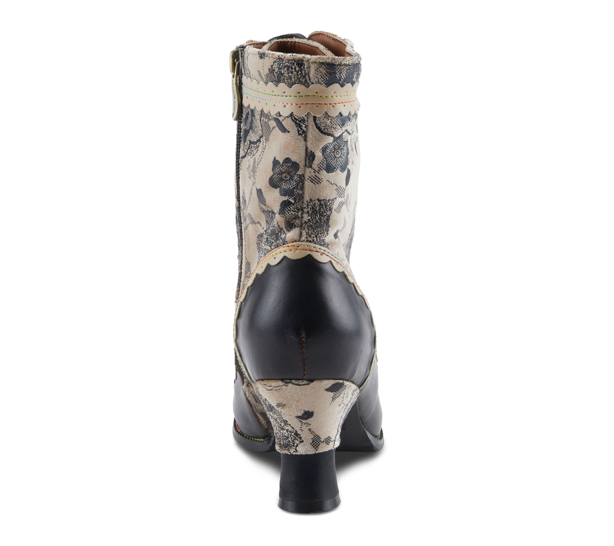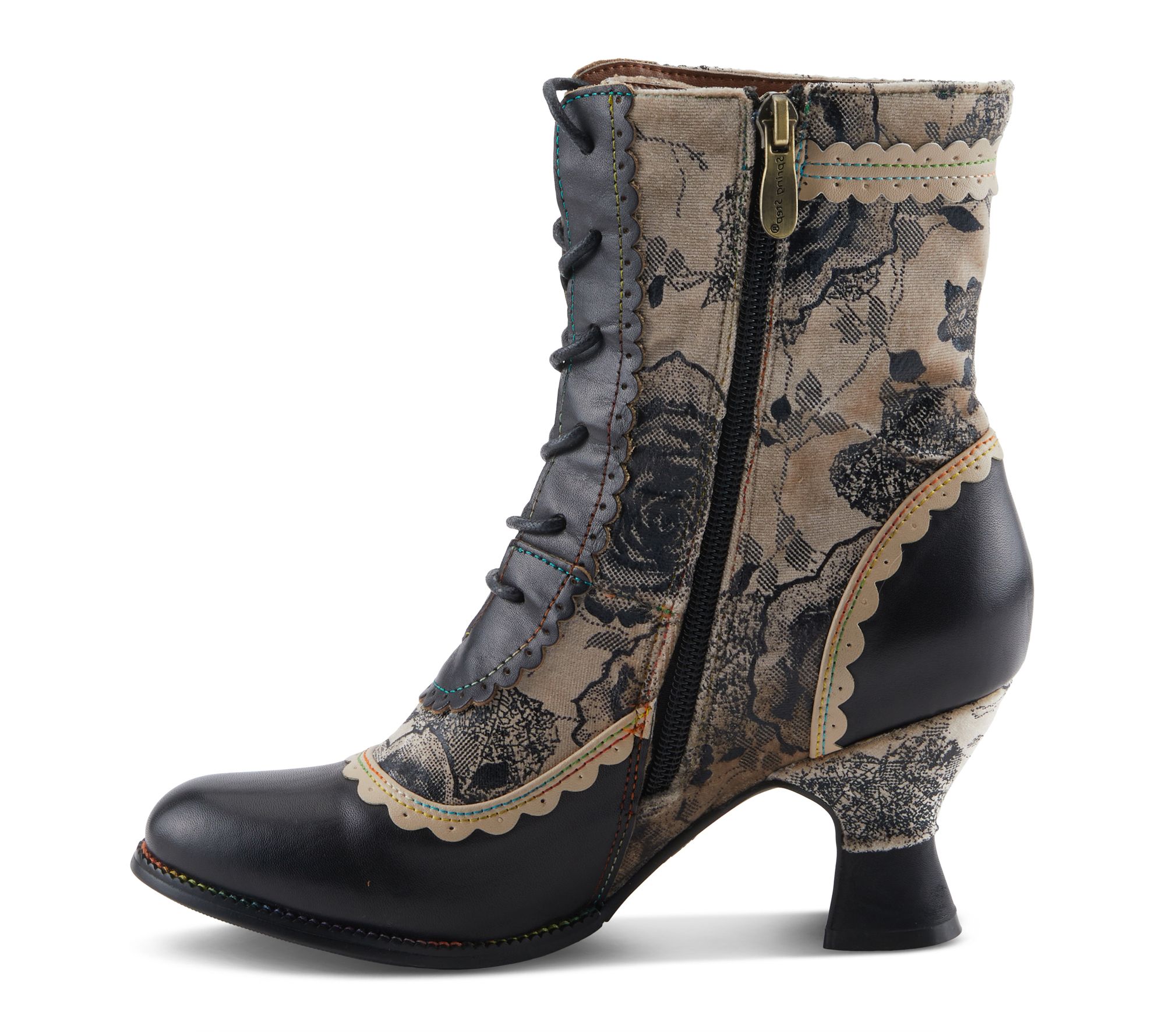 Channel your inner creative spirit with these artistic lace-up leather boots, where bold floral prints and rich textures set the mood for any adventure. Styled with scalloped trim and baroque details, this mid-heel design pairs beautifully with casual jeans or a dressy skirt for an unforgettable look. Enjoy all-day comfort and effortless wear, thanks to the cushioned insole and easy side zip. From L'Artiste.