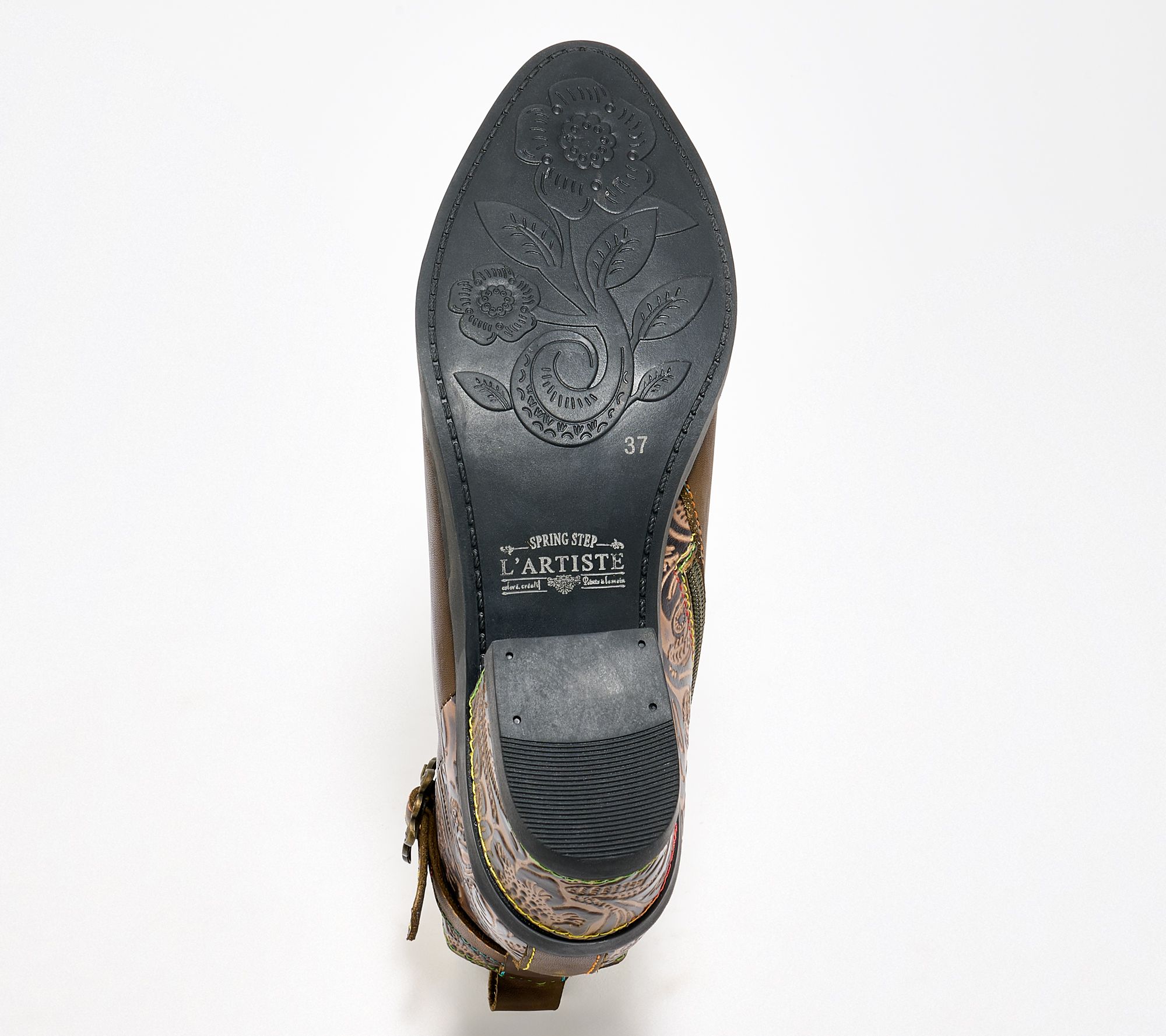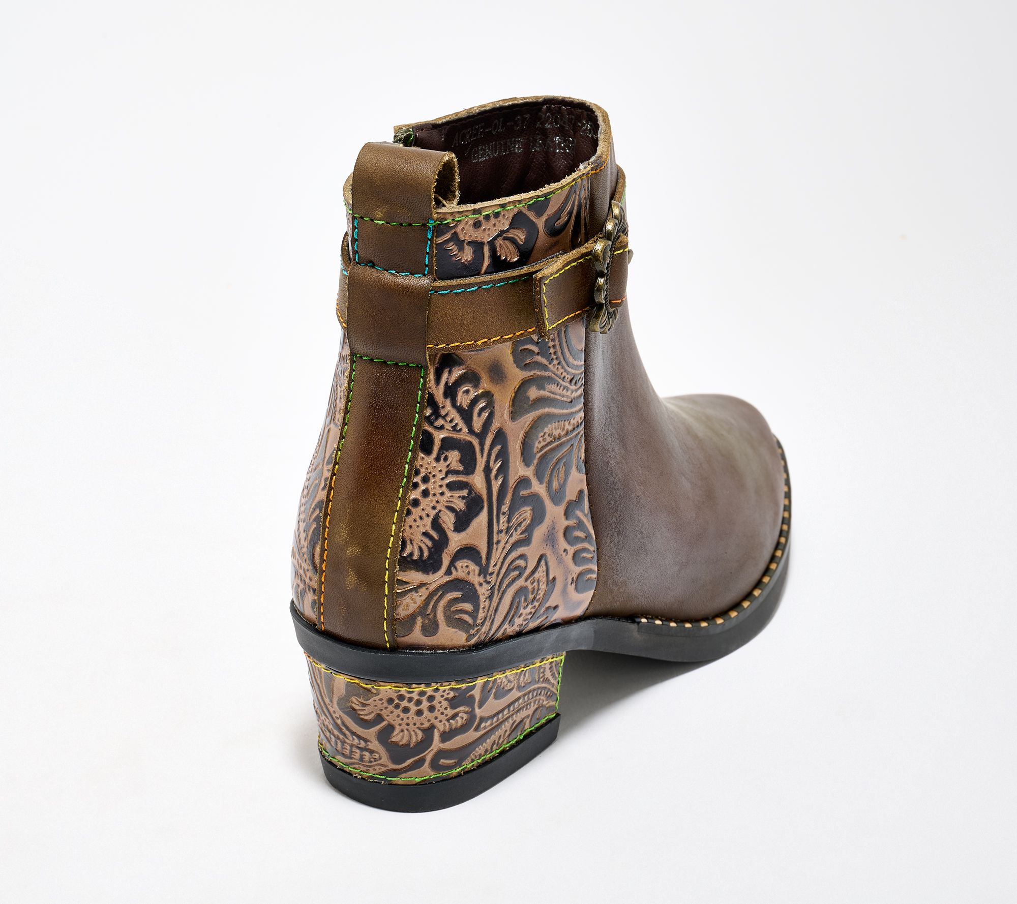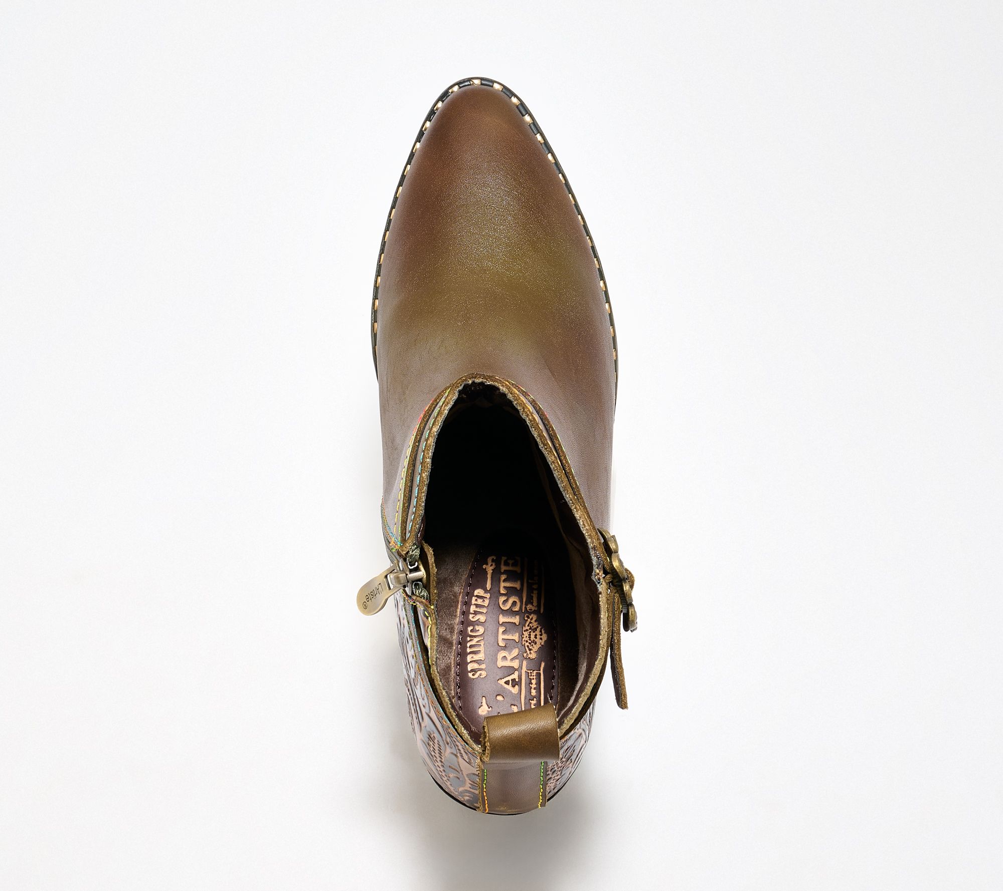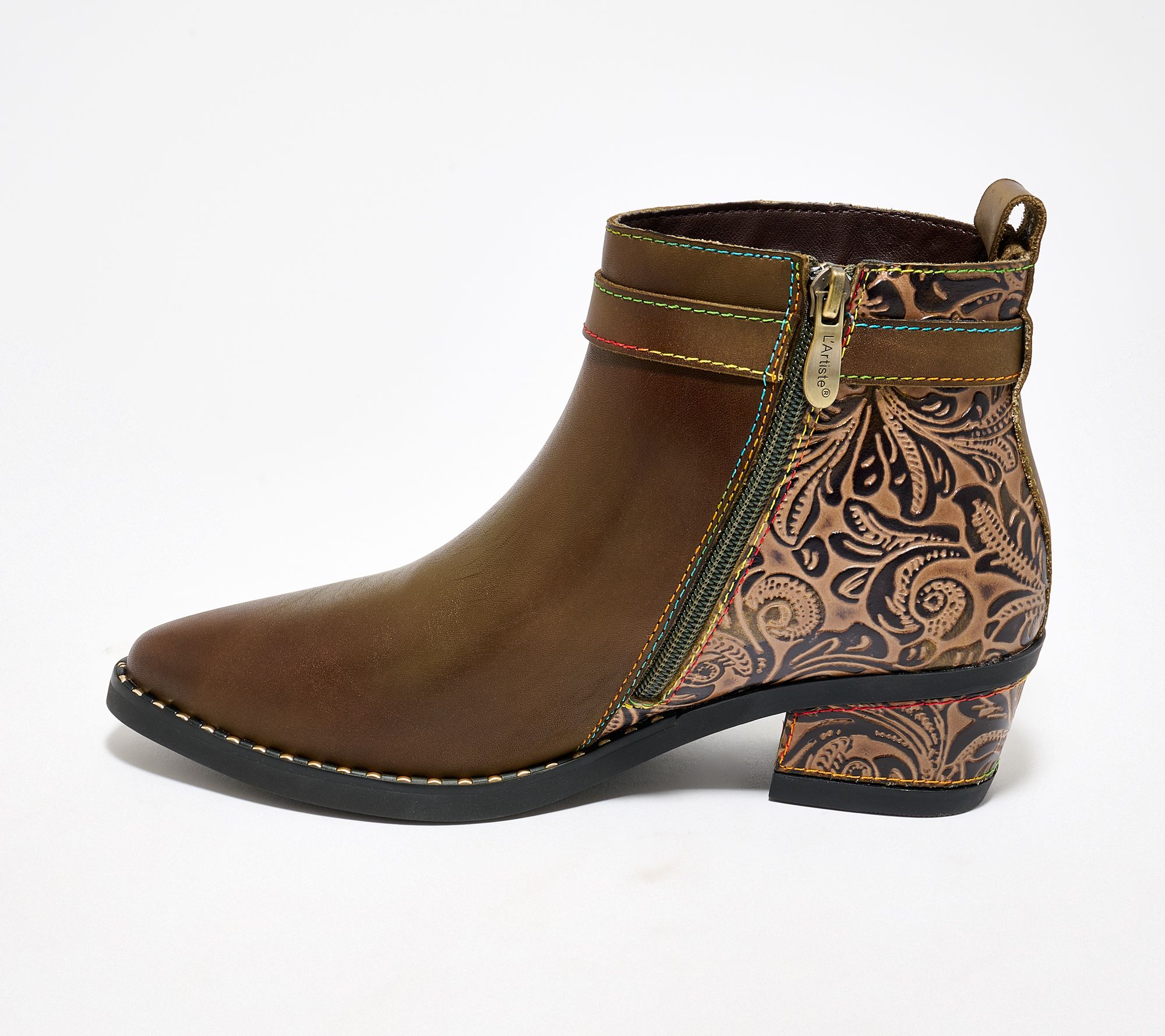 You spend way too much time in your boots to get bored with them. There's no chance of that when you make the Acree leather ankle boot your go-to foundation for fall and winter fashion statements! Embossed floral detailing and antique-style metal embellishments bring the sleek, slightly pointed silhouette to life, while the low stacked heel lends stylish stability to every step. From Spring Step.