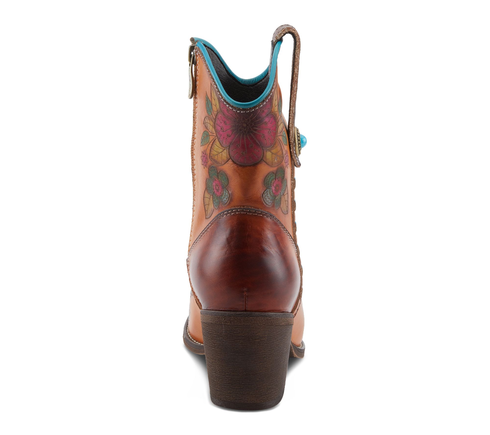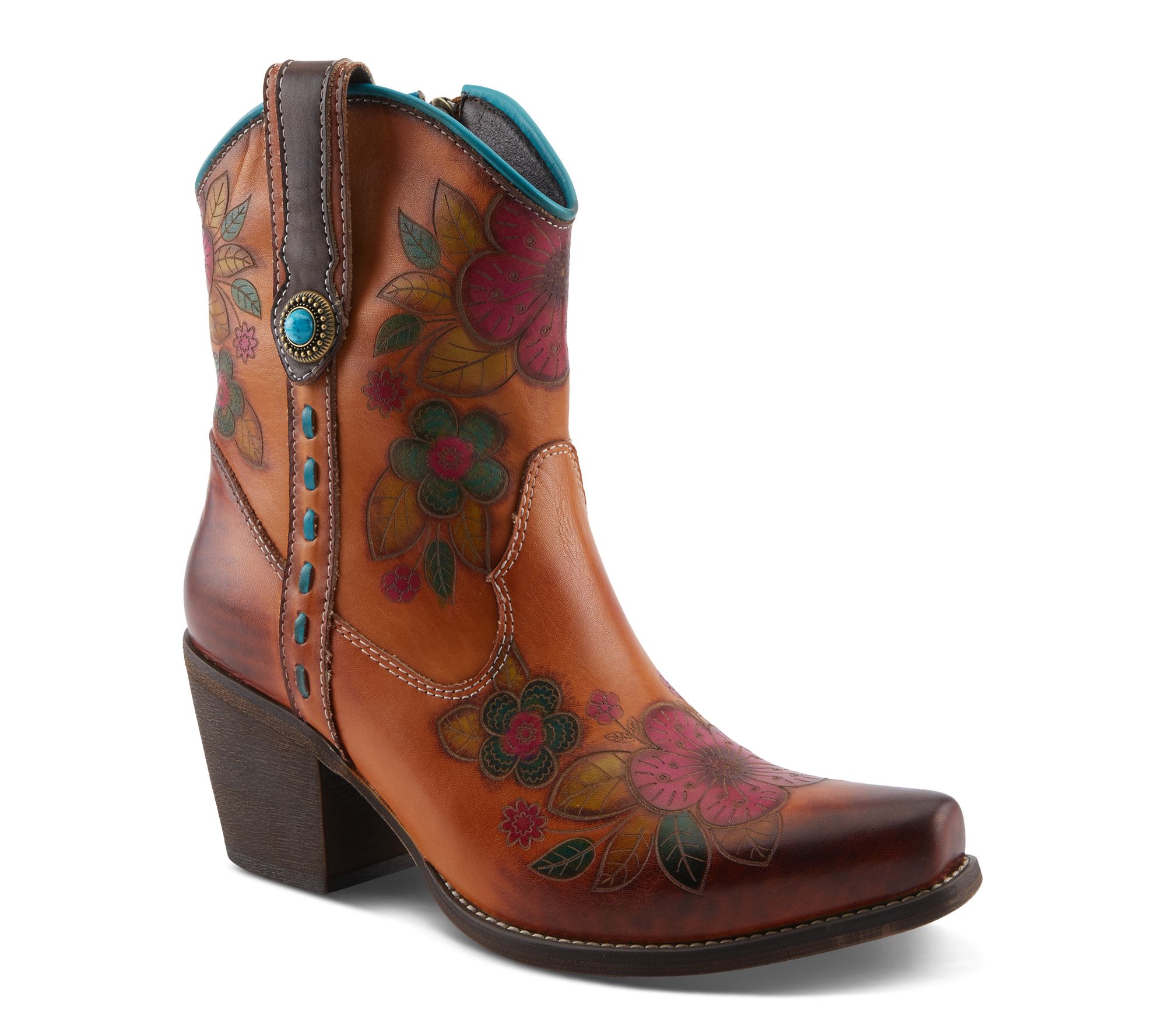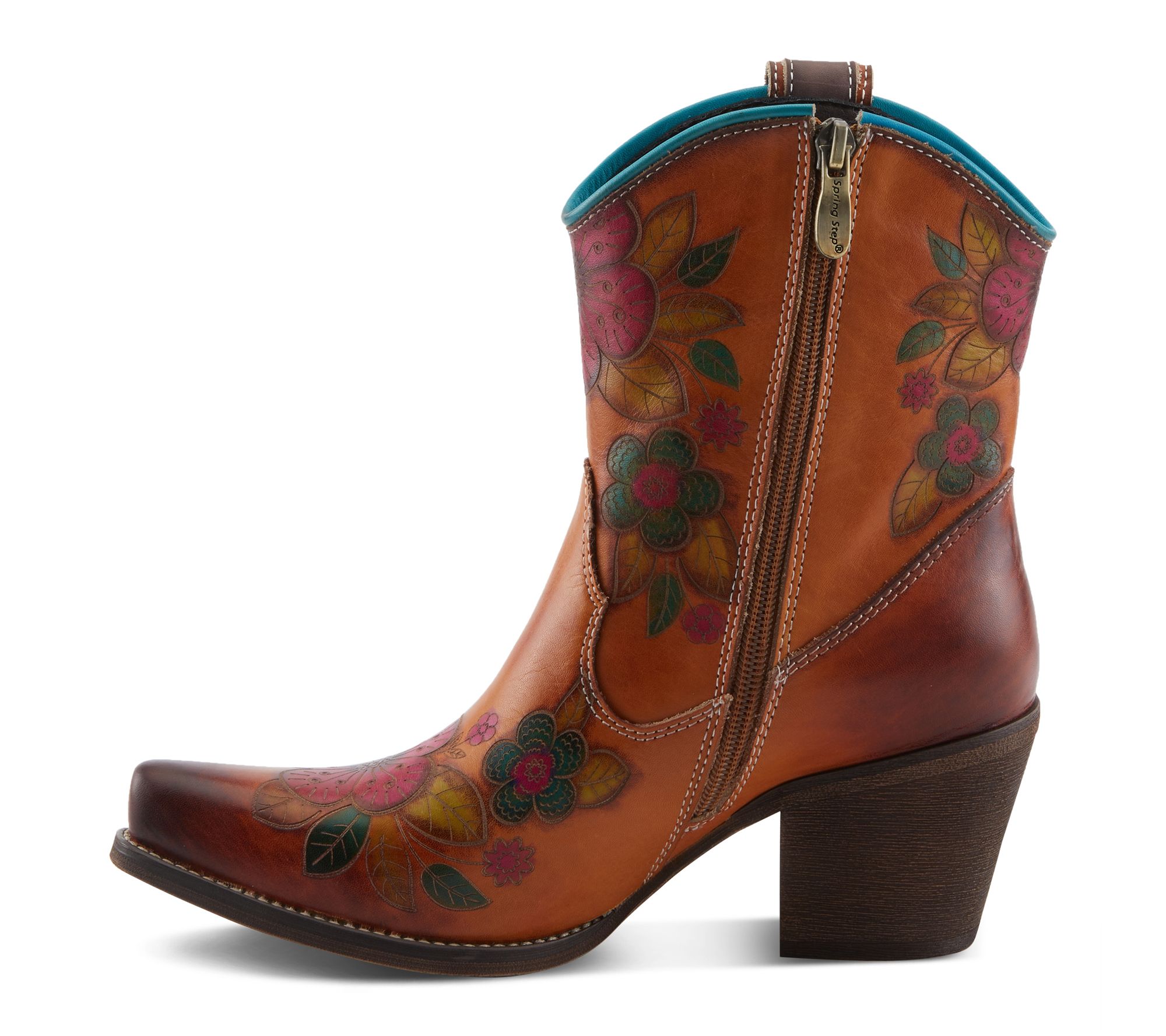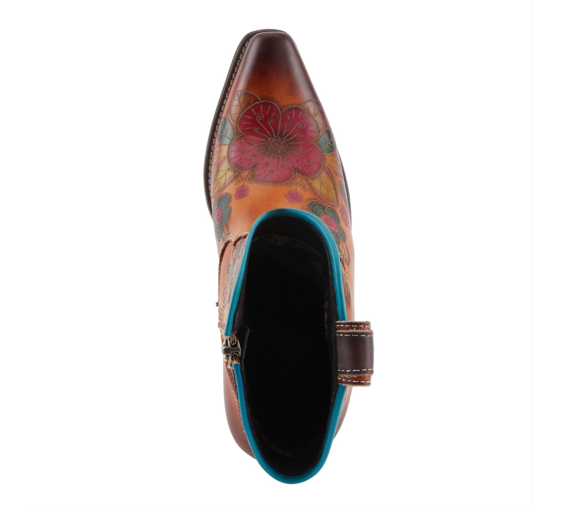 Floral-embossed hand-painted leather upper with Western-inspired stitching, side zipper closure, and pointed toe