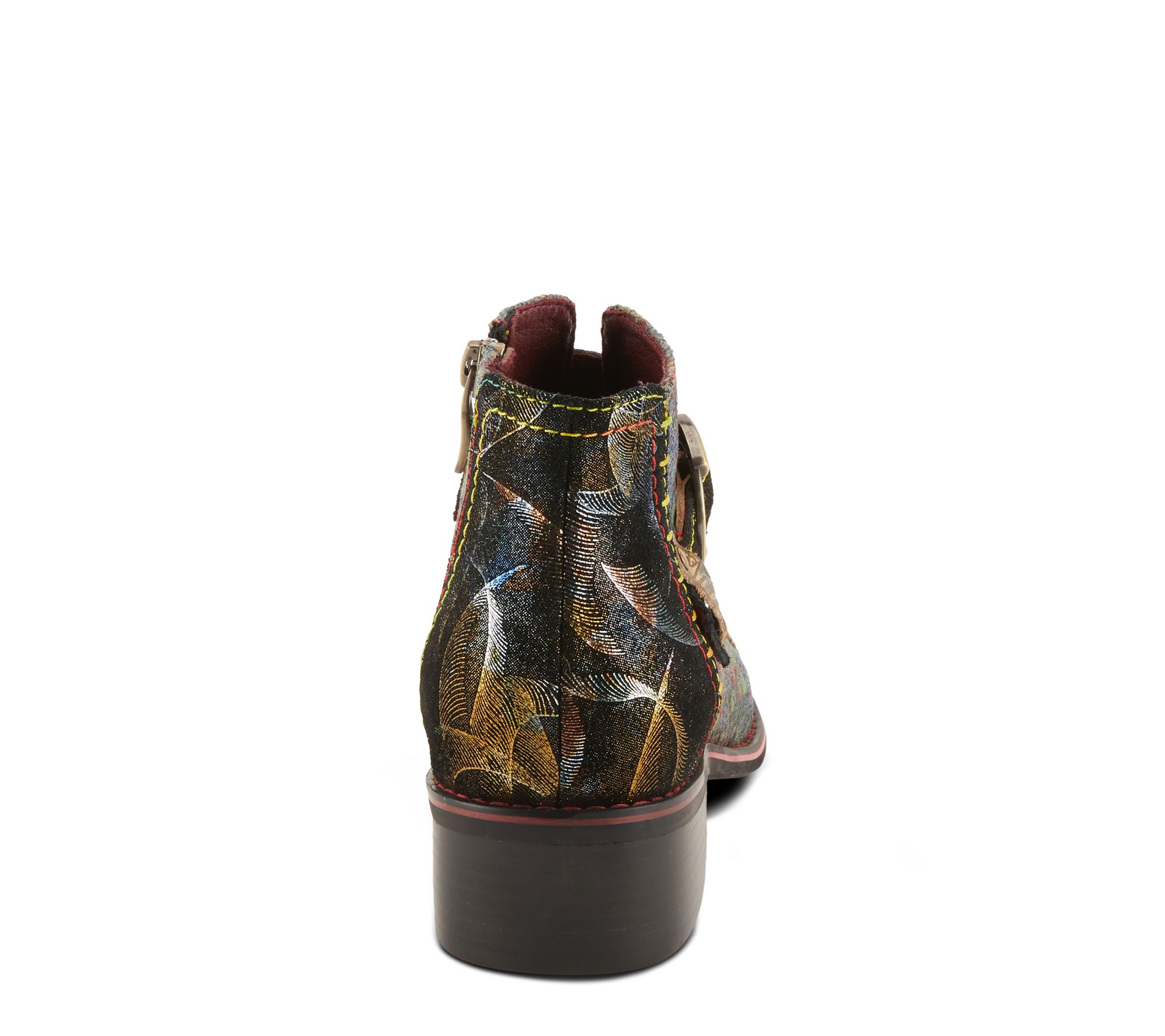 • Side-zip closure, painted design, decorative buckle, rainbow stitching, burnished tapered toe