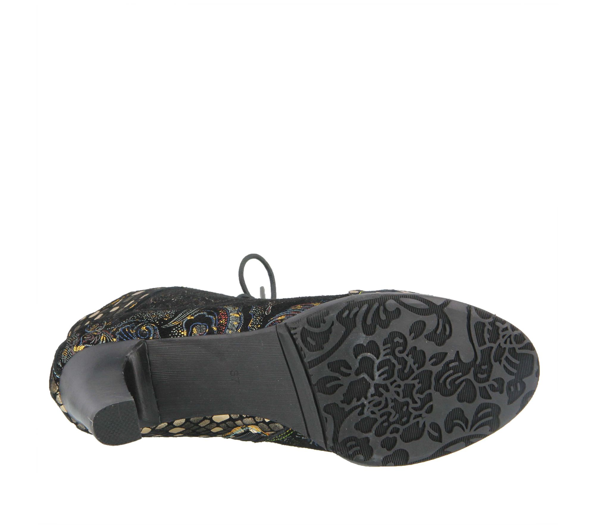 • Tapered toe, side zip, lace-up closure, metallic pattern, floral print, rainbow stitching