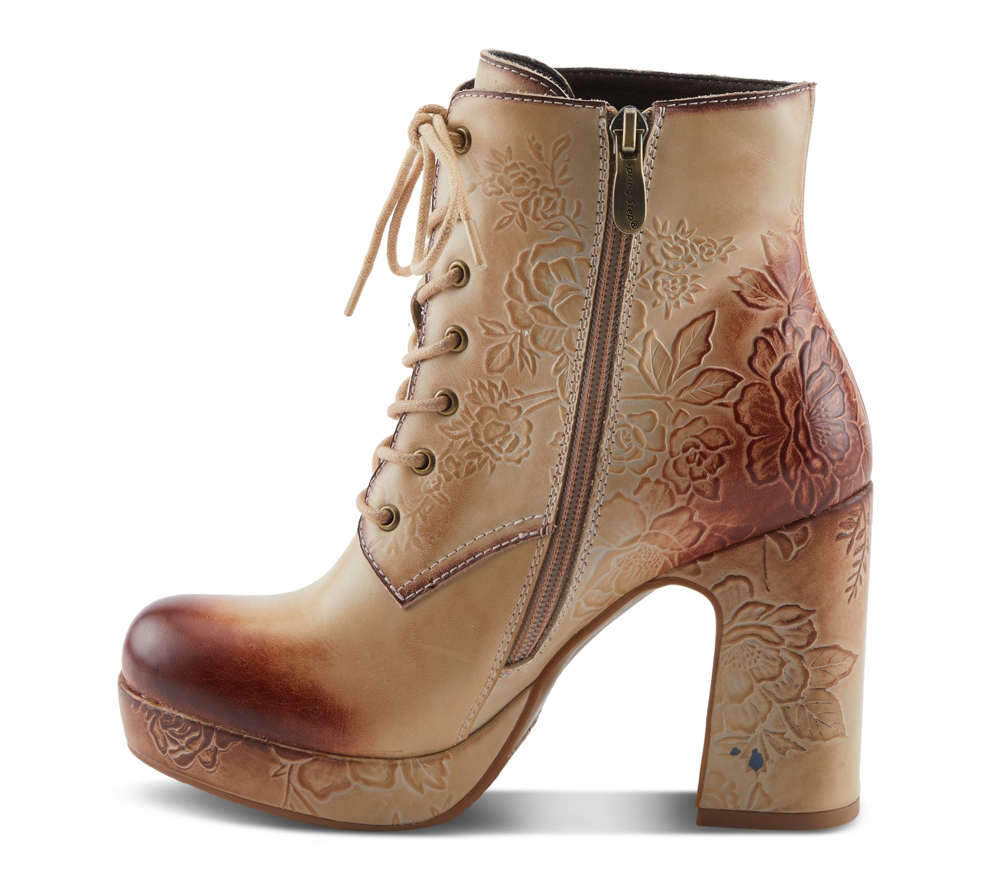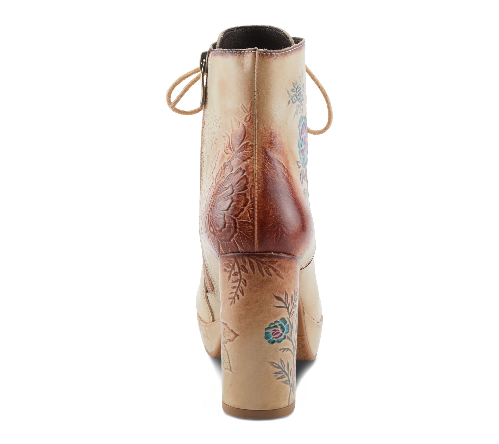• Hand-painted floral embossing; lace-up and side zipper closure; rounded toe; baroque-inspired platform design; cushioned insole for comfort