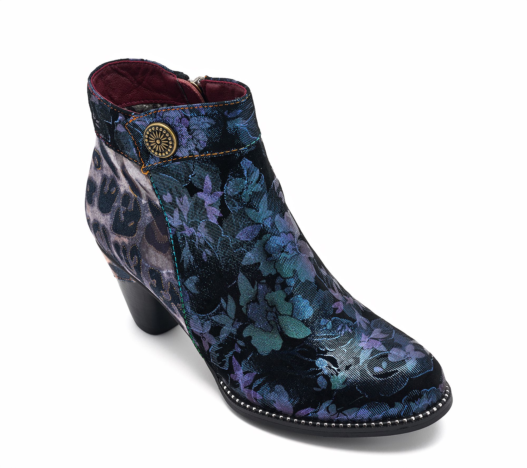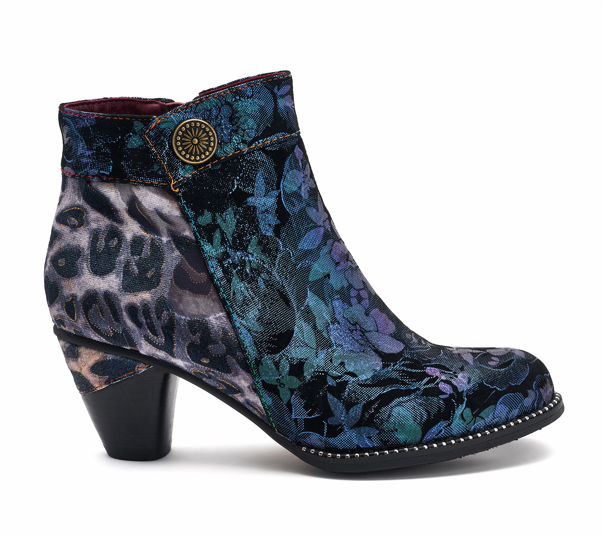 Floral-printed suede and animal-print velvet upper, decorative button accent, inside zipper closure, round toe