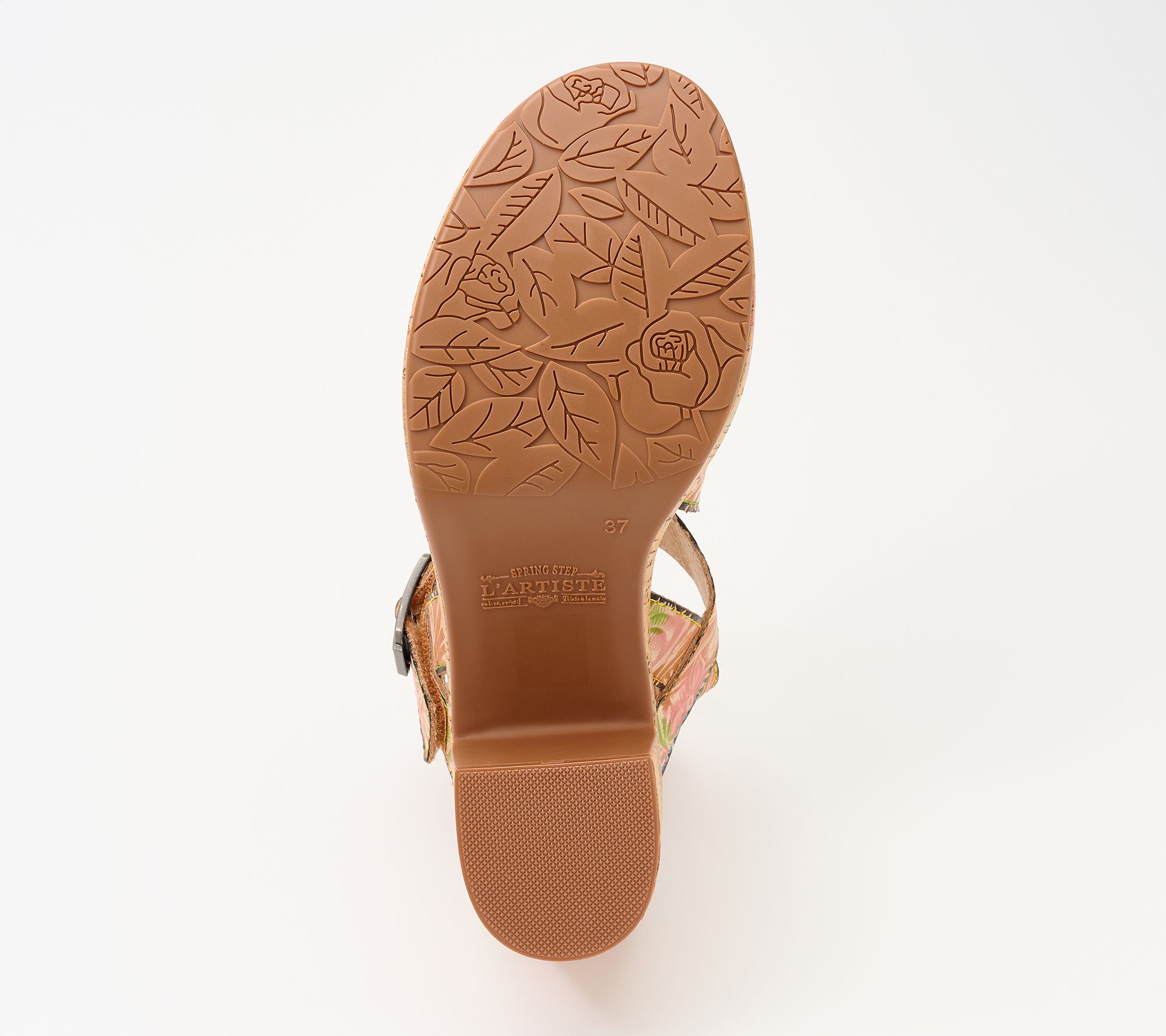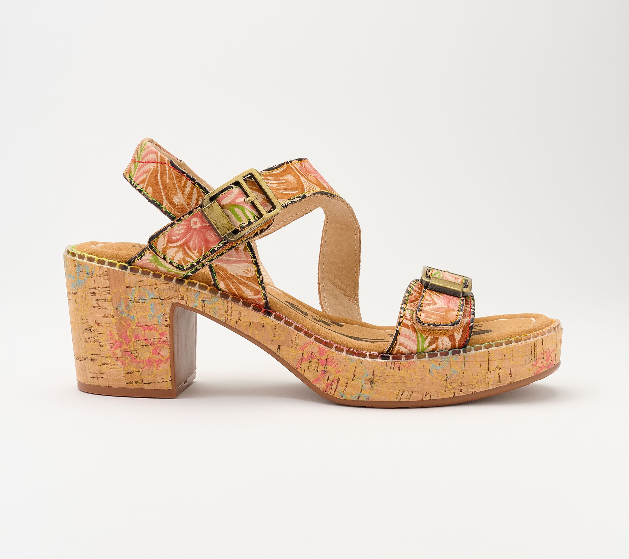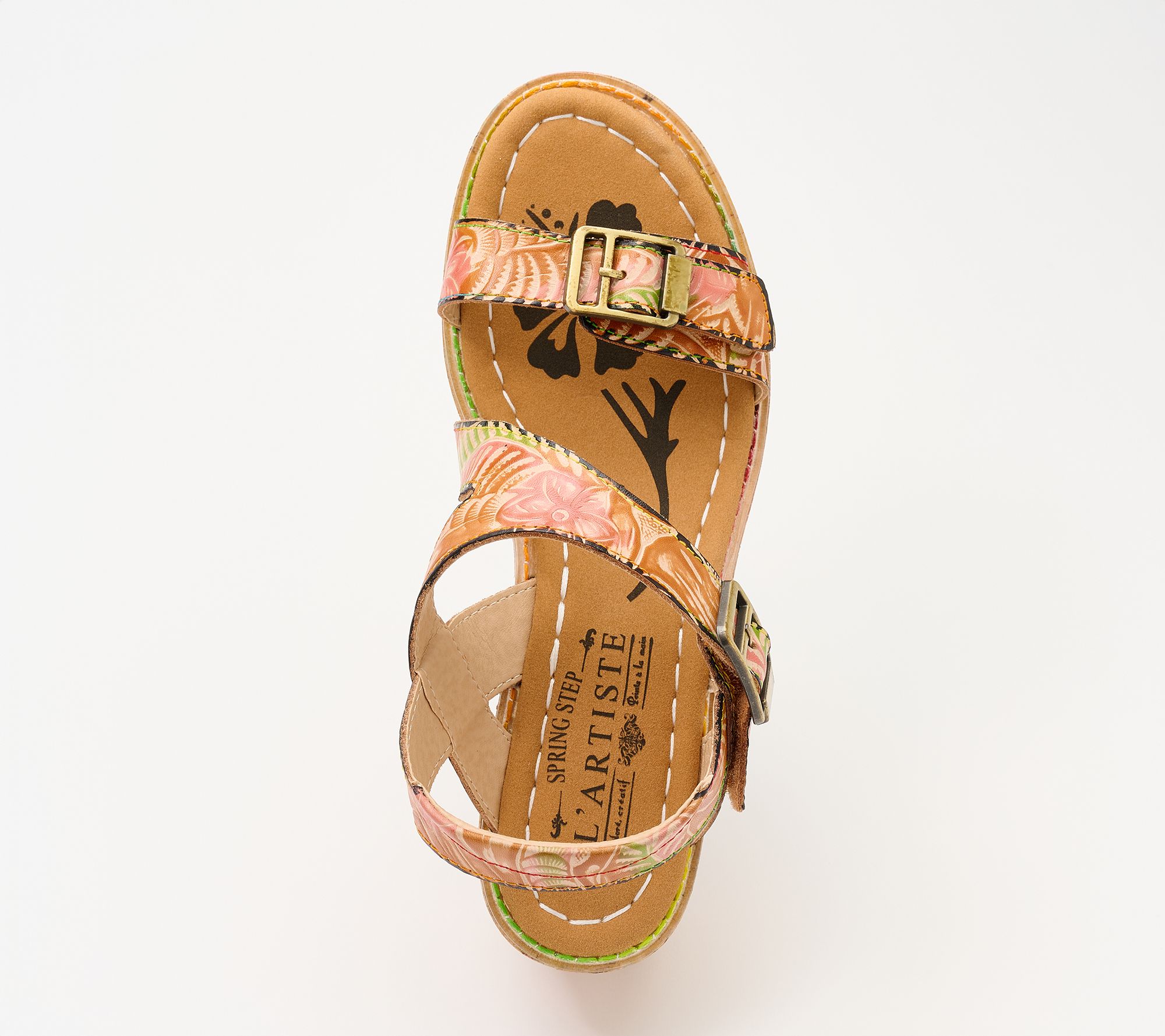 Embossed leather upper with floral motifs, two adjustable straps, antiqued brasstone buckle closures