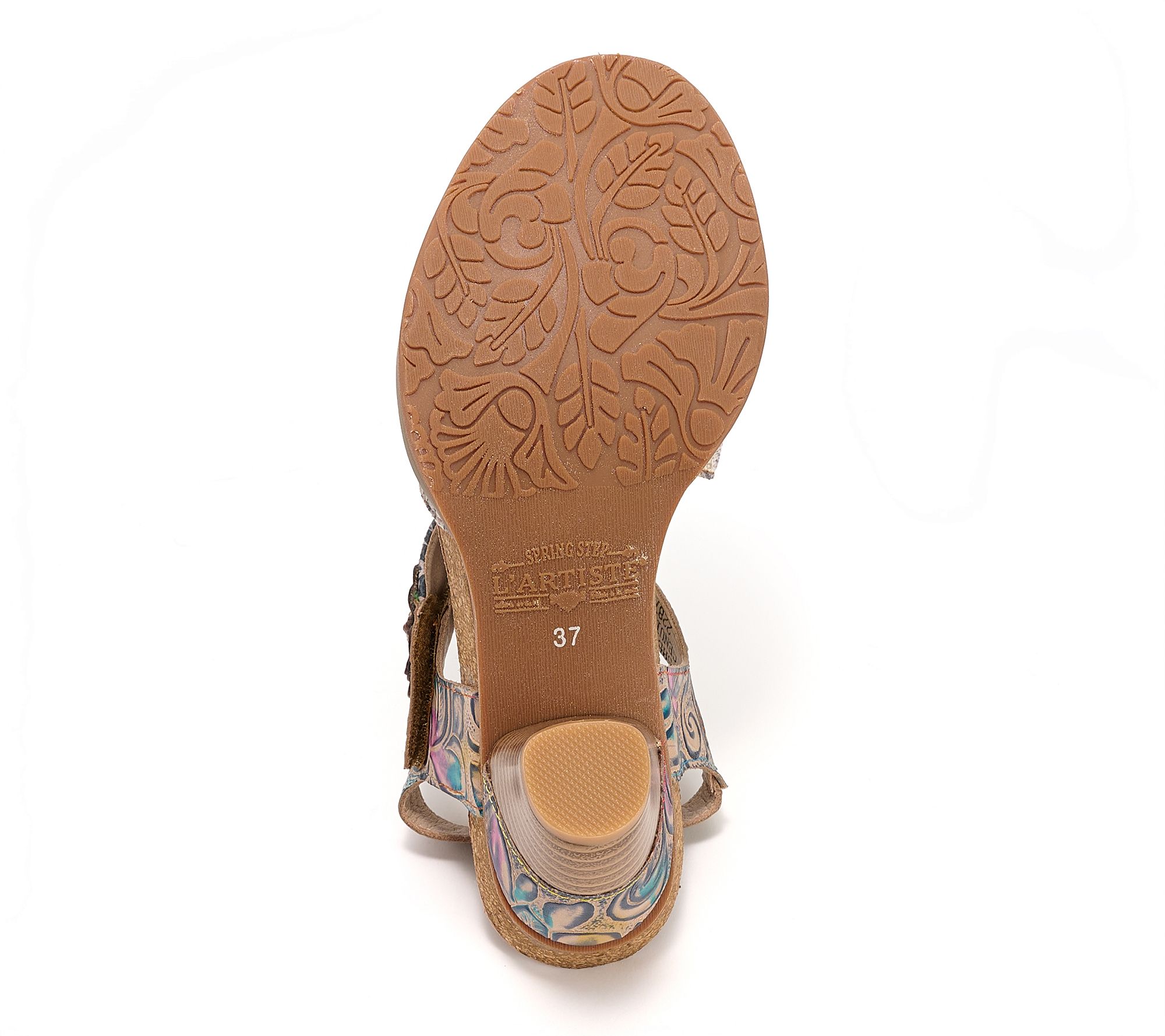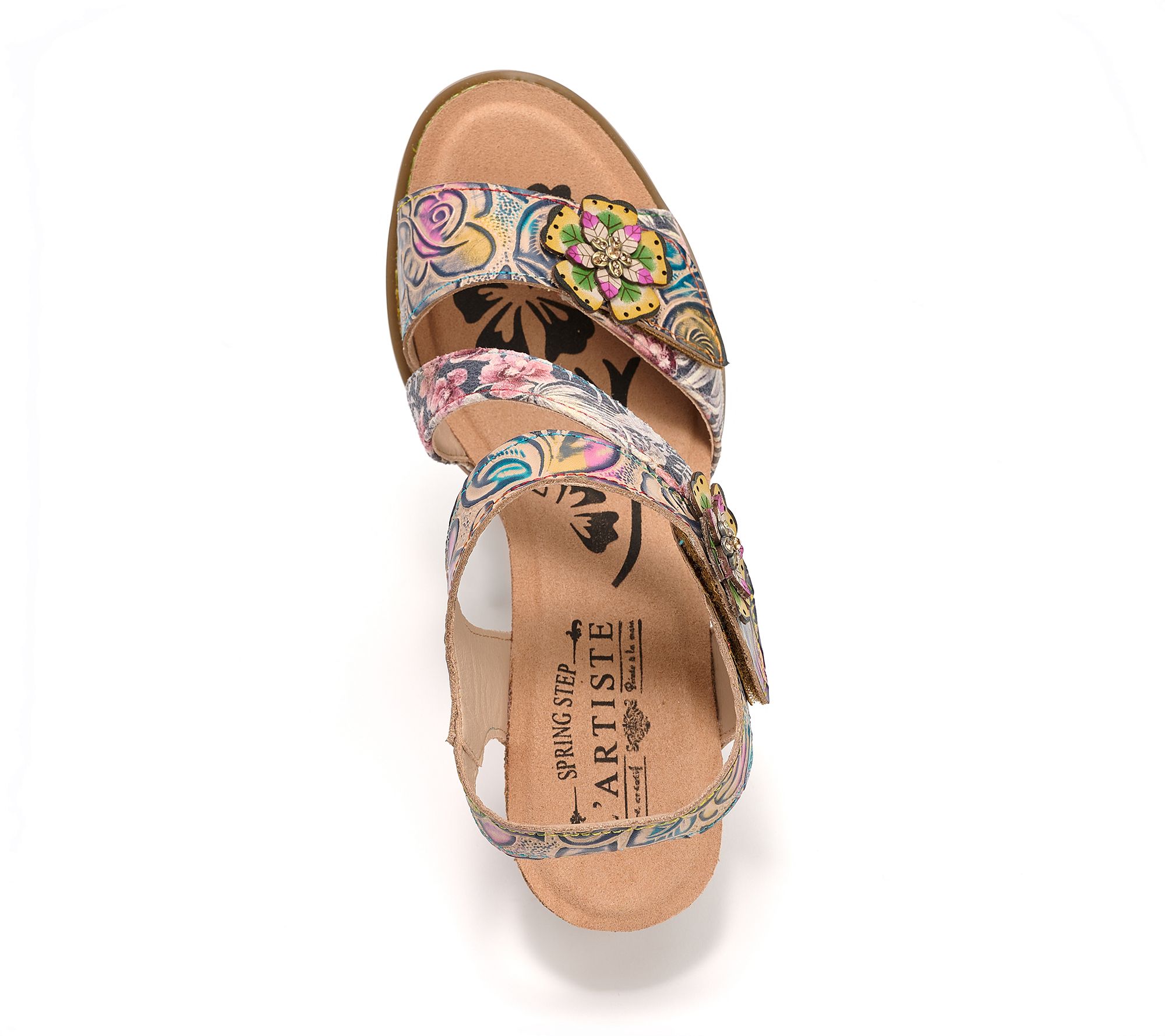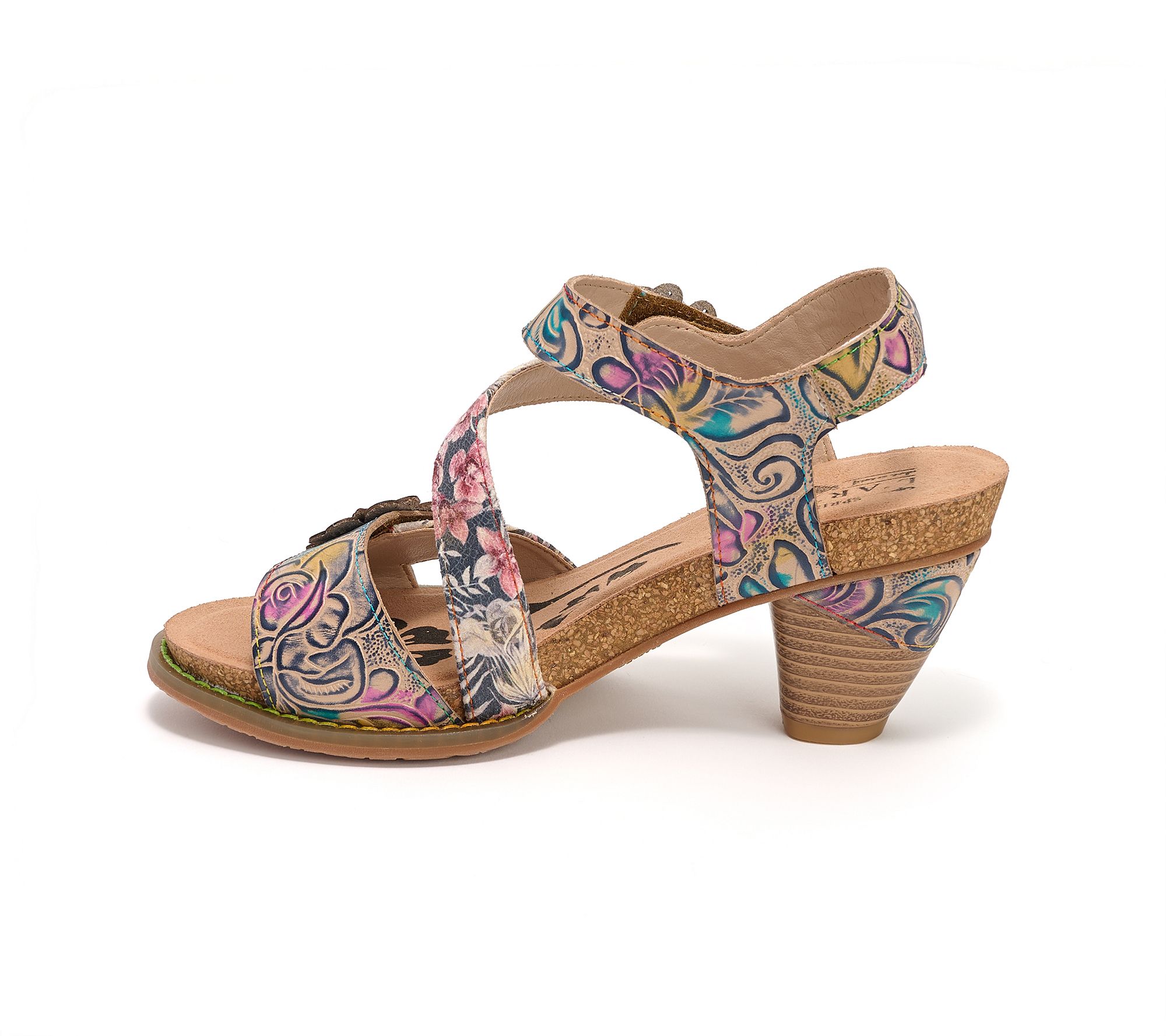 L'Artiste by Spring Step Leather Heeled Sandals - Shesfab Leather sandal features embossed and printed leather straps with hook and loop adjustability, a cork midsole with a softly cushioned insole, and a sculpted heel with embossed floral and faux wood-like texture. Heel Height: 3 1/4 in. Sole Thickness: 3/4 in. COO: Imported. Fits true to size. Content: Leather Upper, Rubber Outsole. Footbed not removable.