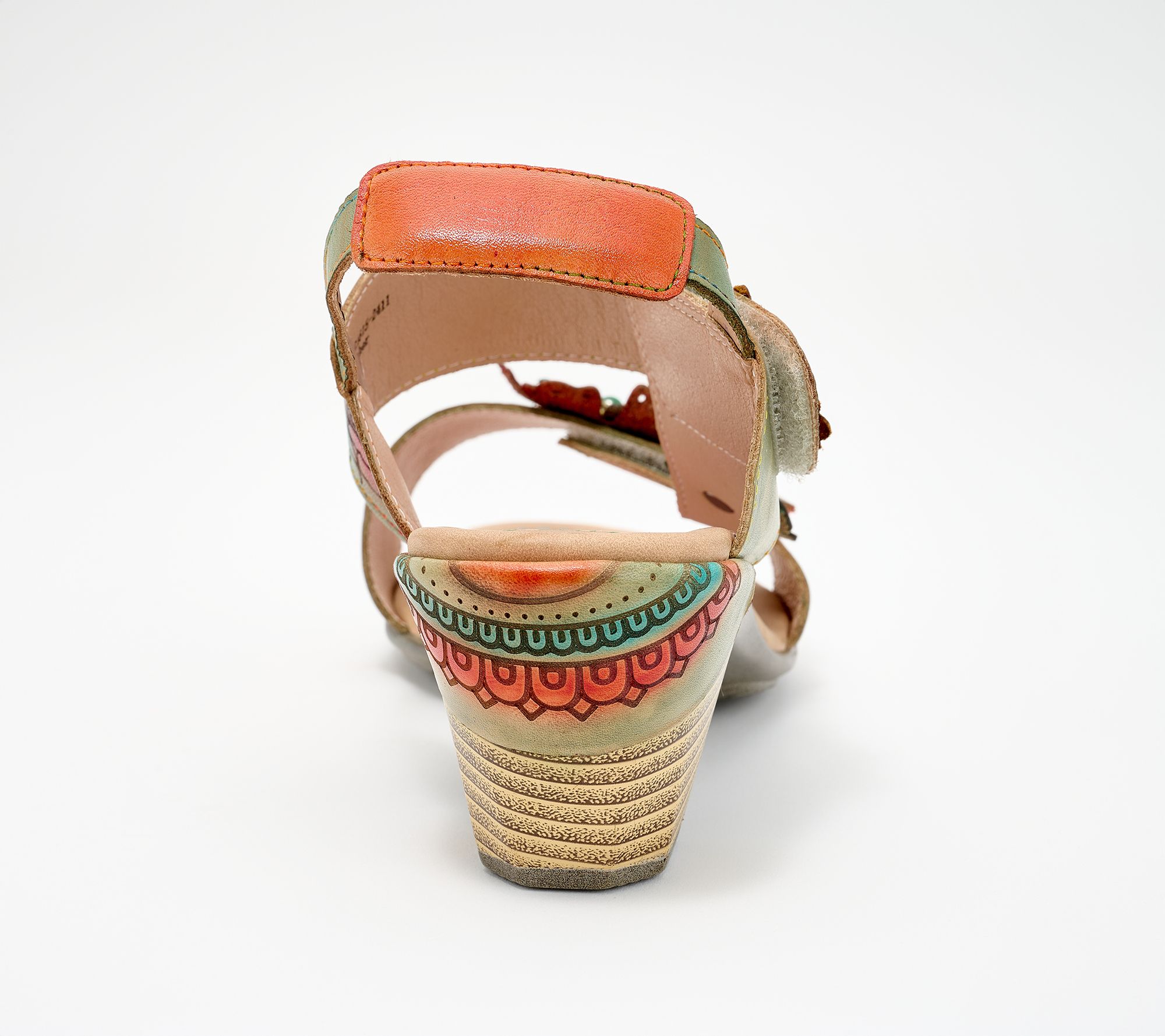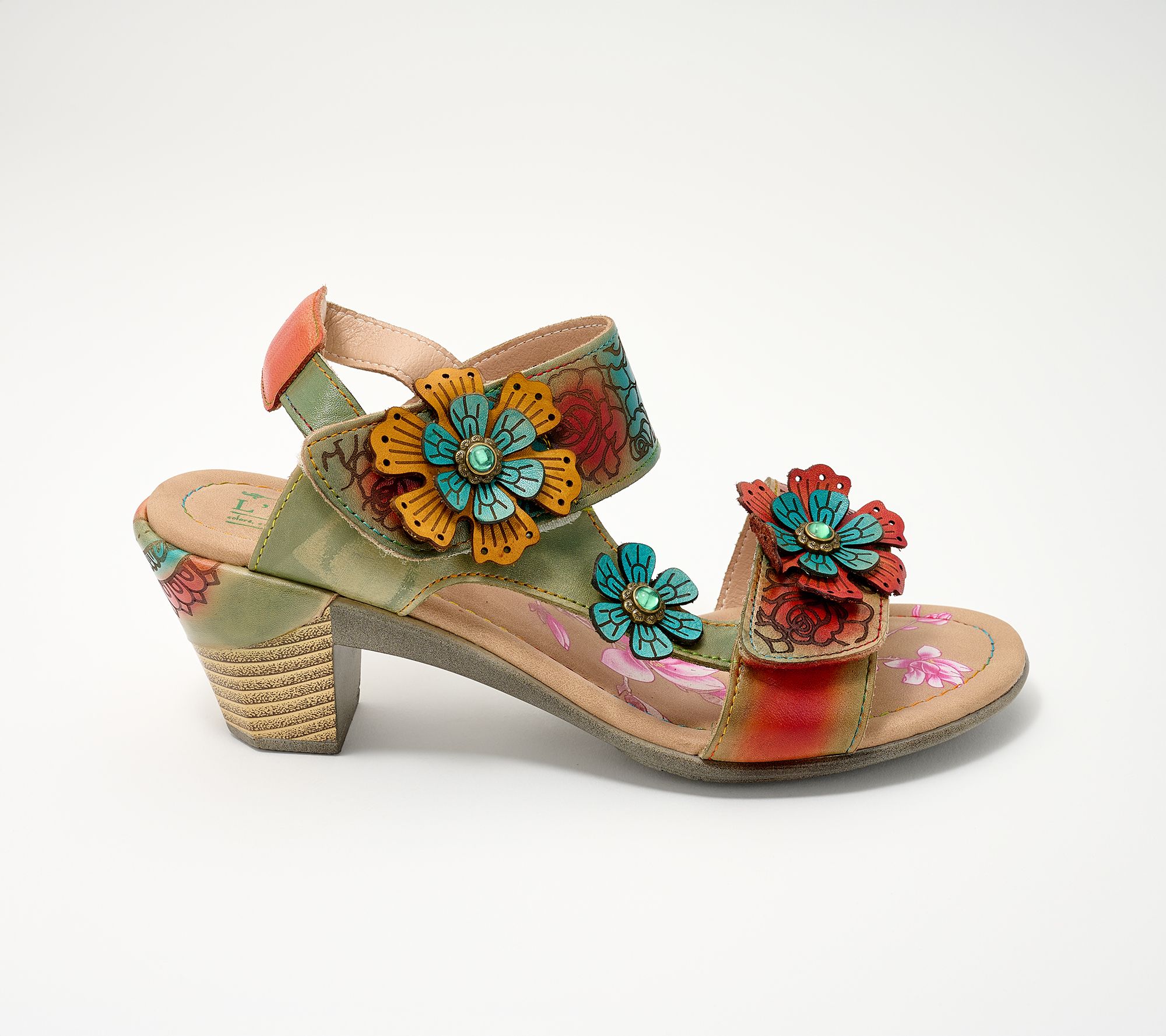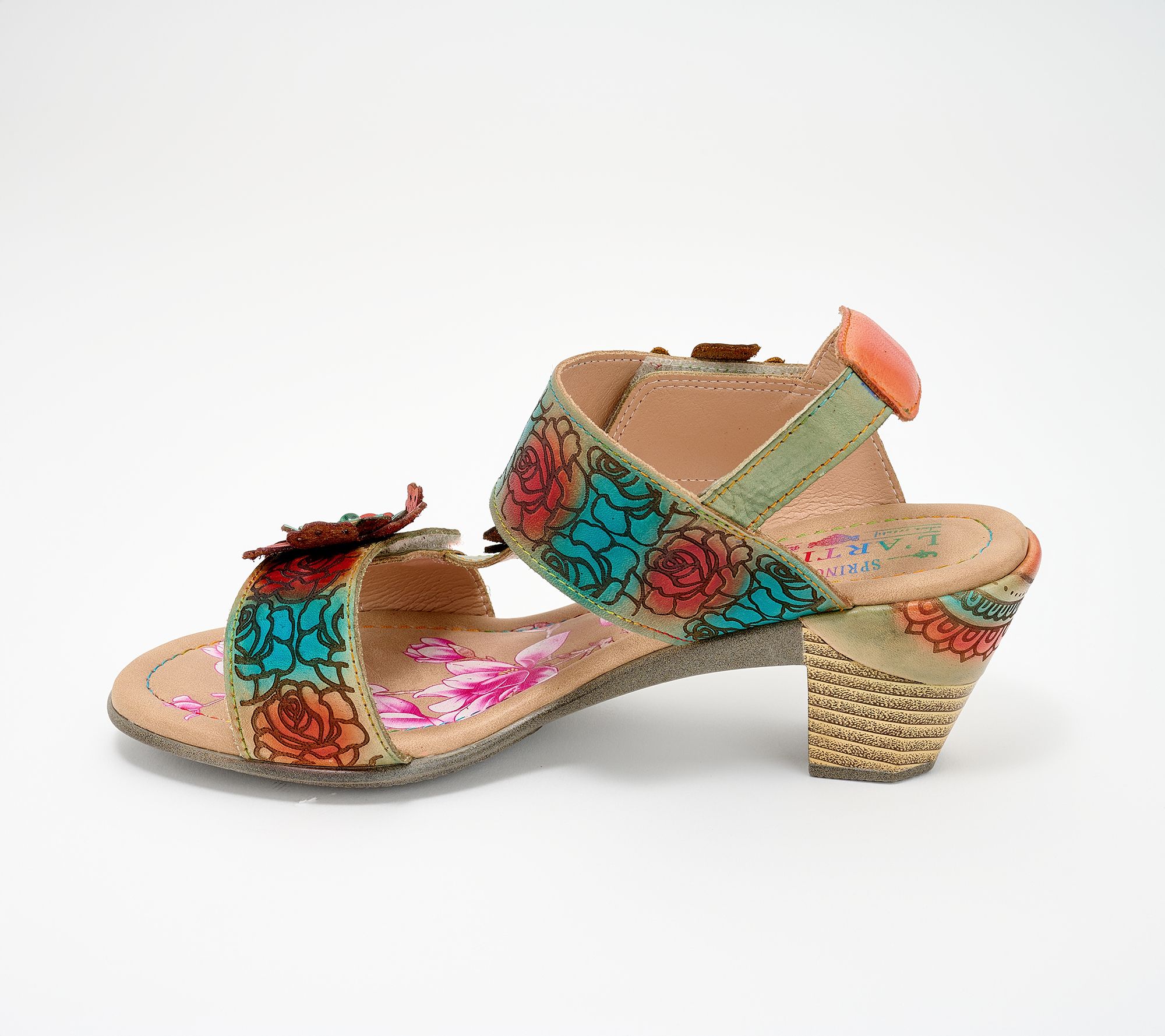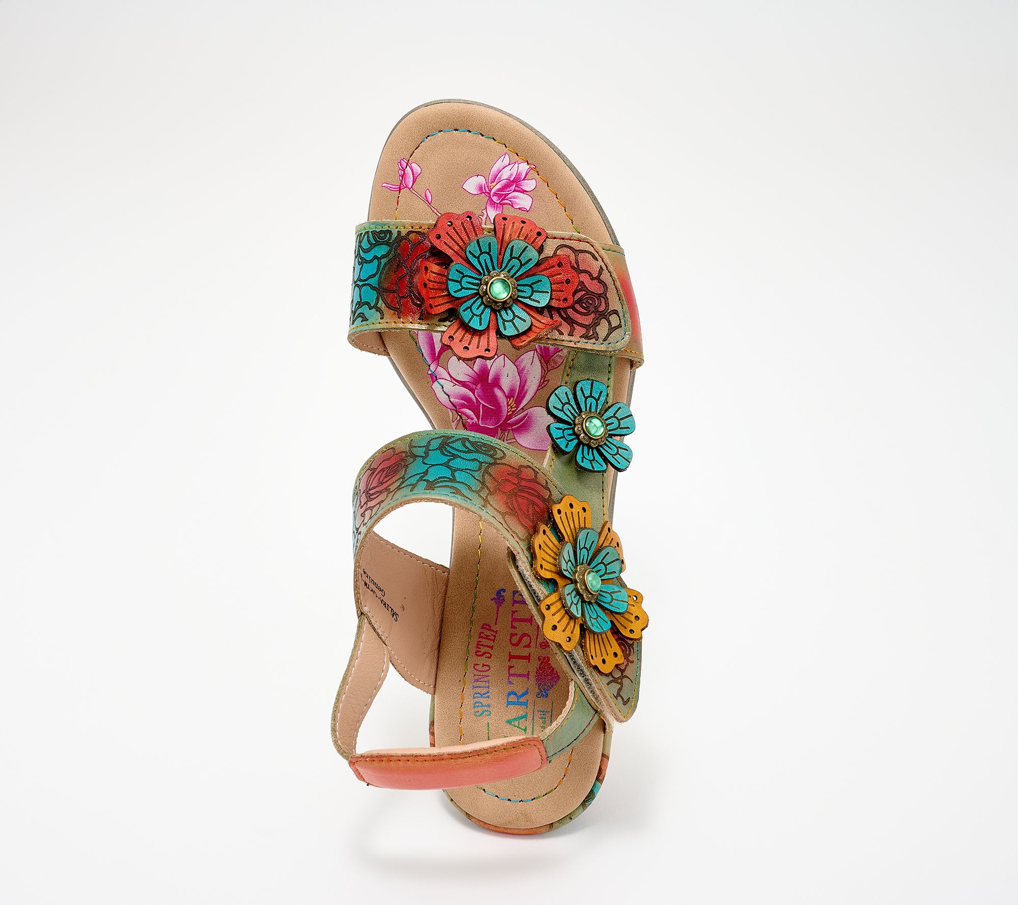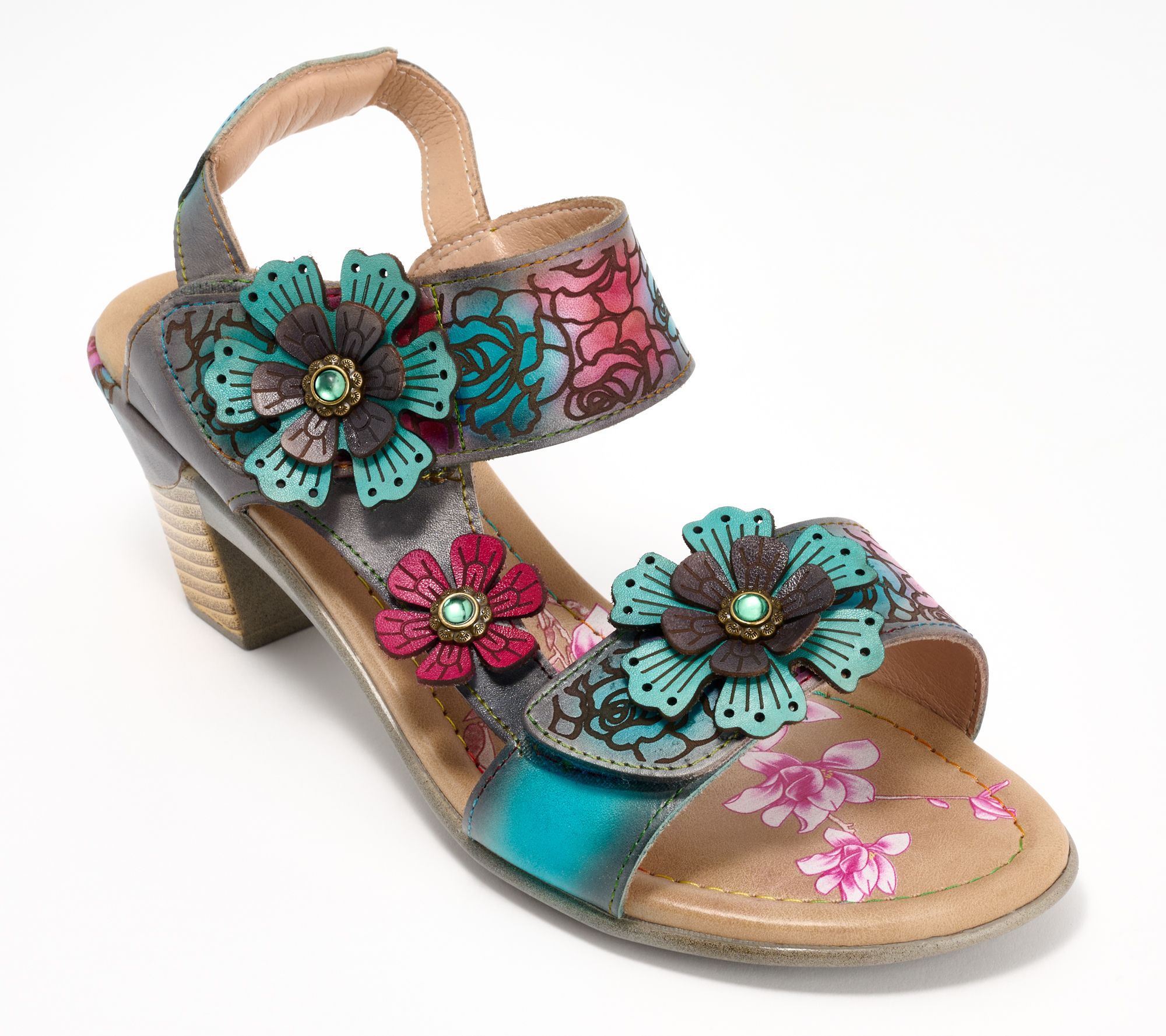 Etched floral embellishments, padded back collar, adjustable hook-and-loop toe and ankle straps