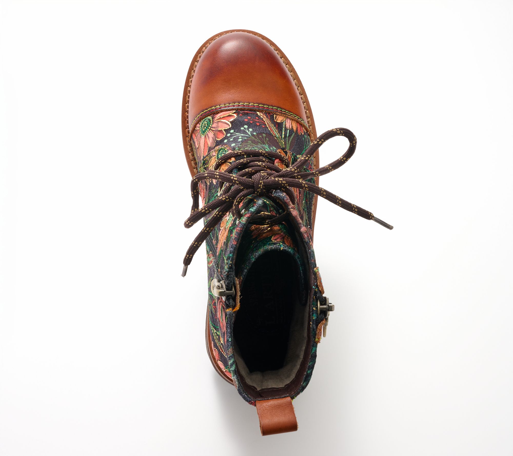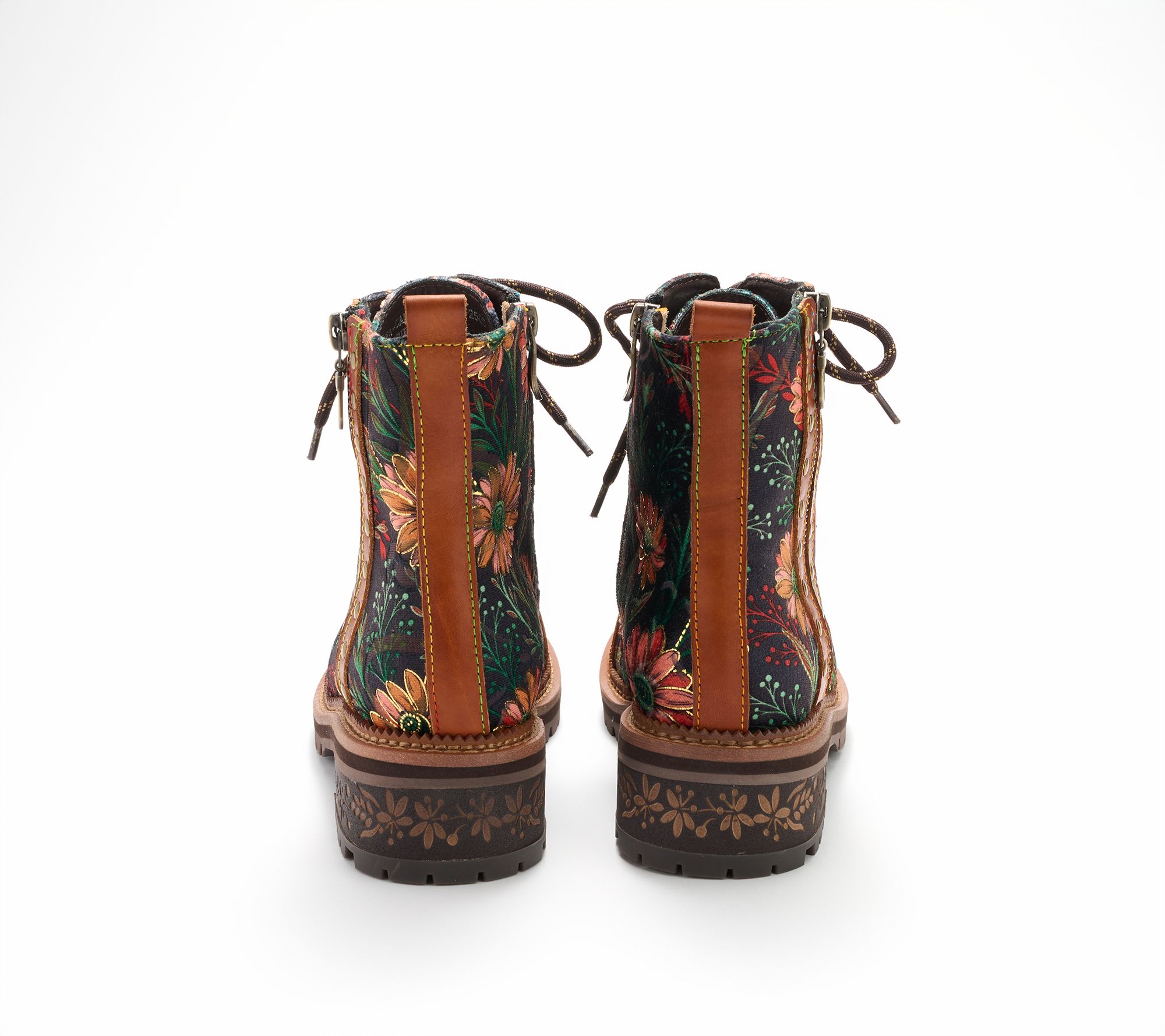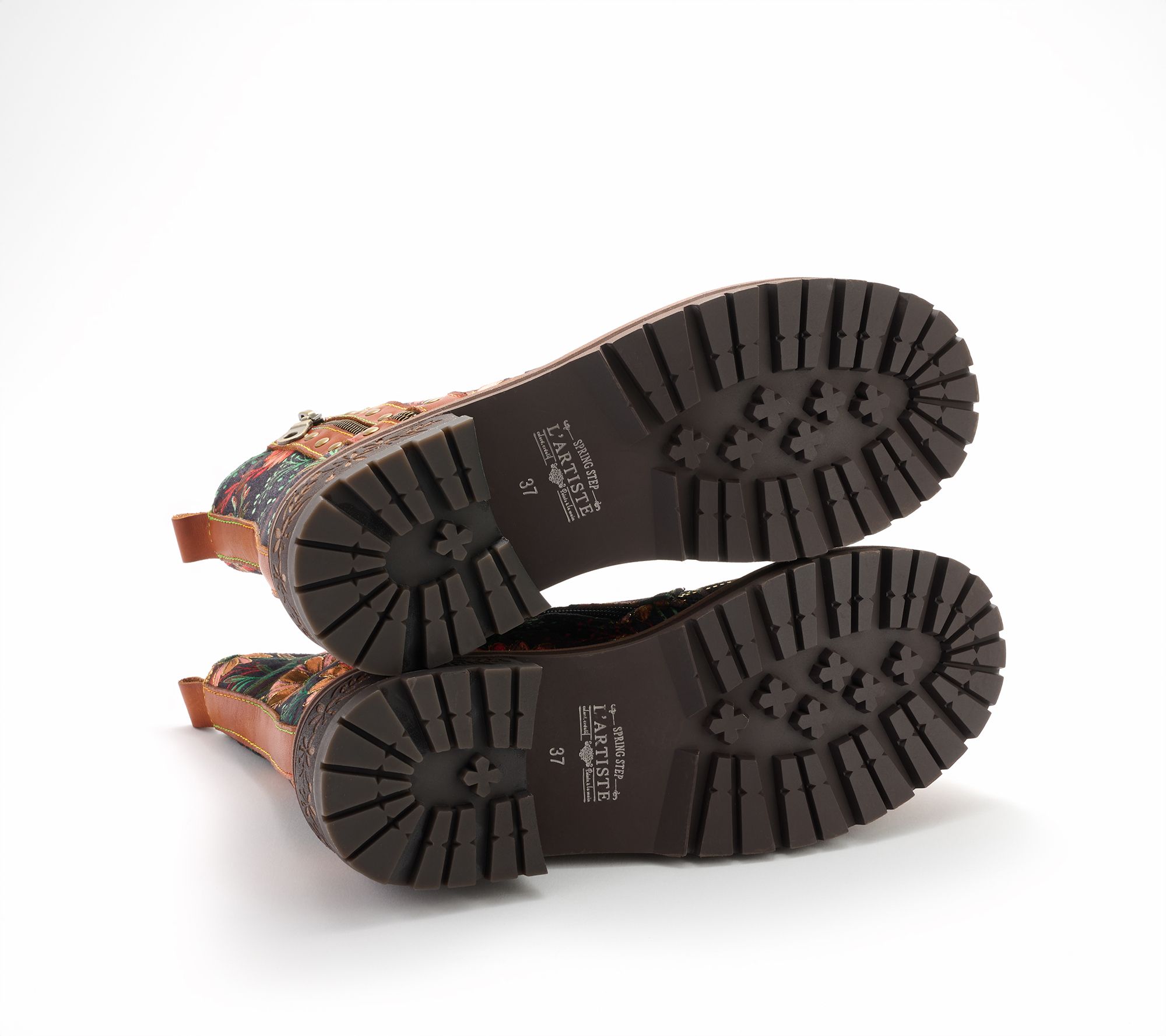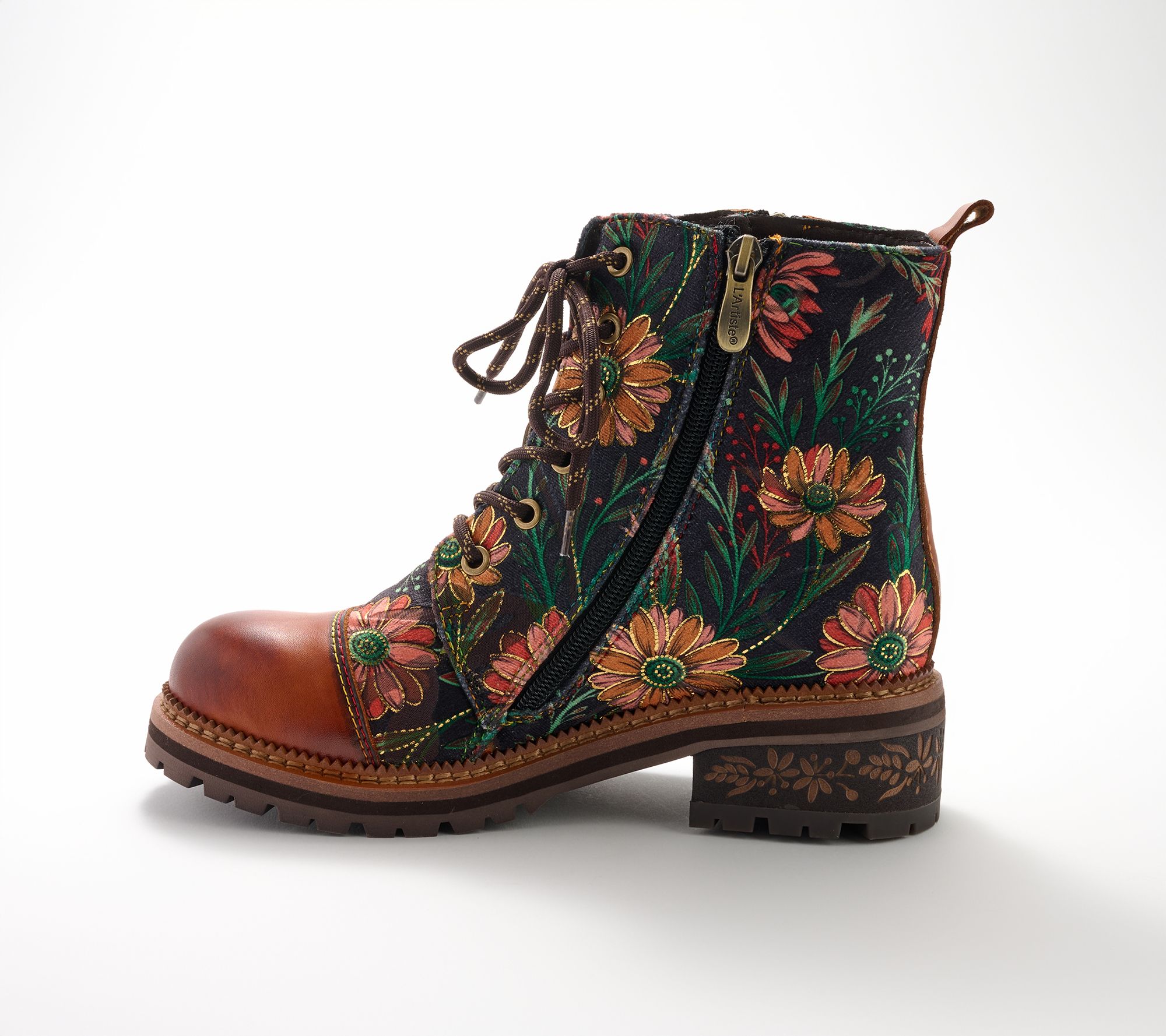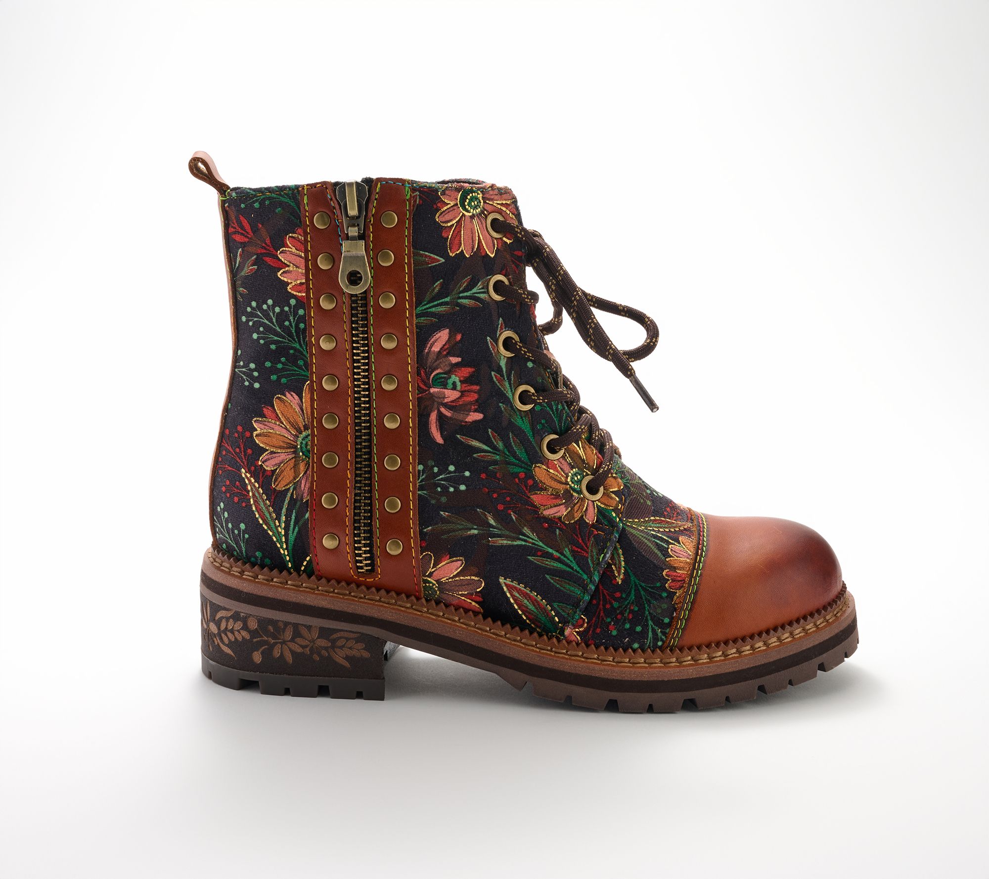 Step confidently into cool-weather style with these lace-up boots, featuring a striking combination of leather and textile adorned by vibrant rainbow stitching and floral embroidery. Studded accents and etched heel details bring a touch of artistry, while the rugged lug sole provides stability for everyday adventures. From Spring Step.