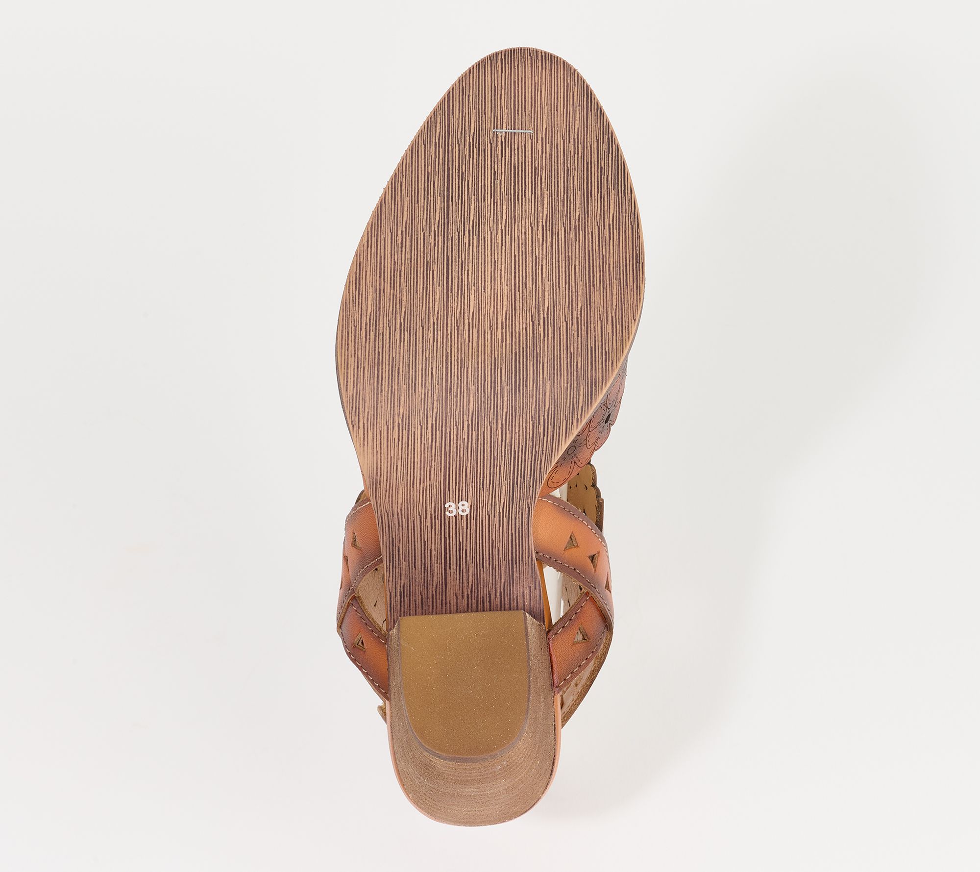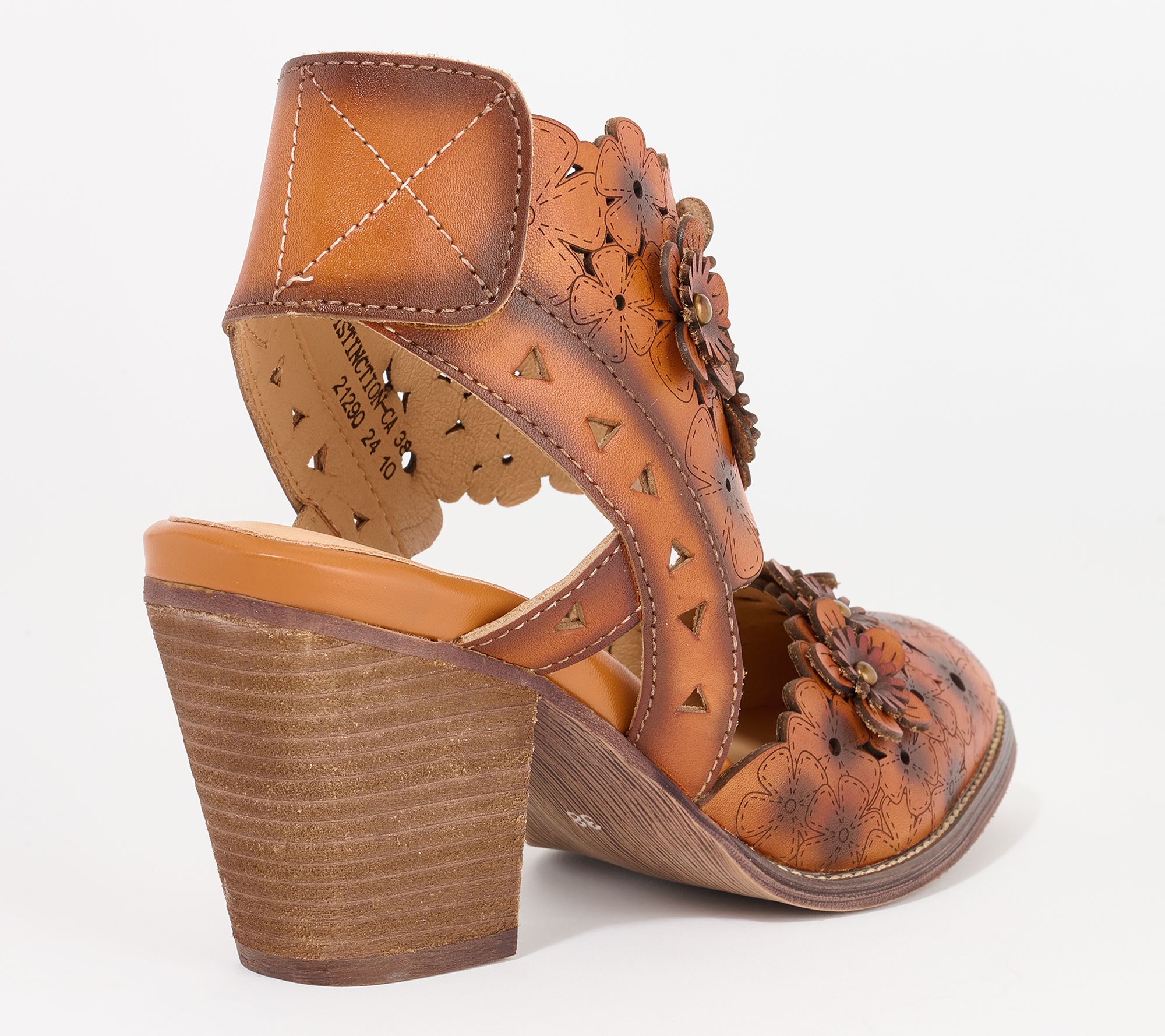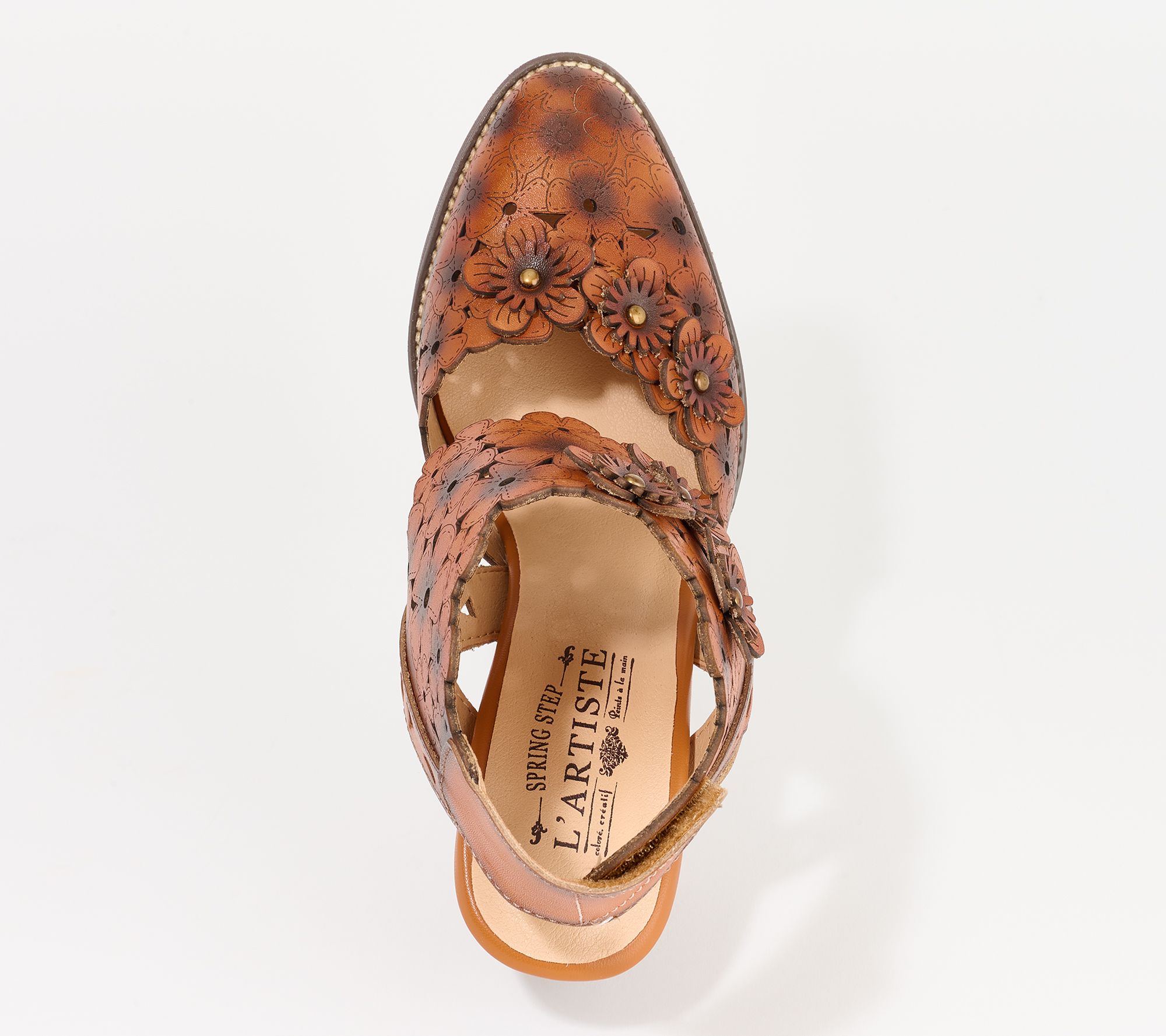 French-inspired floral laser cutouts and etching pattern, adjustable hook-and-loop strap, floral applique, closed toe