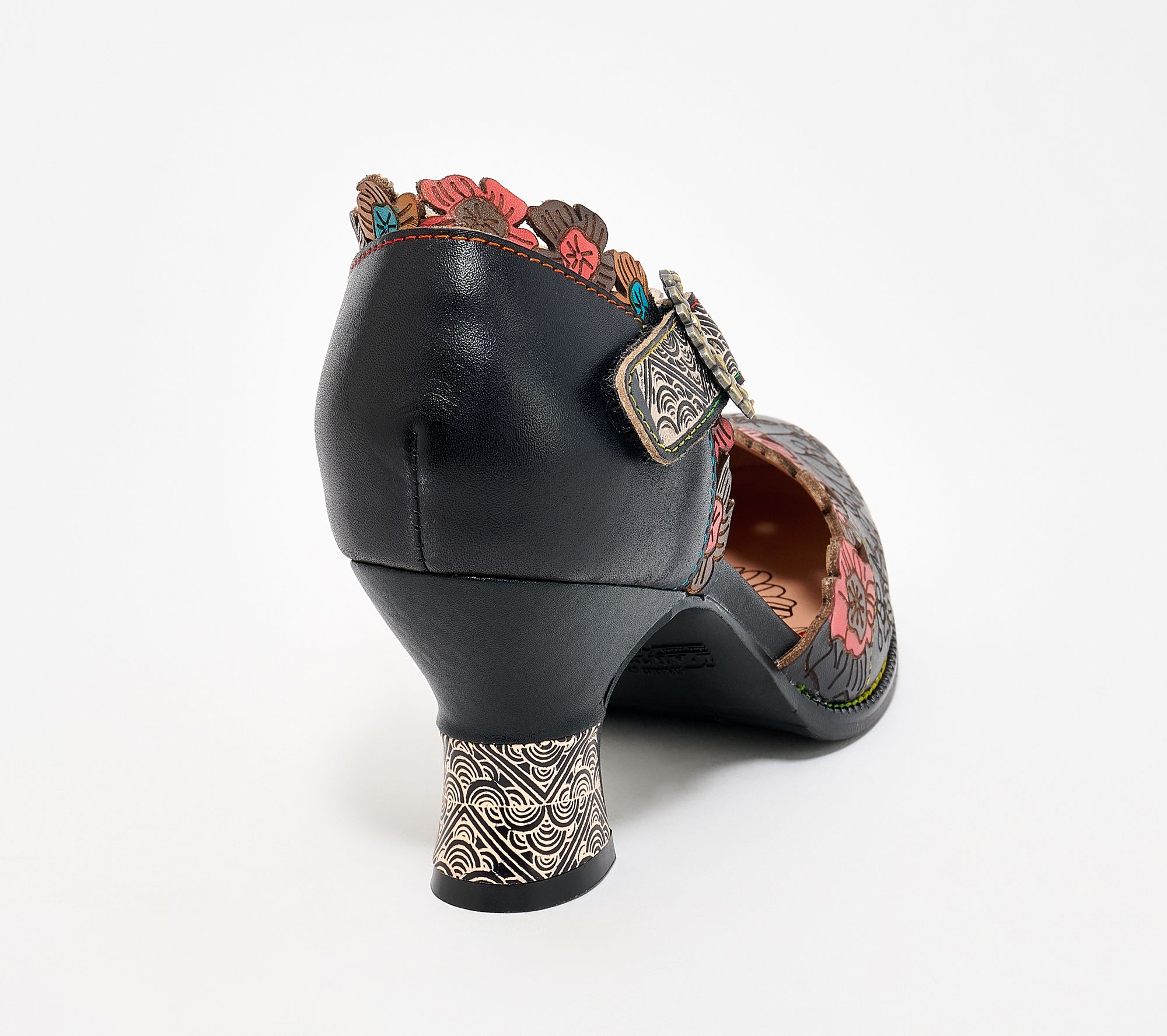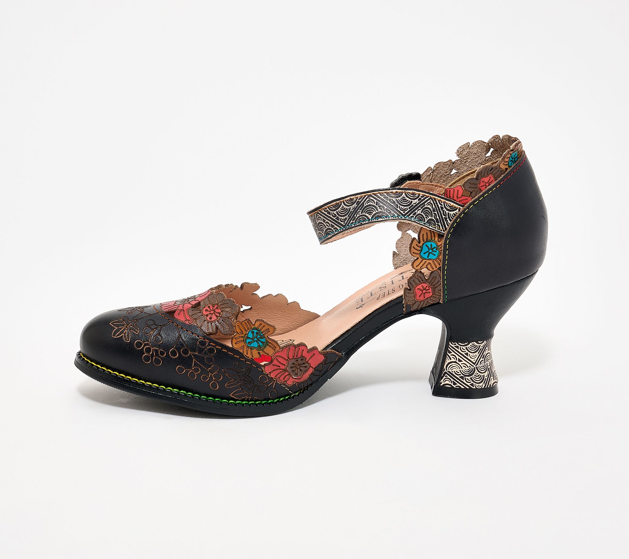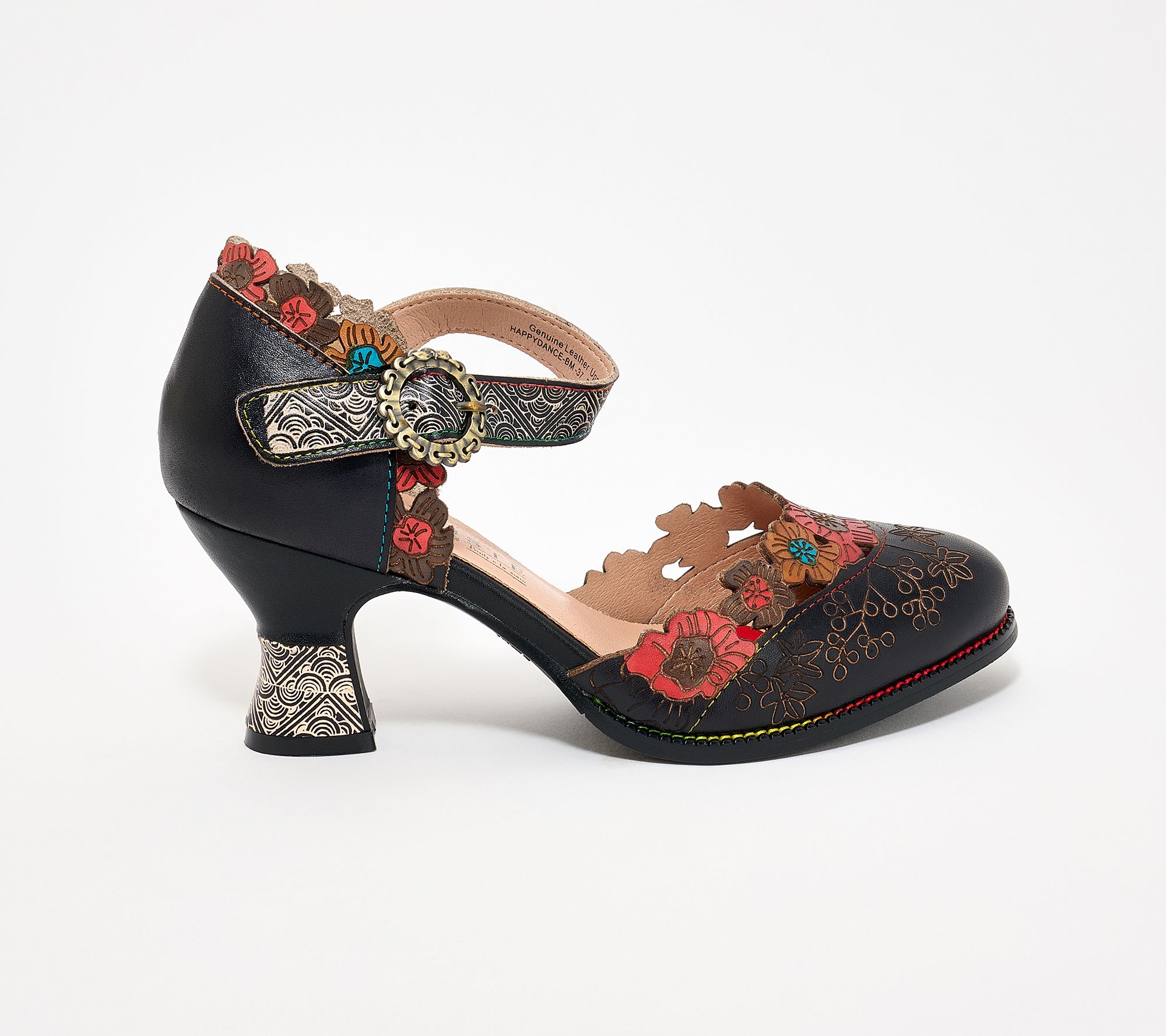 Laser-cut and embossed upper, floral patterns along scalloped topline, adjustable hook-and-loop strap with antiqued buckle