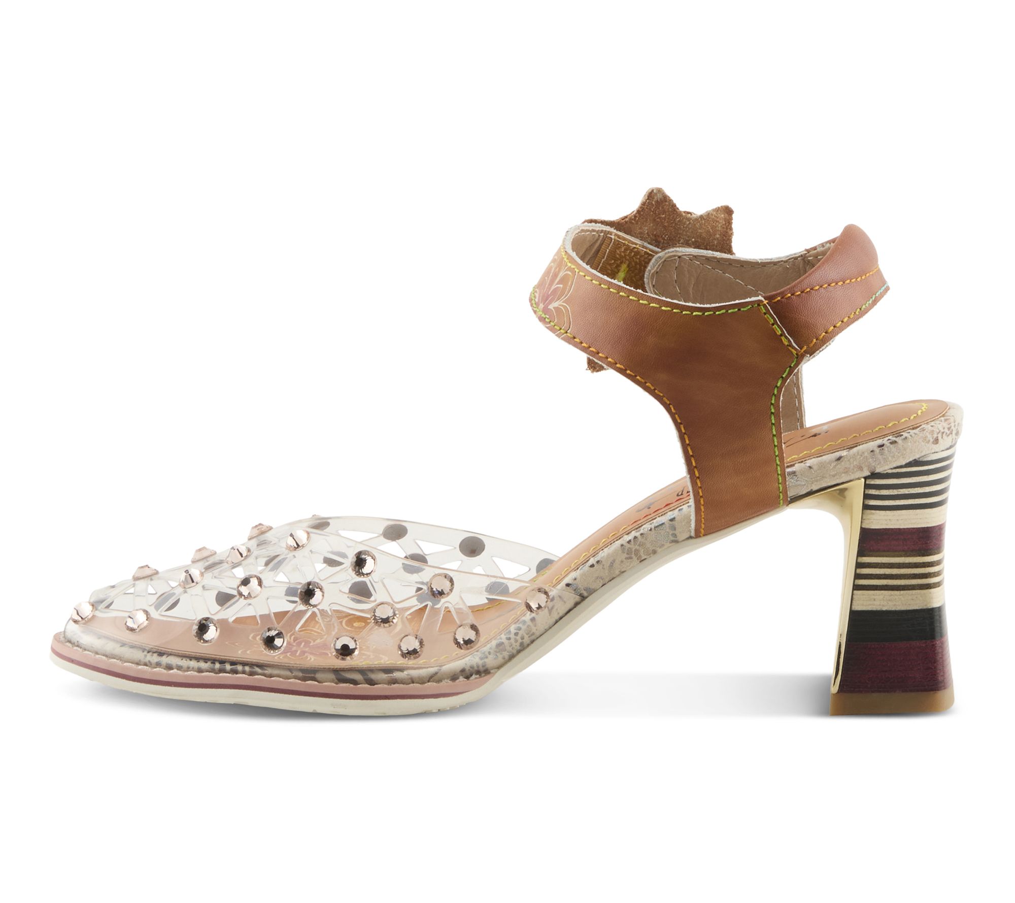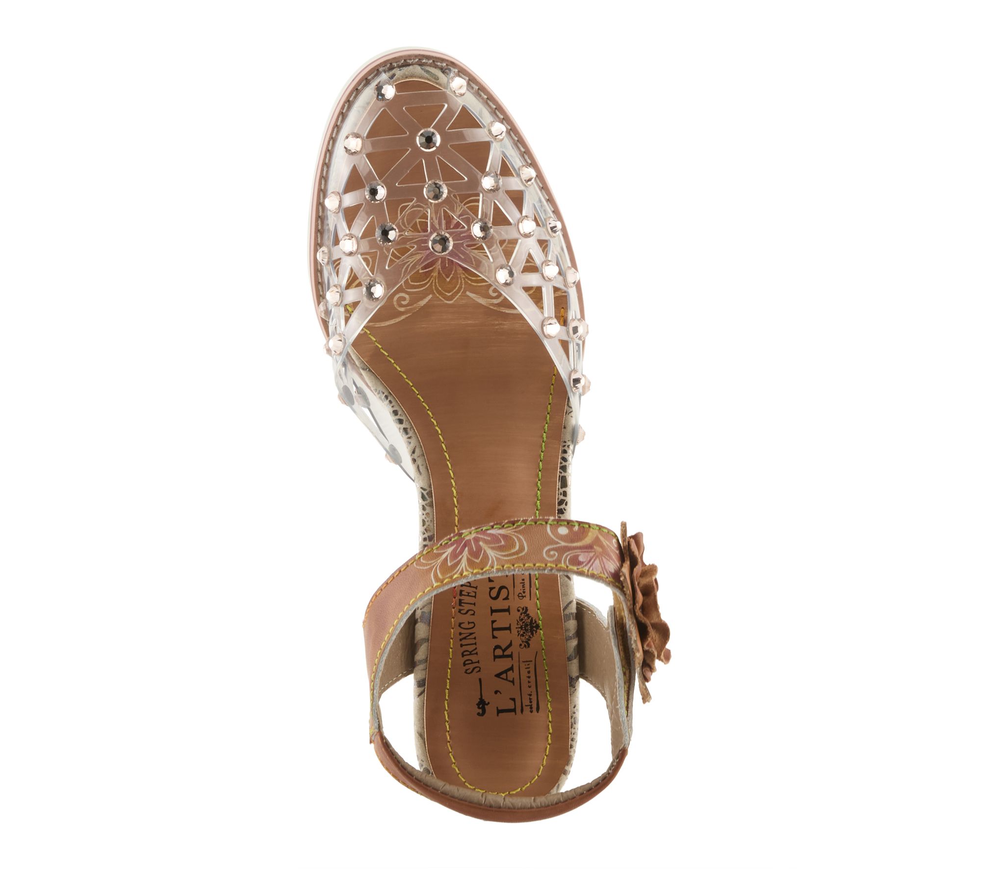 Leather upper, lucite vamp with rhinestones, flower applique with crystal center, ankle strap with hook-and-loop closure, subtle peeptoe