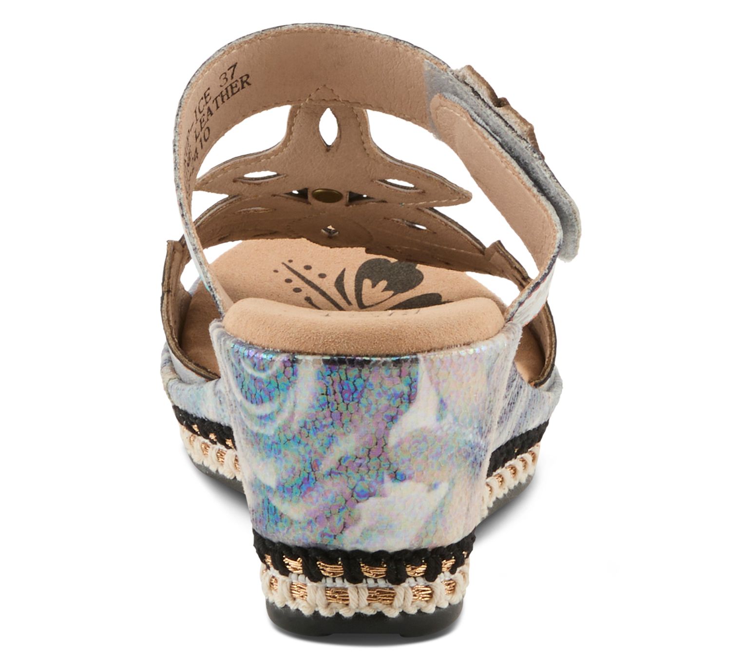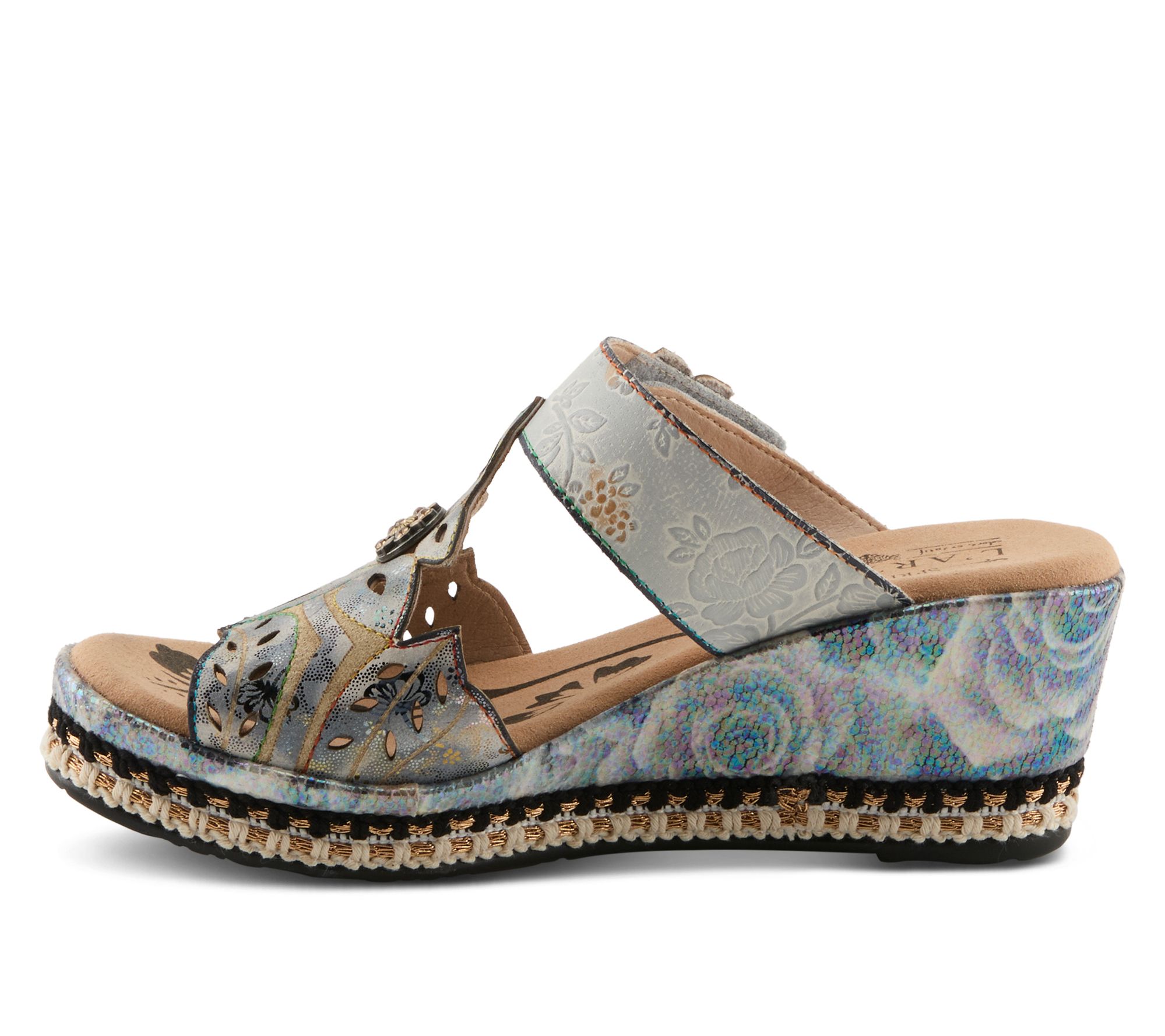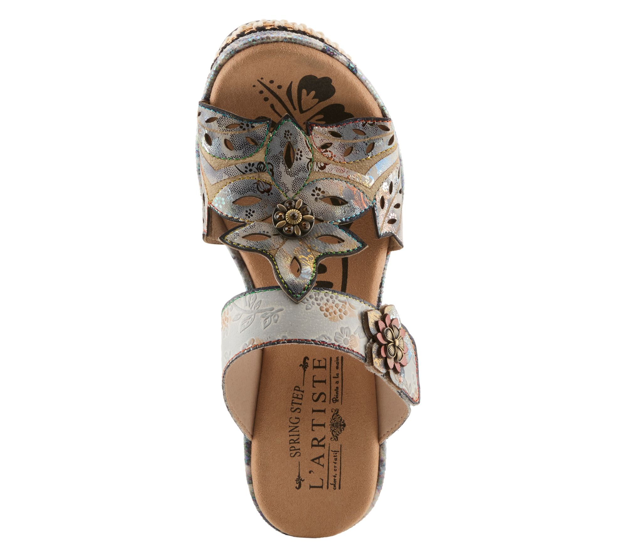 Turn heads with the captivating Coverup. This statement sandal features a printed metallic leather upper with a laser-cut floral design that drapes across the foot. Embossed, painted flowers adorn the adjustable ankle strap for an extra touch of elegance. Perfect for any occasion, these sandals combine beauty and comfort effortlessly. From L'Artiste by Spring Step.