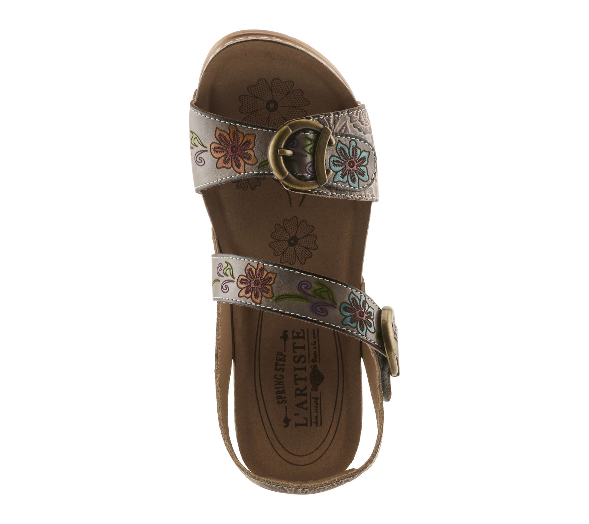 • Painted leather upper with artistic details, embossed floral patterns, adjustable vamp strap and backstrap with hook-and-loop closures, antiqued brasstone buckle details, open toe