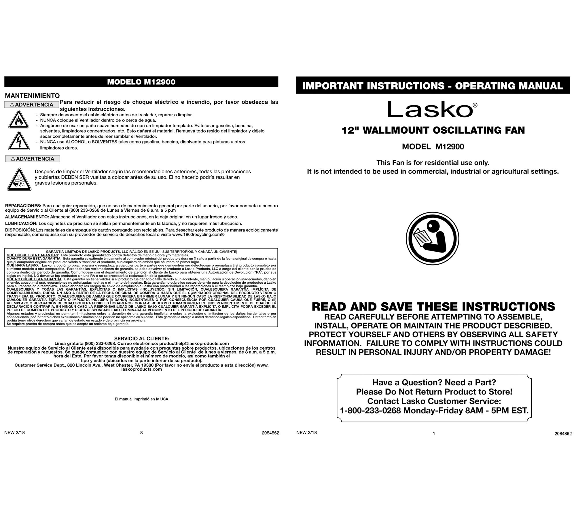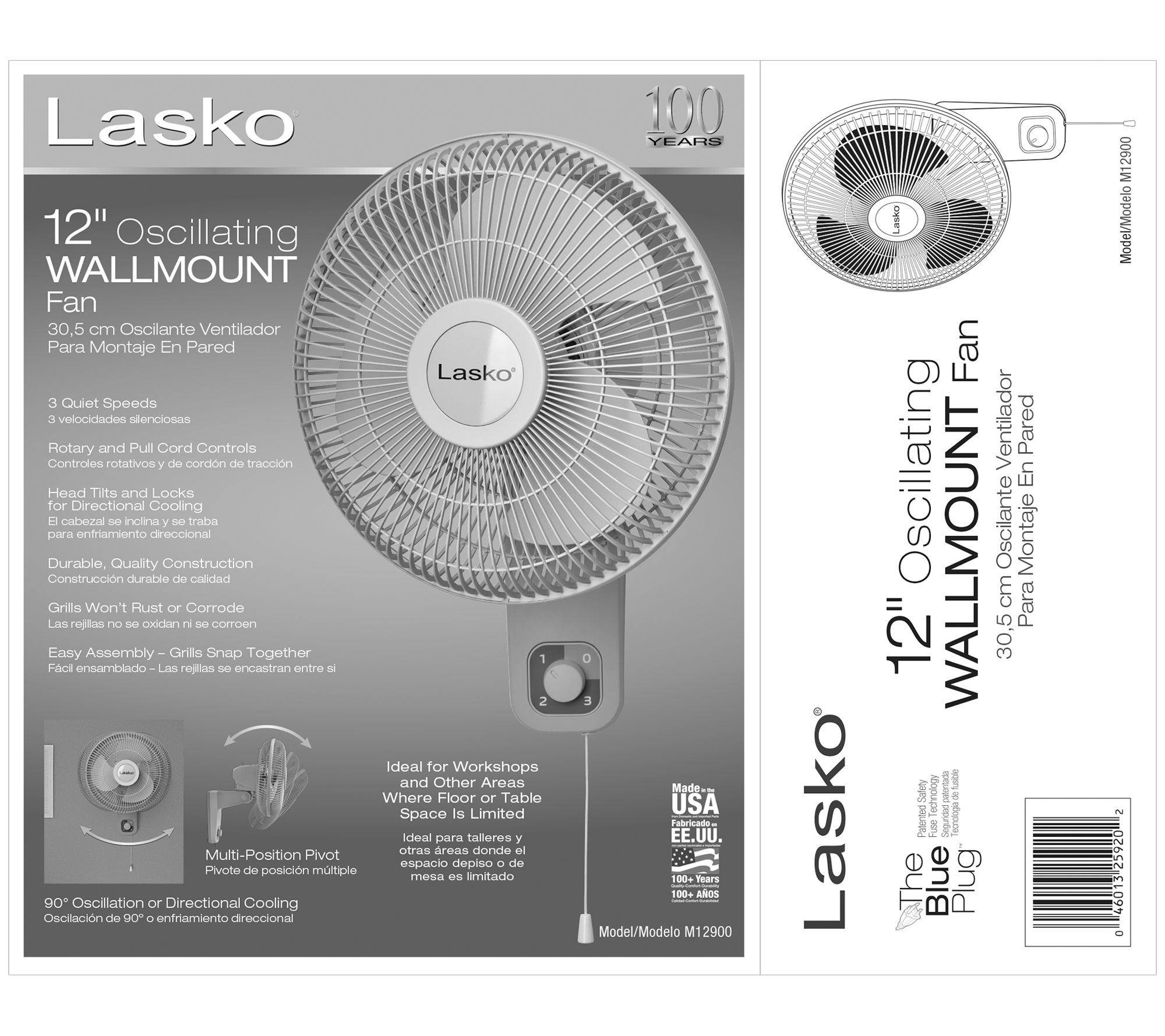 Lasko 12" Oscillating Wall-Mount Fan with Durable Grills