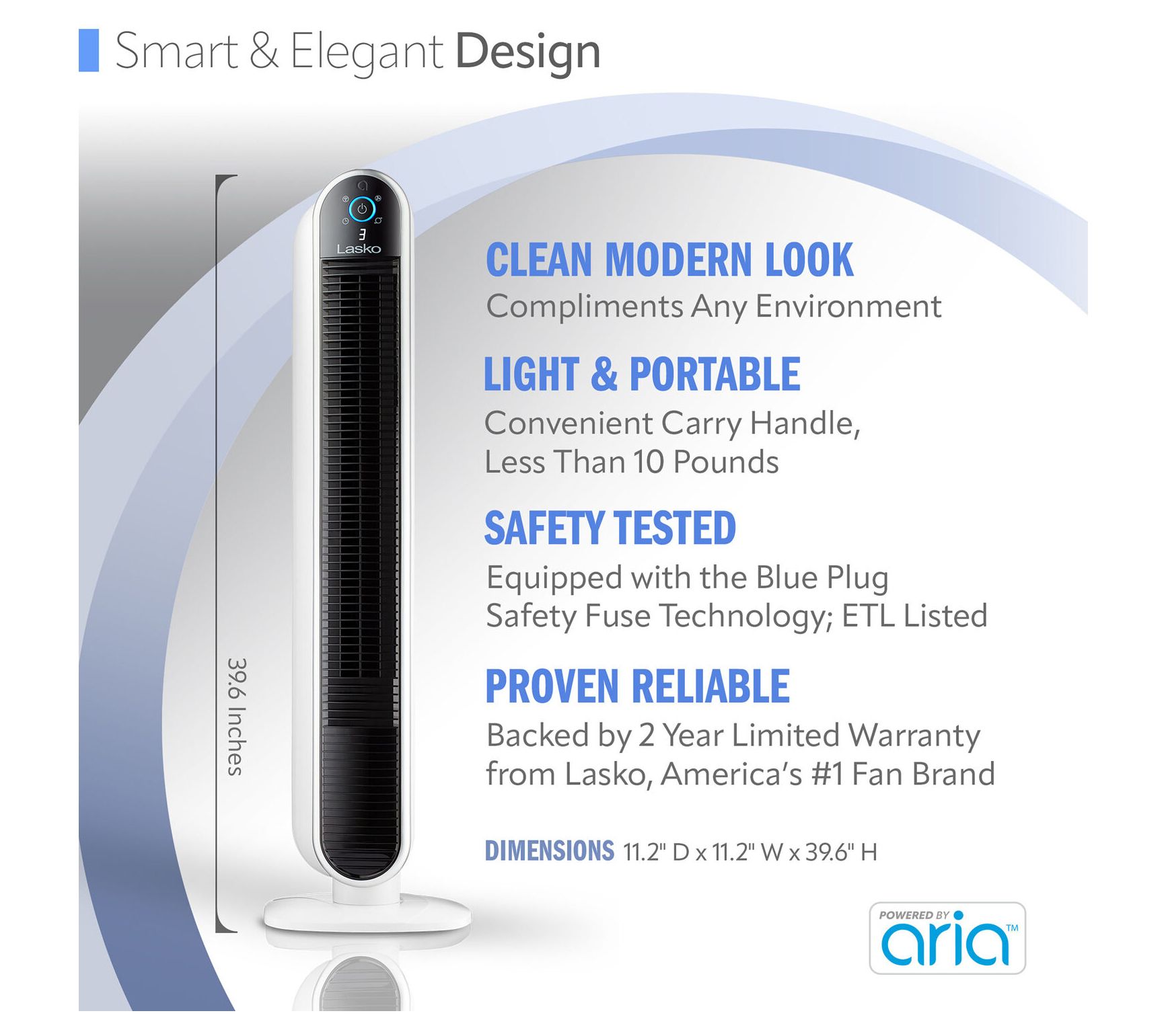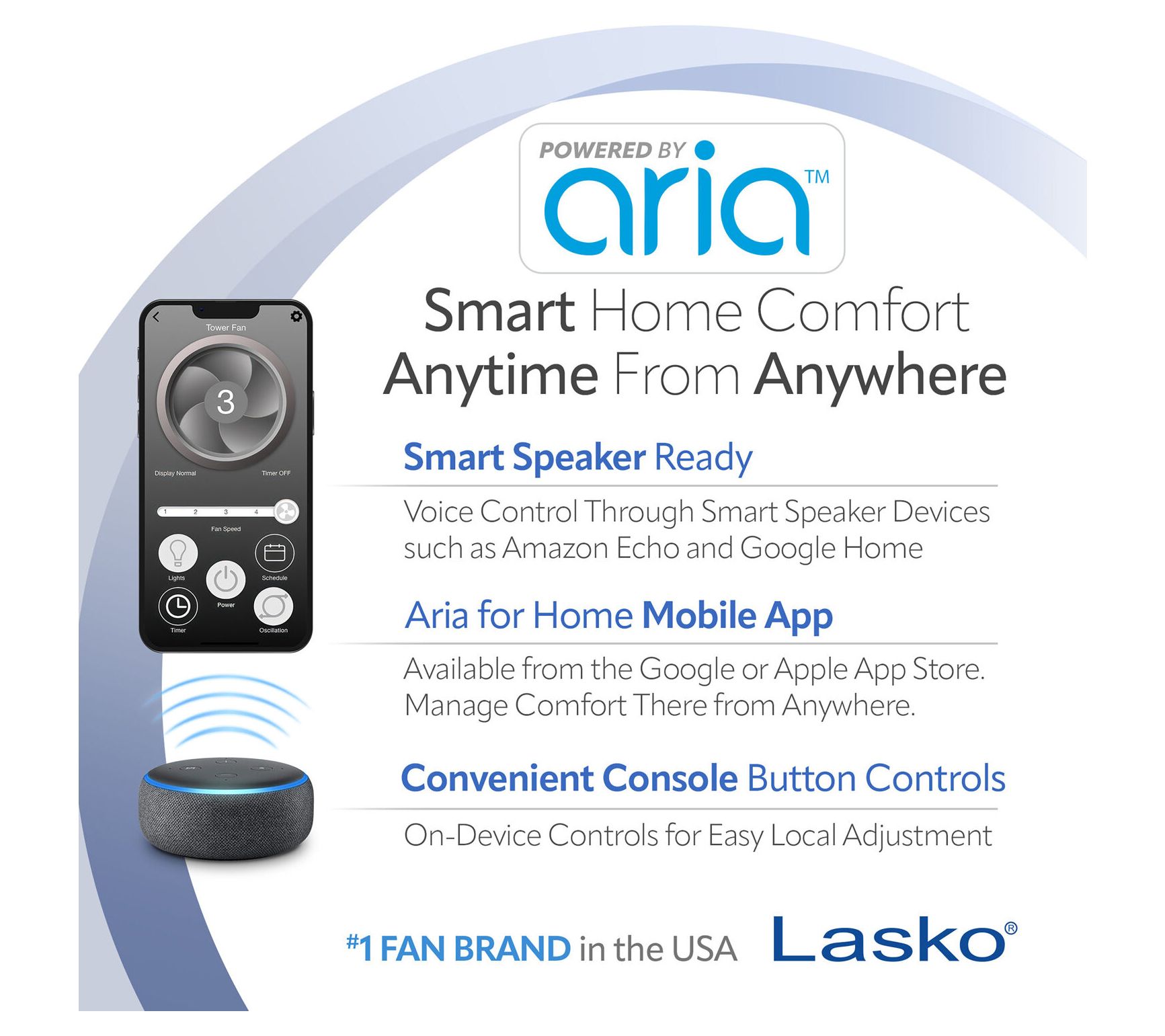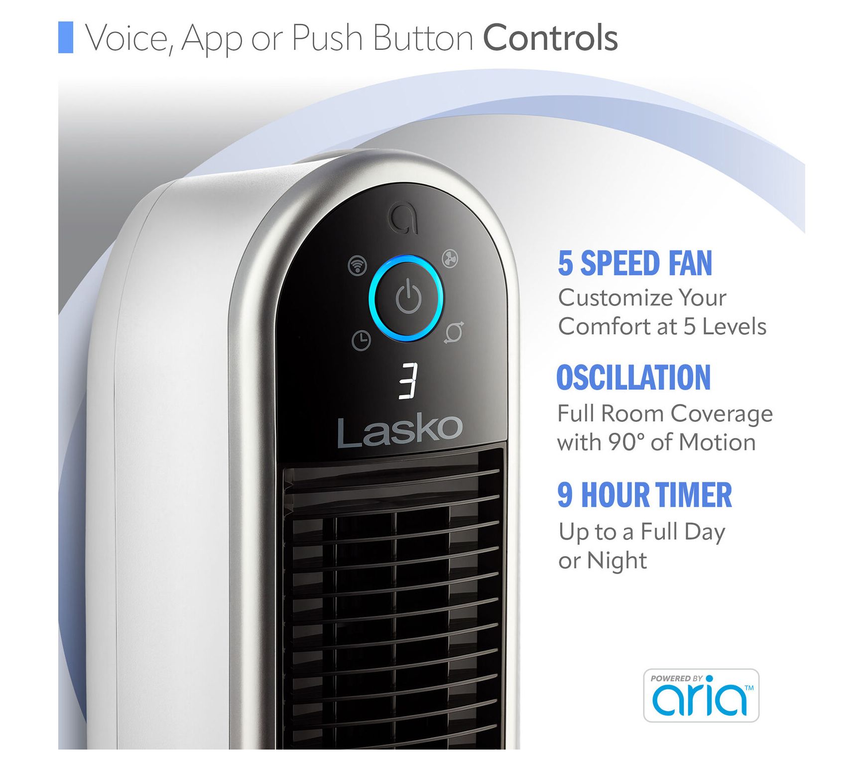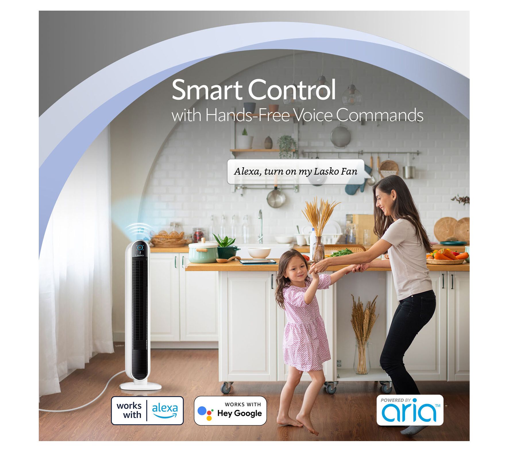 Stay cool and in control from anywhere with the Lasko Wi-Fi Smart Tower Fan Powered by Aria, offering simple adjustments through your phone, voice, or fan controls. Ideal for busy mornings or relaxing evenings, this sleek fan brings personalized comfort to your home -- choose your speed, set a timer, or dim the lights for bedtime, all at your fingertips. From Lasko.
