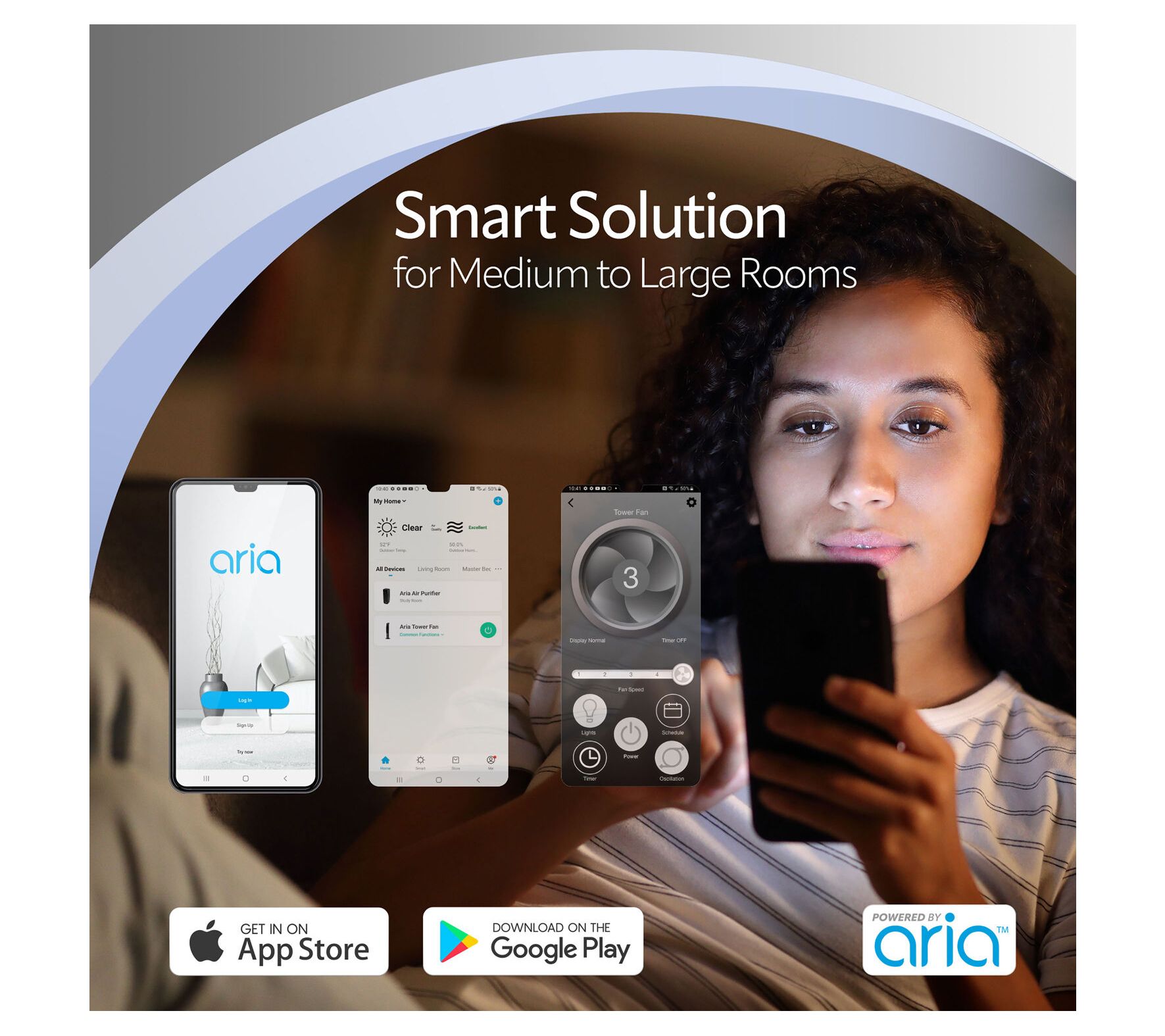 • Control via Aria for Home app, voice commands (Alexa or Google), or on-device buttons