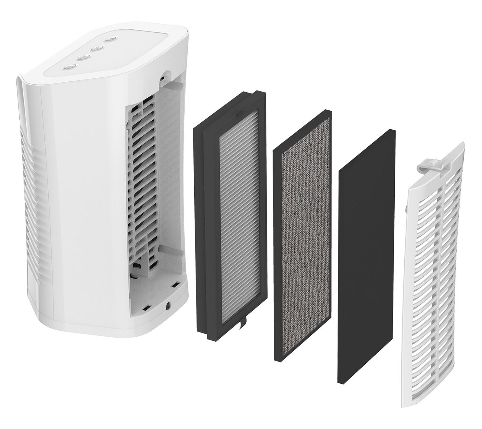 • Three-stage filtration system with carbon filter, VOC filter, and pleated filter