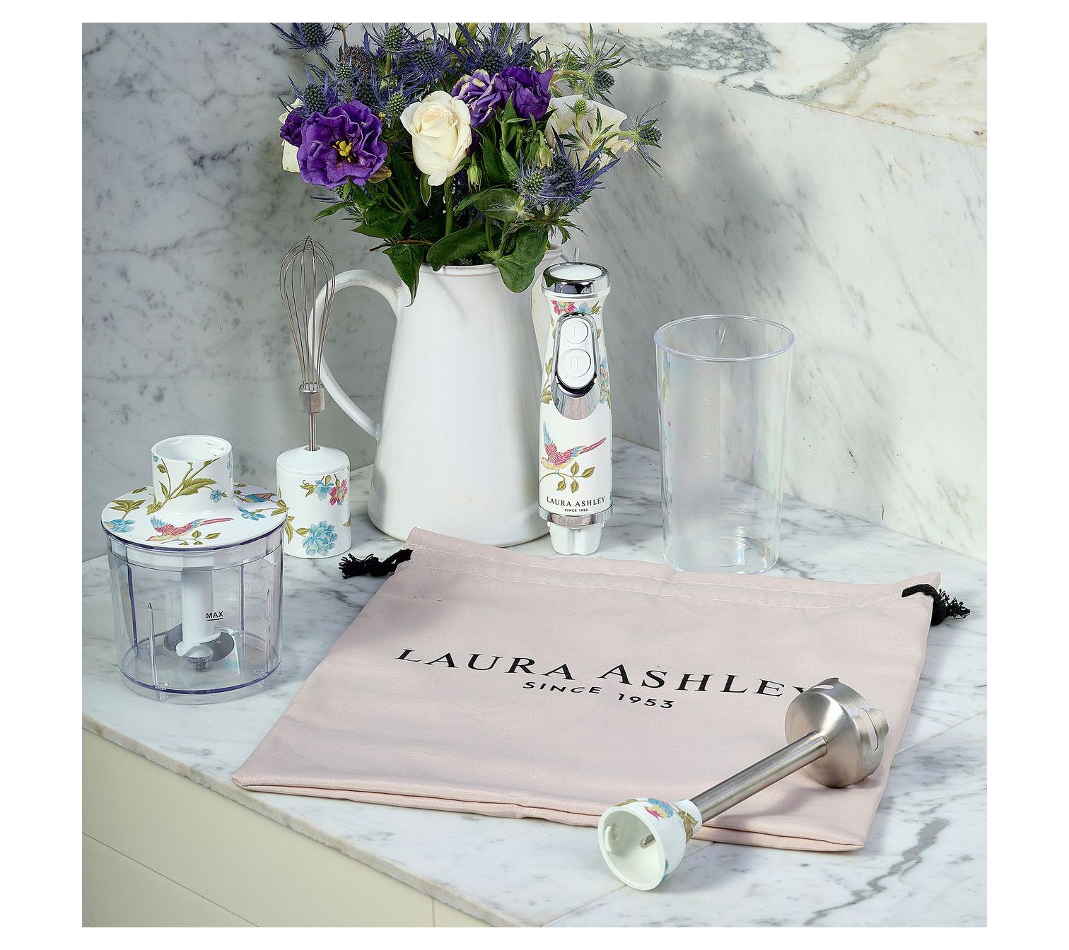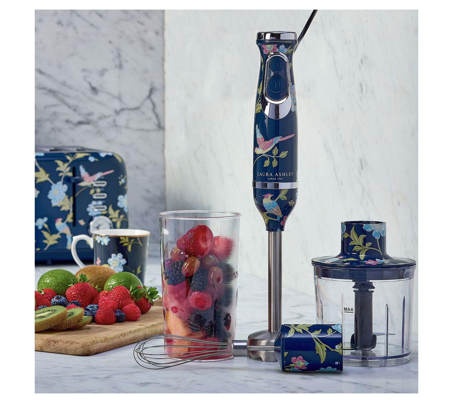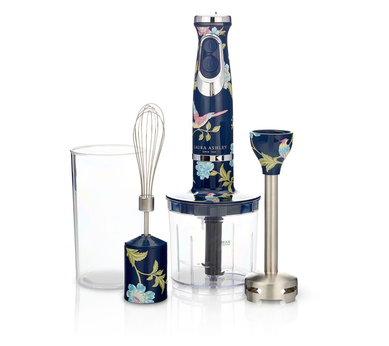 Easily whip up everything from smooth soups to airy whipped creams with this 4-in-1 immersion hand blender. Designed to conveniently fit in your kitchen (and hand!), it features two variable, multi-speed settings. From Laura Ashley.