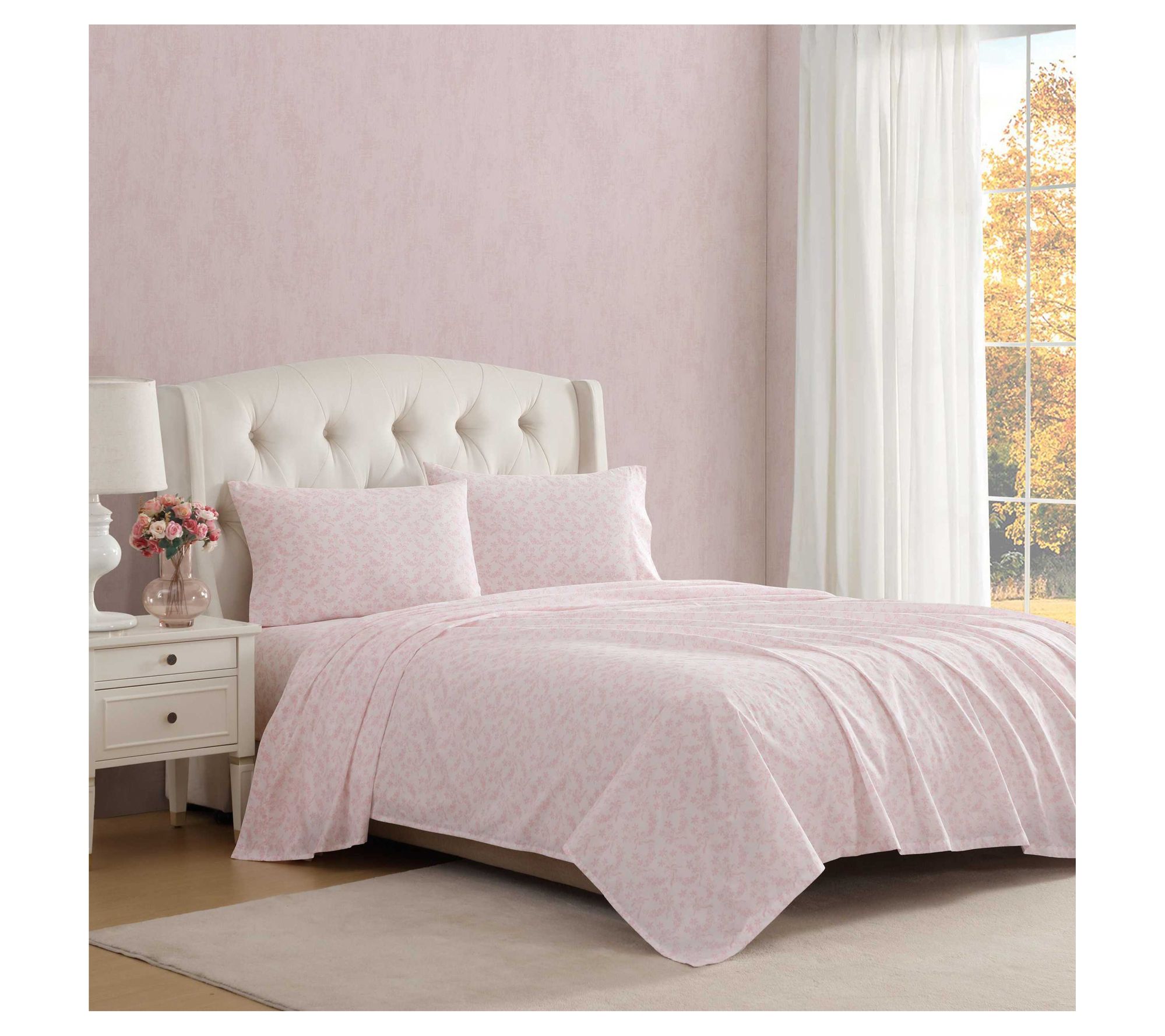 Turn bedtime into a dreamy retreat with the Laura Ashley Antoinette Pink Cotton Percale King Sheet Set. Delicate florals bring a soft touch of romance to your space, while lightweight cotton feels cool and inviting after a long day. These sheets mix and match easily with your favorite comforter or quilt for a refreshed and inviting look. From Laura Ashley.