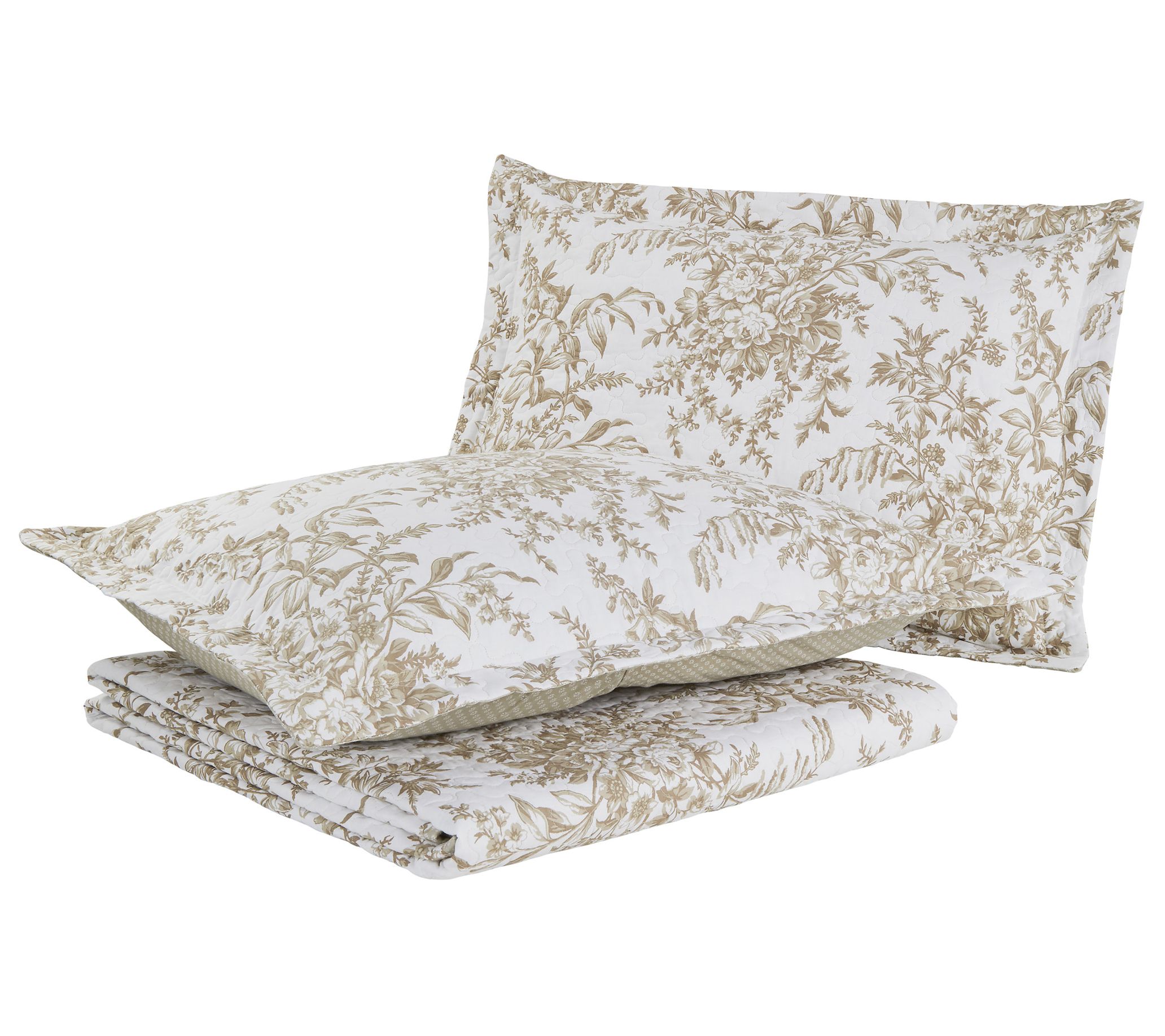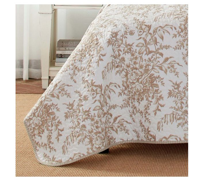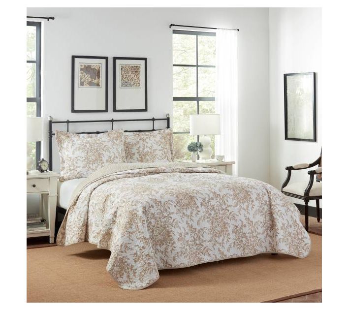 Transform your bedroom into a serene retreat with the Laura Ashley Bedford Brown Full/Queen quilt Set. This versatile set features a neutral mocha floral toile print paired with a mini-print geometric coordinate in taupe and white, adding a touch of elegance to any decor. From Laura Ashley.