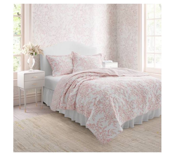 Add a touch of elegance to your bedroom with the Laura Ashley Bedford quilt set. This timeless toile pattern, updated in a fresh pink palette, is perfect for layering year-round. From Laura Ashley.