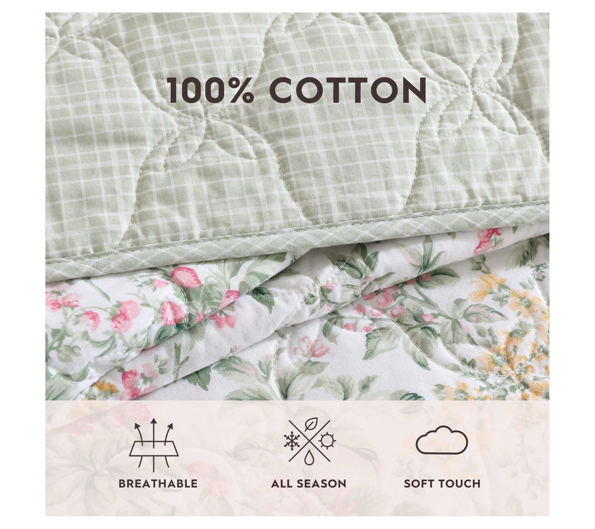 Soft florals transform your bedroom into a restful retreat with this quilt set from Laura Ashley. Whether enjoying a peaceful afternoon nap or winding down after a long day, the gentle cotton and airy layers offer soothing comfort all year. Coordinate with your favorite solids or patterns for a personalized, welcoming touch. From Laura Ashley.