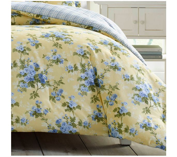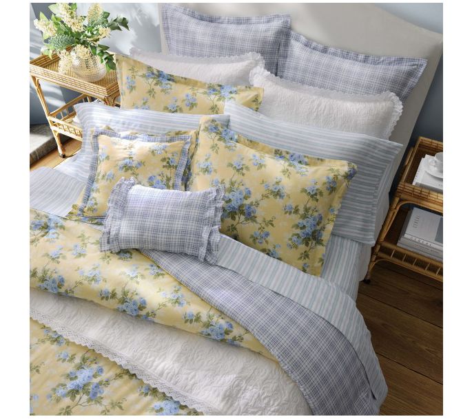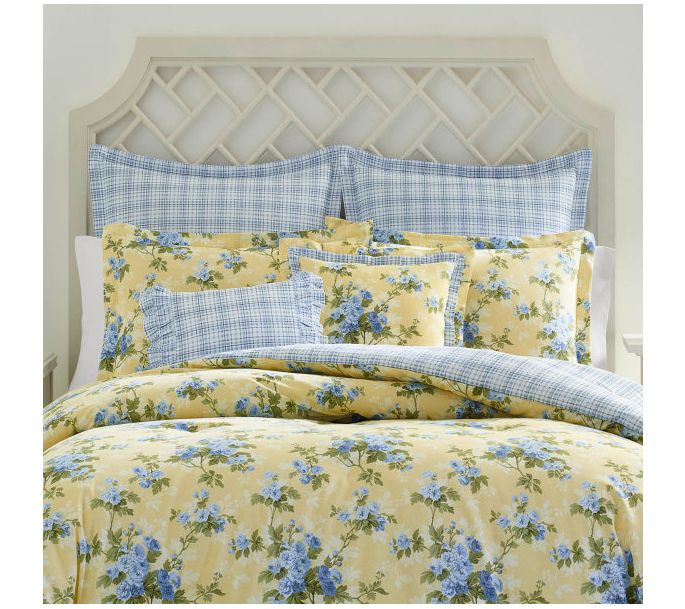 Brighten up your bedroom with the Laura Ashley Cassidy Yellow Full/Queen Comforter and Sham Set. Featuring a sunny buttercup yellow background adorned with romantic delft blue roses, this set brings a touch of English country charm to your space. From Laura Ashley.