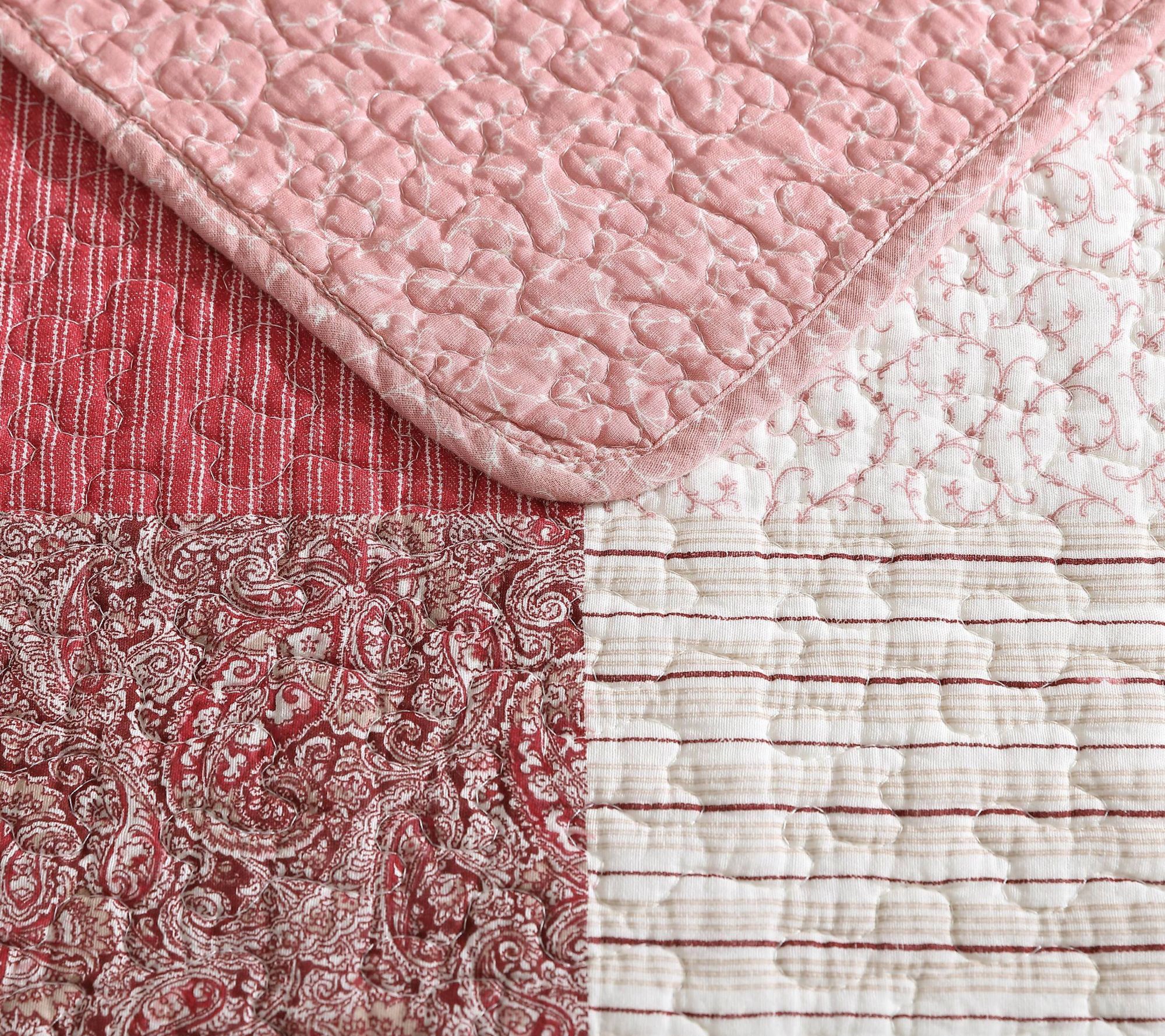 Introducing the captivating Celina quilt set, where vibrant colors and charming design come together to create a stunning focal point for your bedroom. This exquisitely printed set showcases a symphony of red hues with a patchwork design that combines floral, stripe, and paisley patch tiles. From Laura Ashley.
