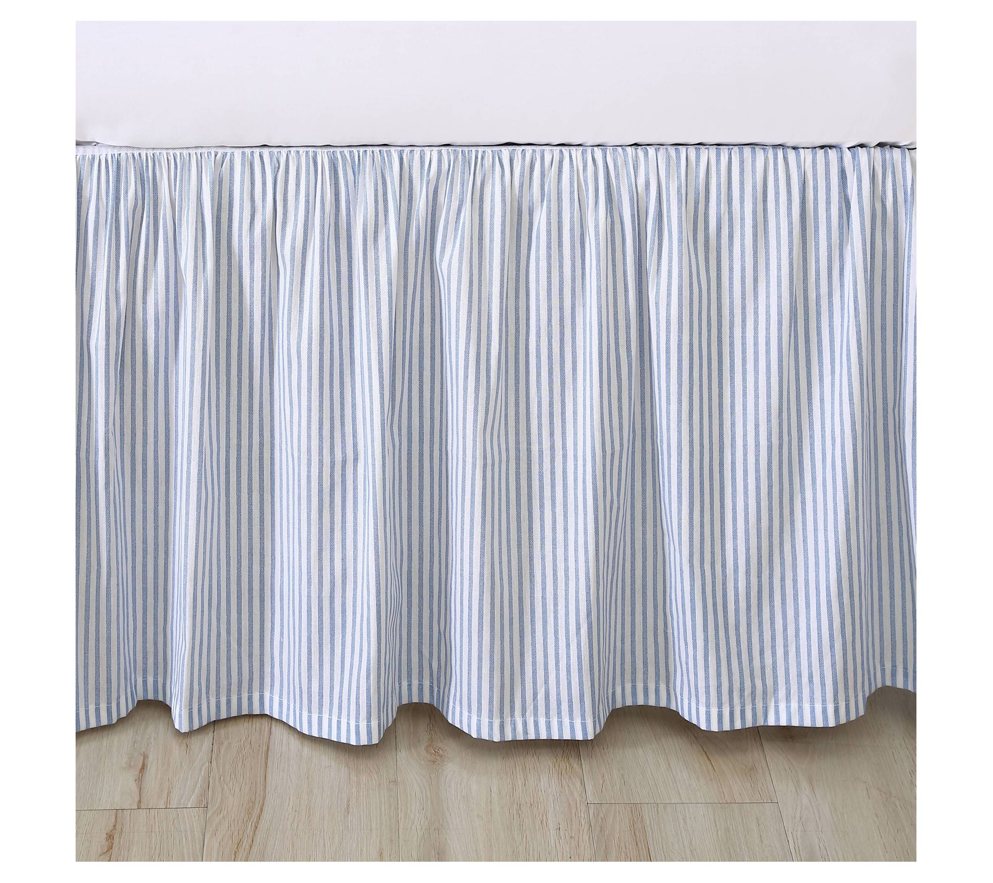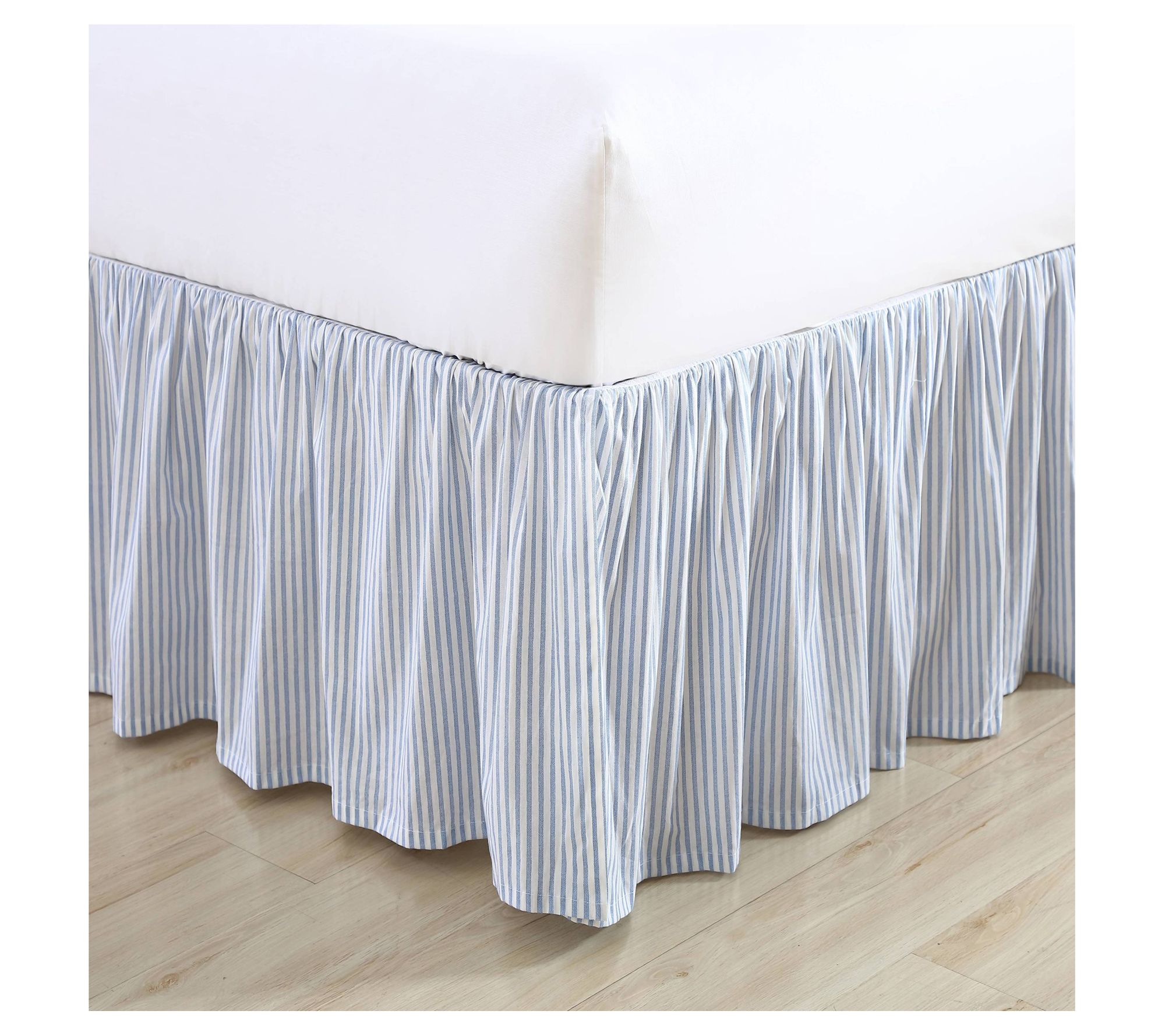 Complete the finishing touch on your bedding ensemble with the Laura Ashley Classics Ruffled Bed Skirt. Its light blue and white ticking stripe design pairs effortlessly with many Laura Ashley bedding collections, adding an elegant touch to your bedroom. From Laura Ashley.