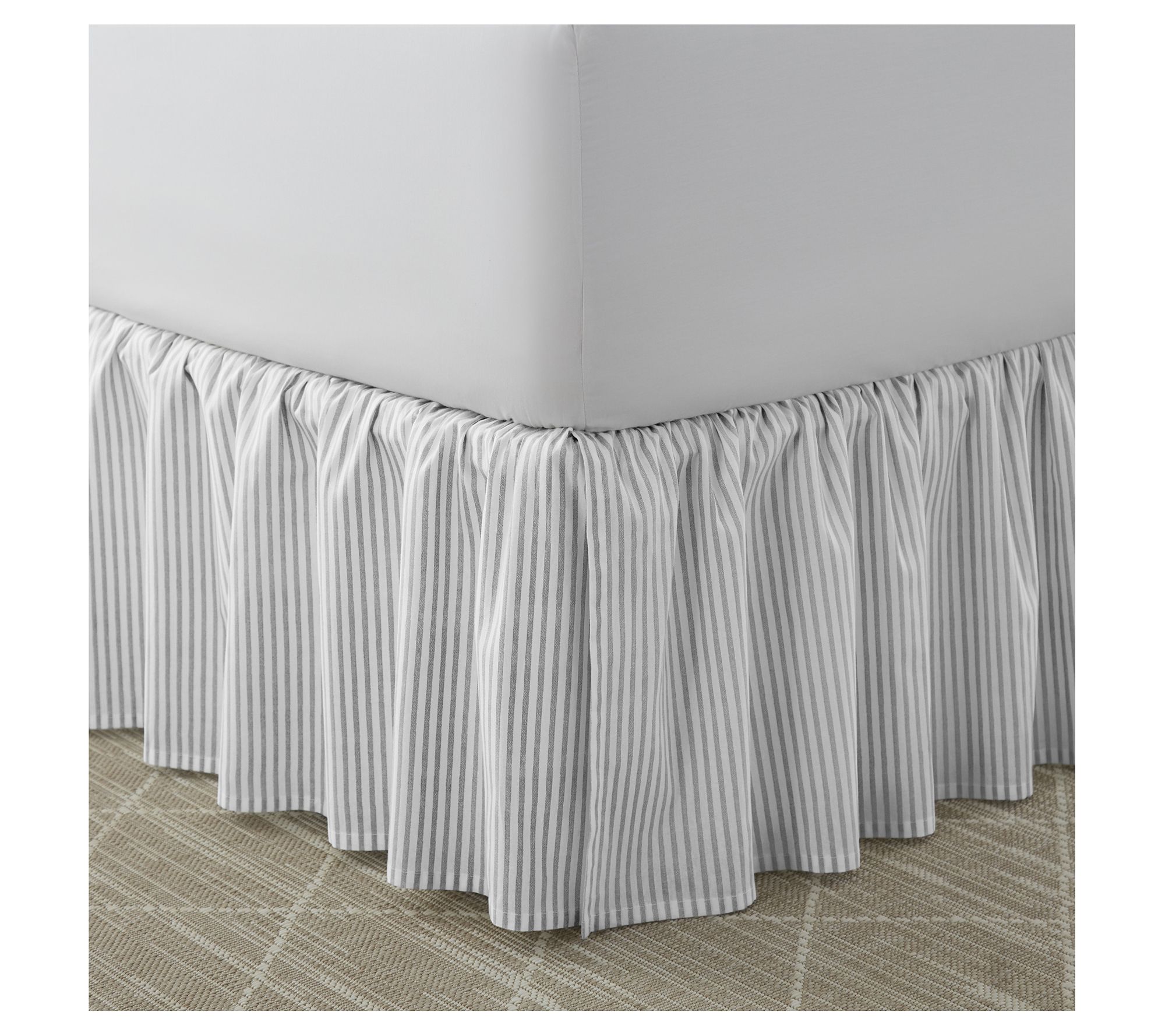 Bring a touch of timeless elegance to your bedroom with the Laura Ashley Classics Ruffled Bed Skirt, featuring a delicate gray and silver stripe pattern that complements various Laura Ashley bedding collections. From Laura Ashley.