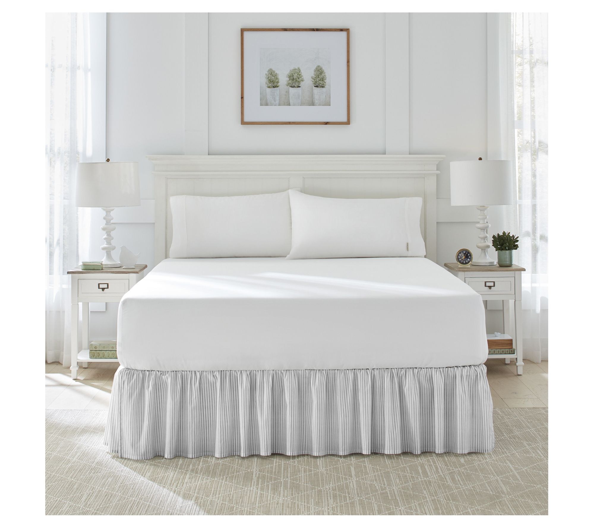 Add a classic touch to your bedding ensemble with the Laura Ashley Classics ruffled bedskirt. Its light silver and white ticking stripe design brings a sophisticated elegance that coordinates beautifully with many Laura Ashley bedding collections. From Laura Ashley.