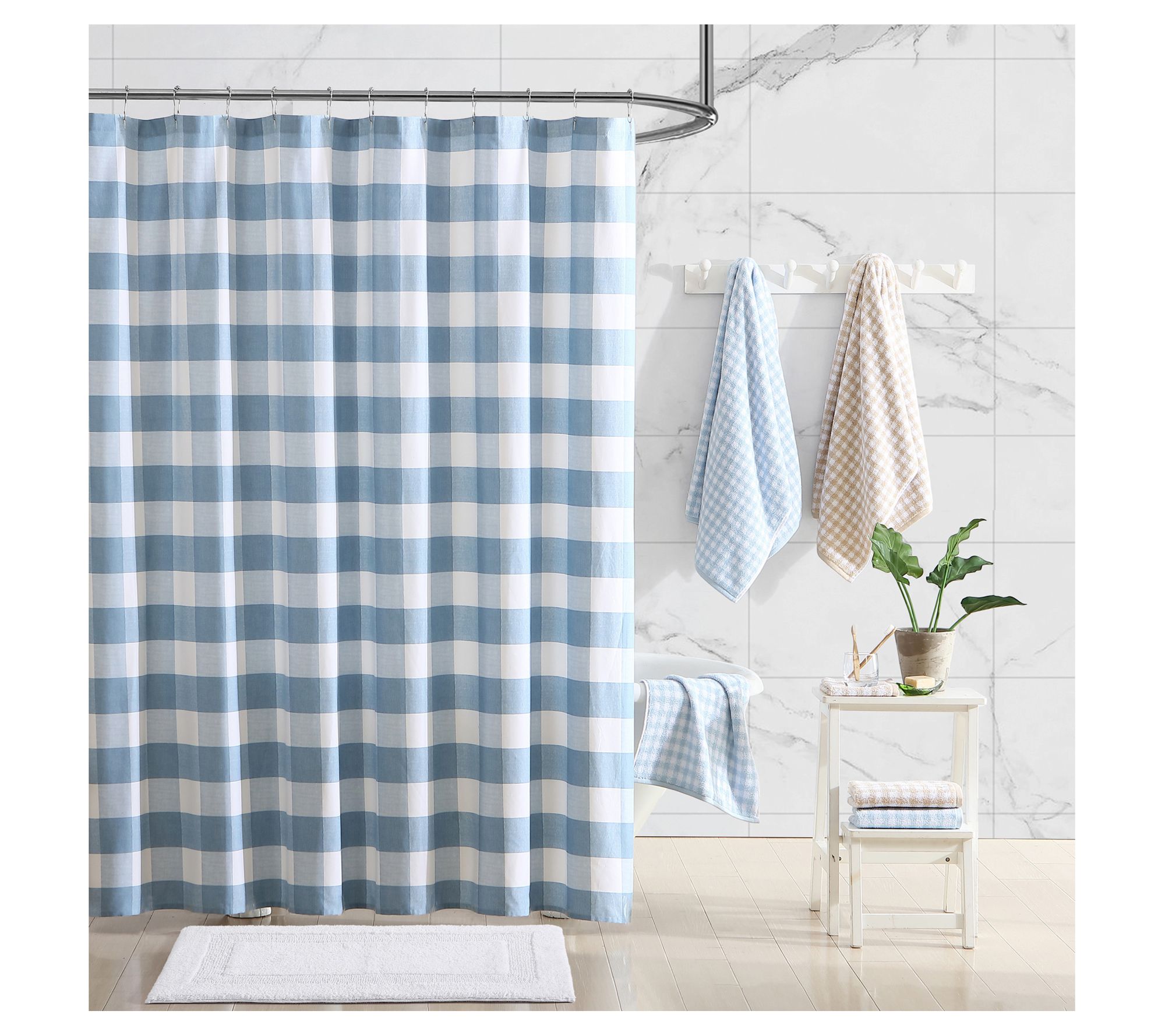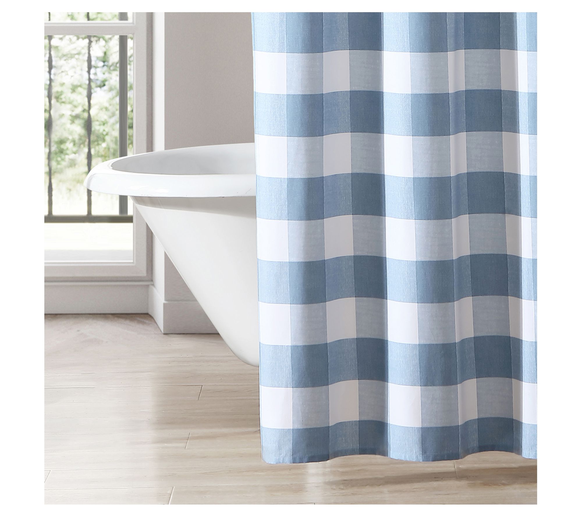 Give your bathroom a charming farmhouse update with the Laura Ashley Cynthia Blue Gingham Shower Curtain. The modern country gingham pattern in oversized blue and white checks brings a touch of rustic elegance to your space. From Laura Ashley.