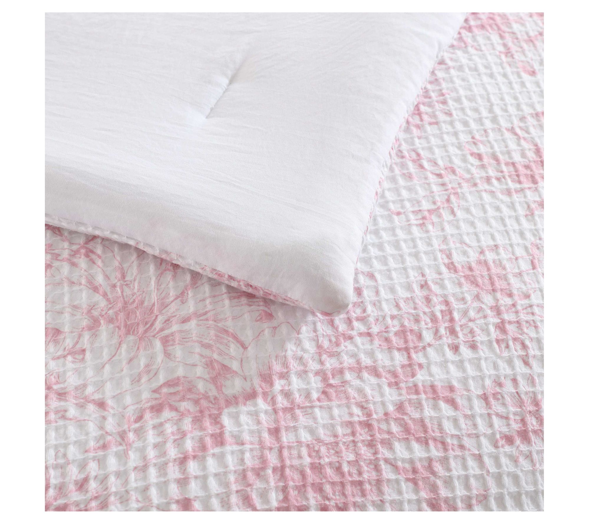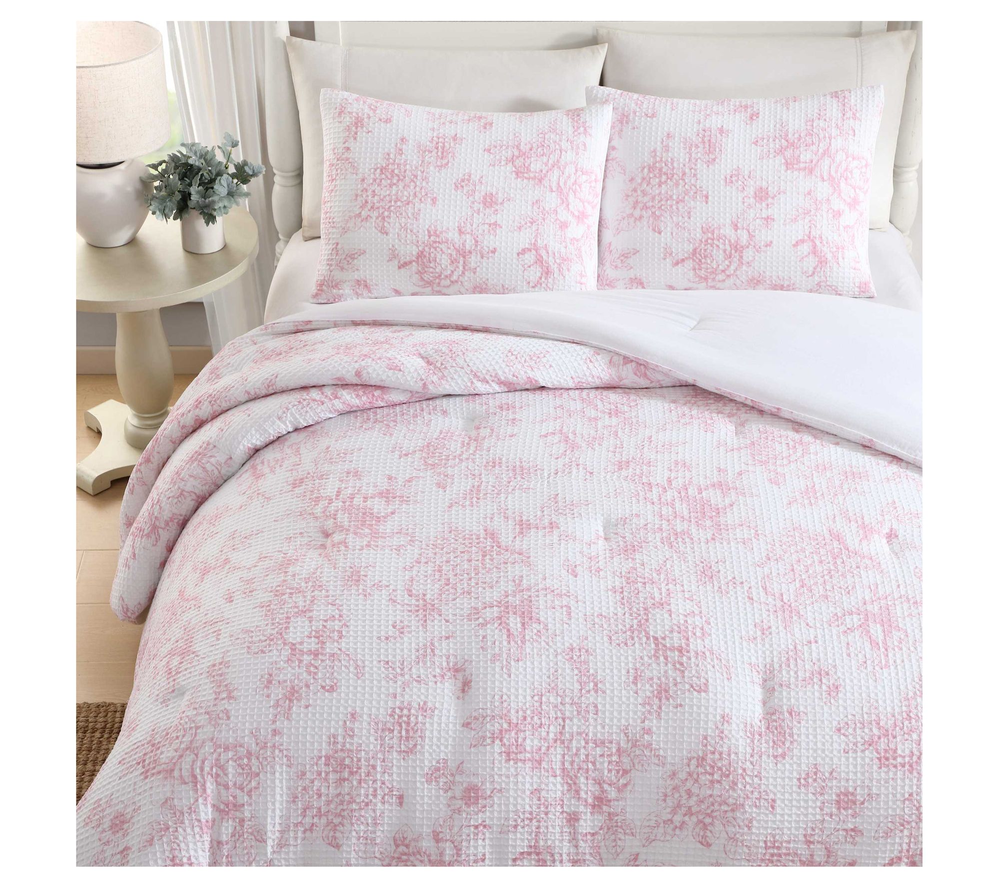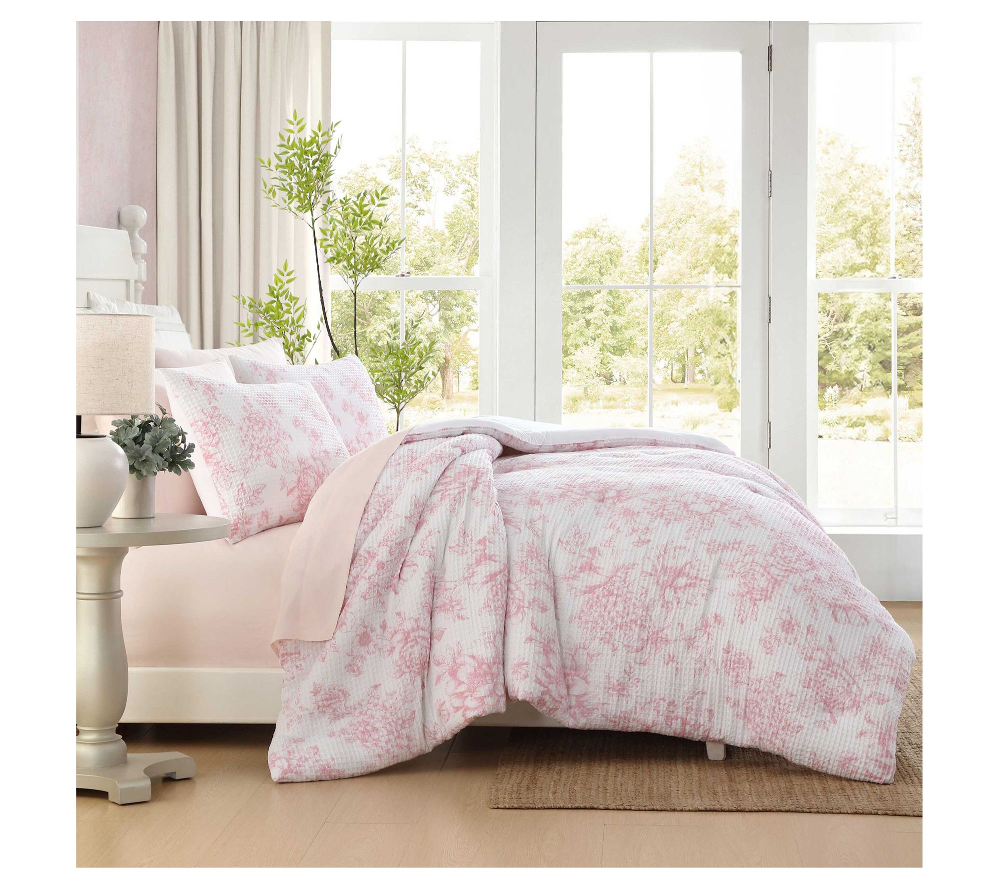 Create a serene and elegant bedroom retreat with the Laura Ashley Delphine Waffle full/queen comforter and sham set. This charming set features floral clusters in soft pastel pink tones on a delicate white background, providing a vintage charm. From Laura Ashley.