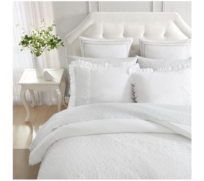 Transform your bedroom into a serene retreat with the Laura Ashley eyelet ruffle microfiber comforter and sham set. The elegant eyelet ruffle and smooth solid bands create a sophisticated look, while the lightweight polyester microfiber ensures comfort and easy care. From Laura Ashley.