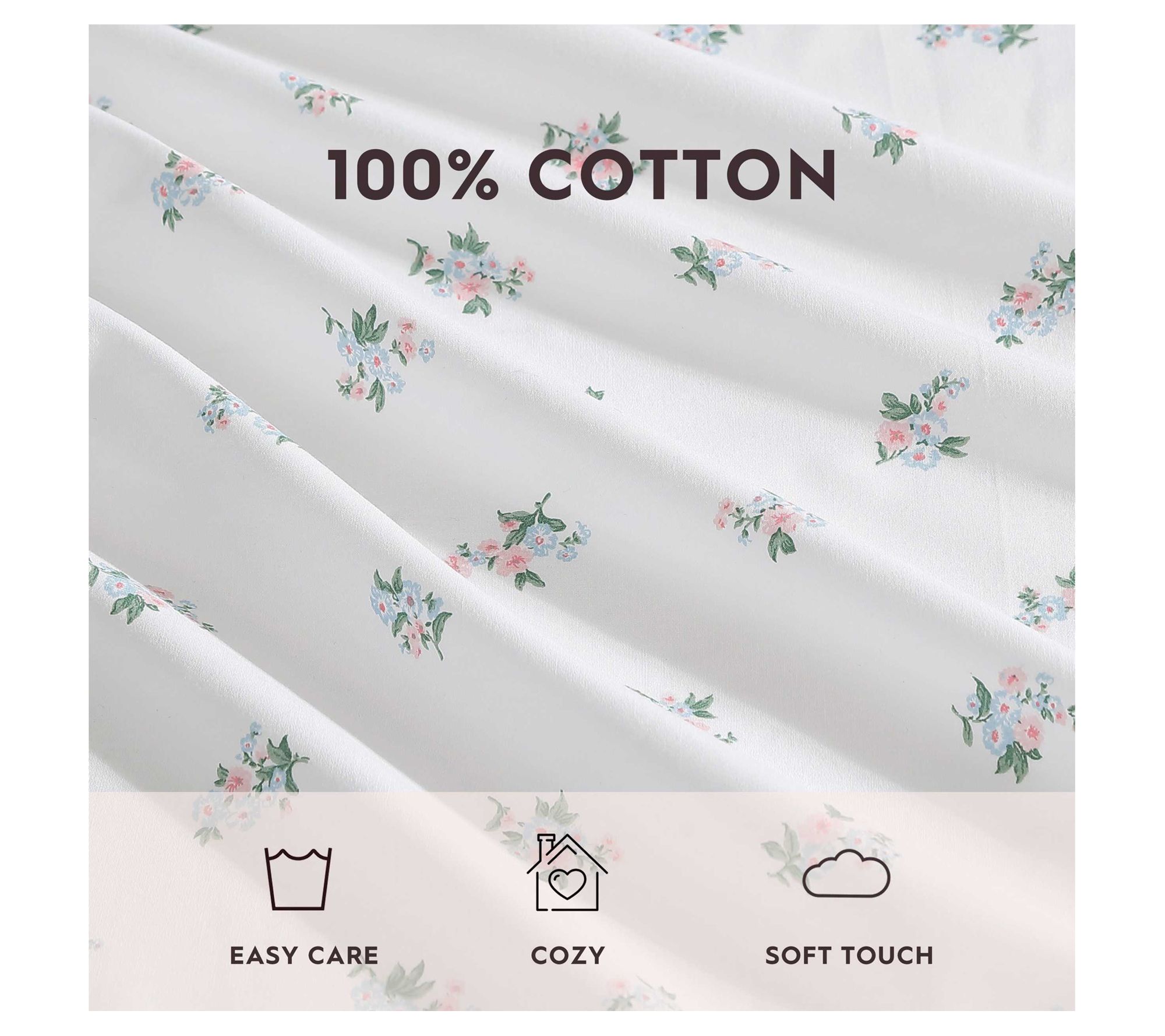 Elevate your bedroom with the timeless elegance of the Laura Ashley Harperette Pink-Blue King Sheet Set. Made from premium T200 Percale Cotton, these sheets feature classic floral prints accented with a printed hem, adding a unique touch of style to your decor. From Laura Ashley.