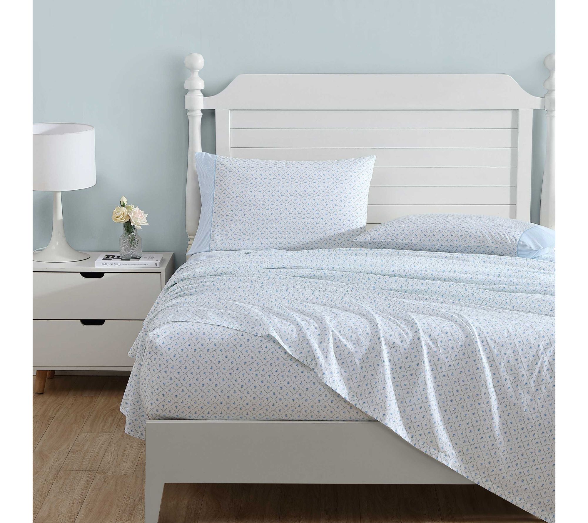 Elevate your home decor with the Laura Ashley Kate Blue-Green Twin sheet set, blending classic floral prints with a printed hem accent. Crafted from cotton percale, these sheets offer a crisp, smooth texture for an enhanced sleep experience. From Laura Ashley.