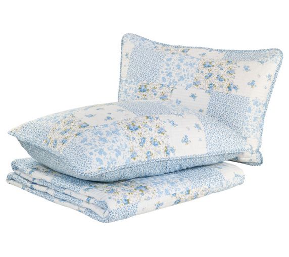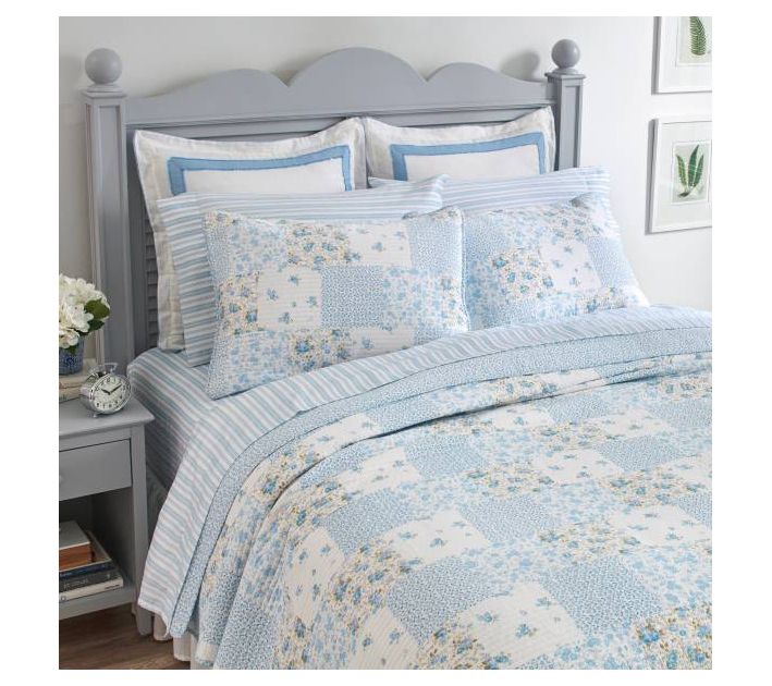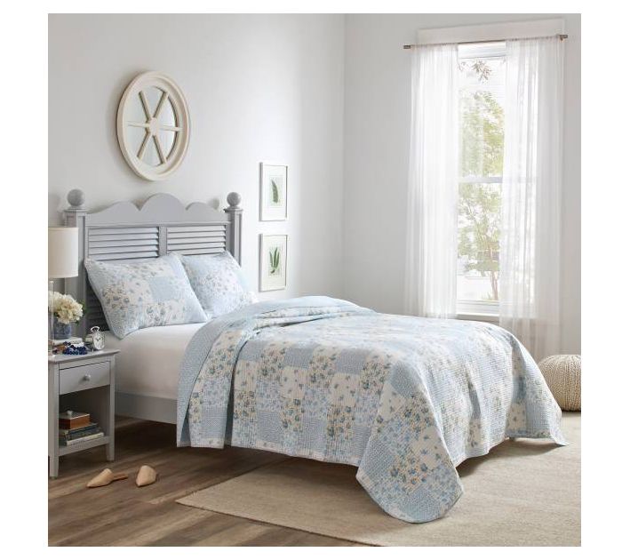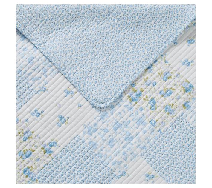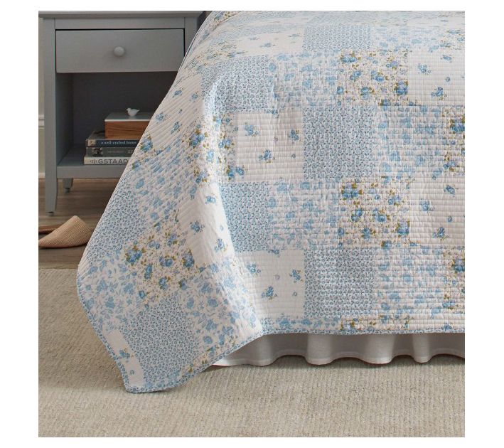 Transform your bedroom into a charming cottage retreat with the Laura Ashley Kenna Blue full/queen quilt and sham set. Featuring a medley of small-scale vintage prints in a classic patchwork and a fresh palette of blue and white, this set adds a modern edge with narrow horizontal channel quilting. From Laura Ashley.