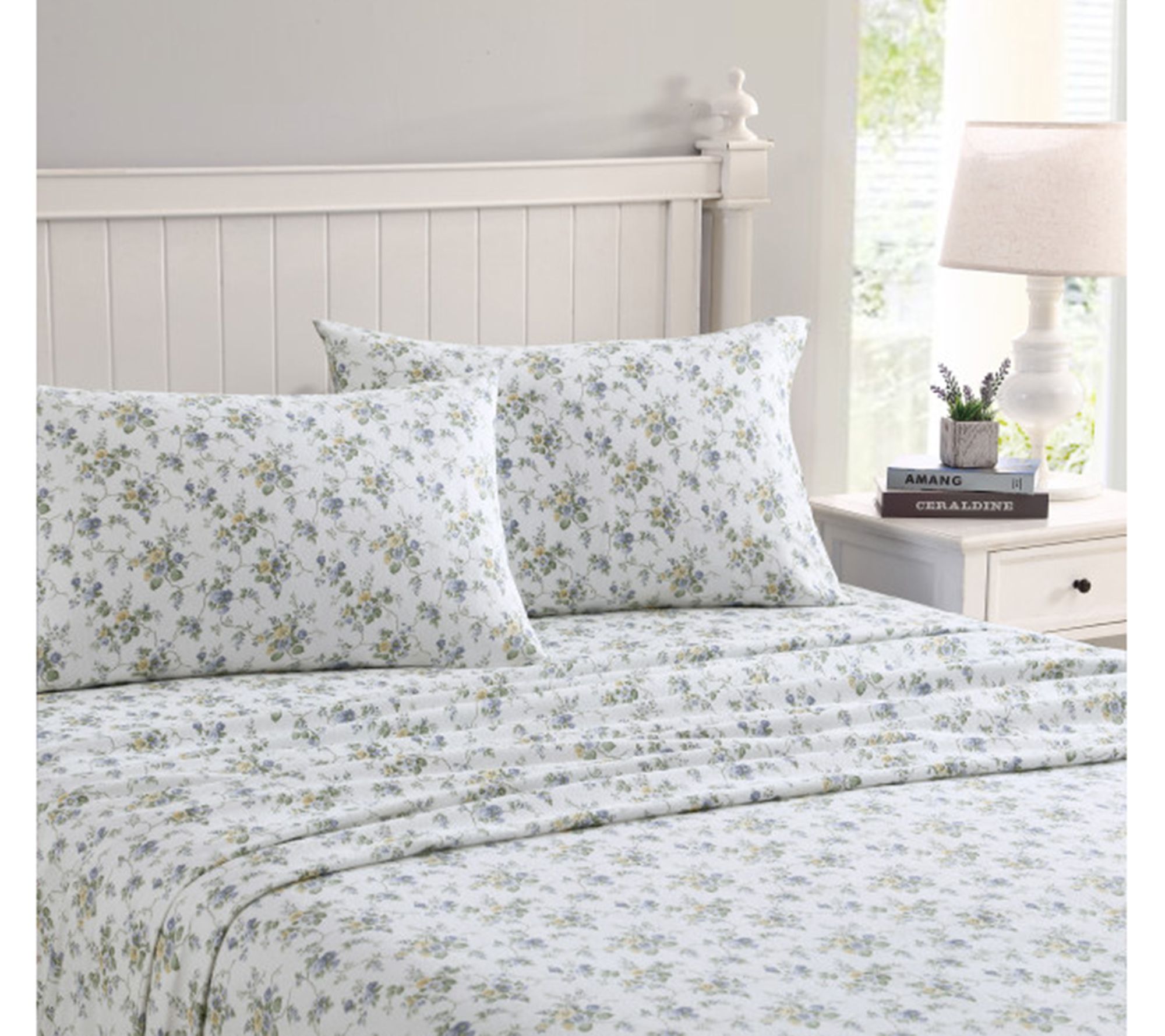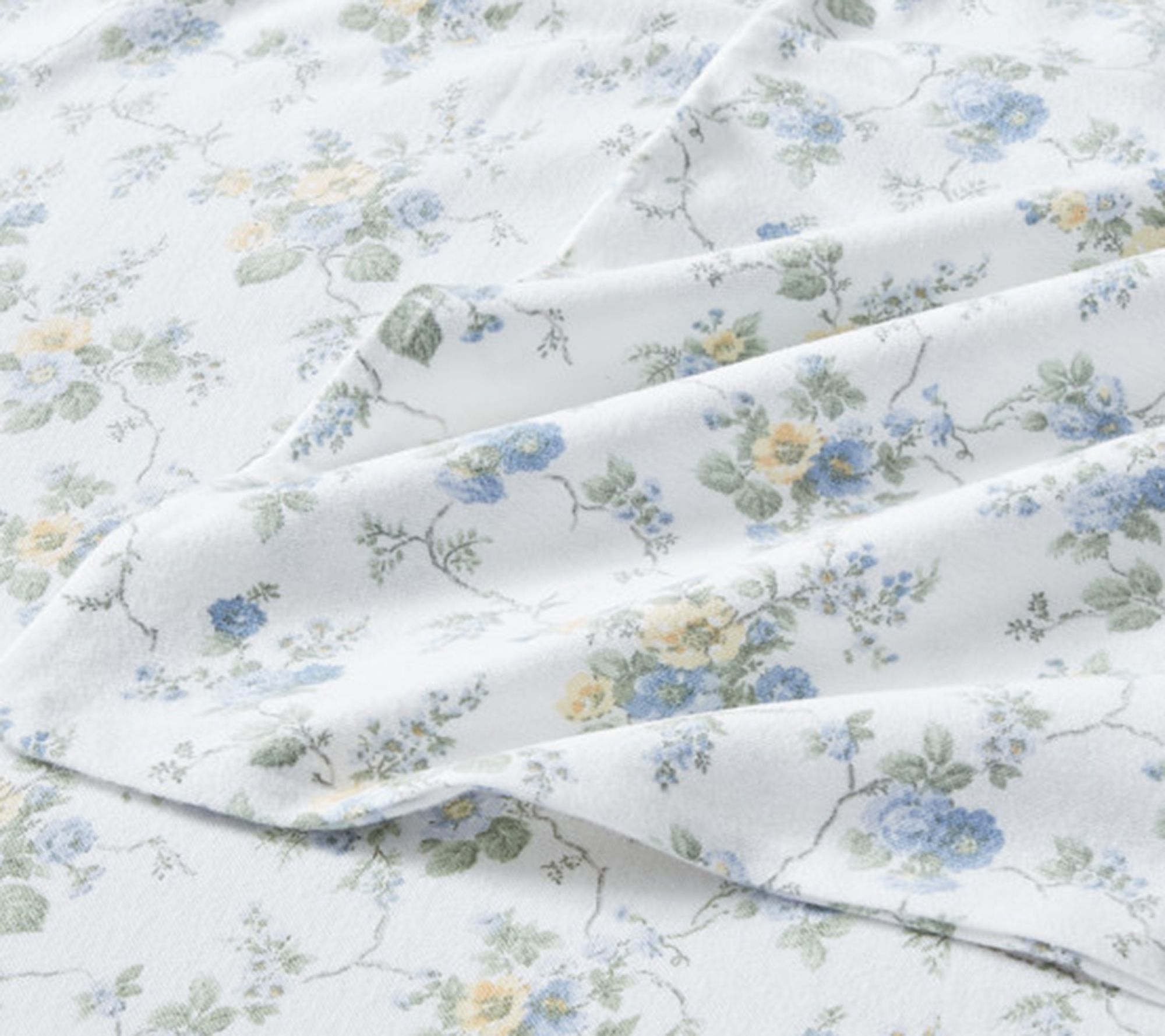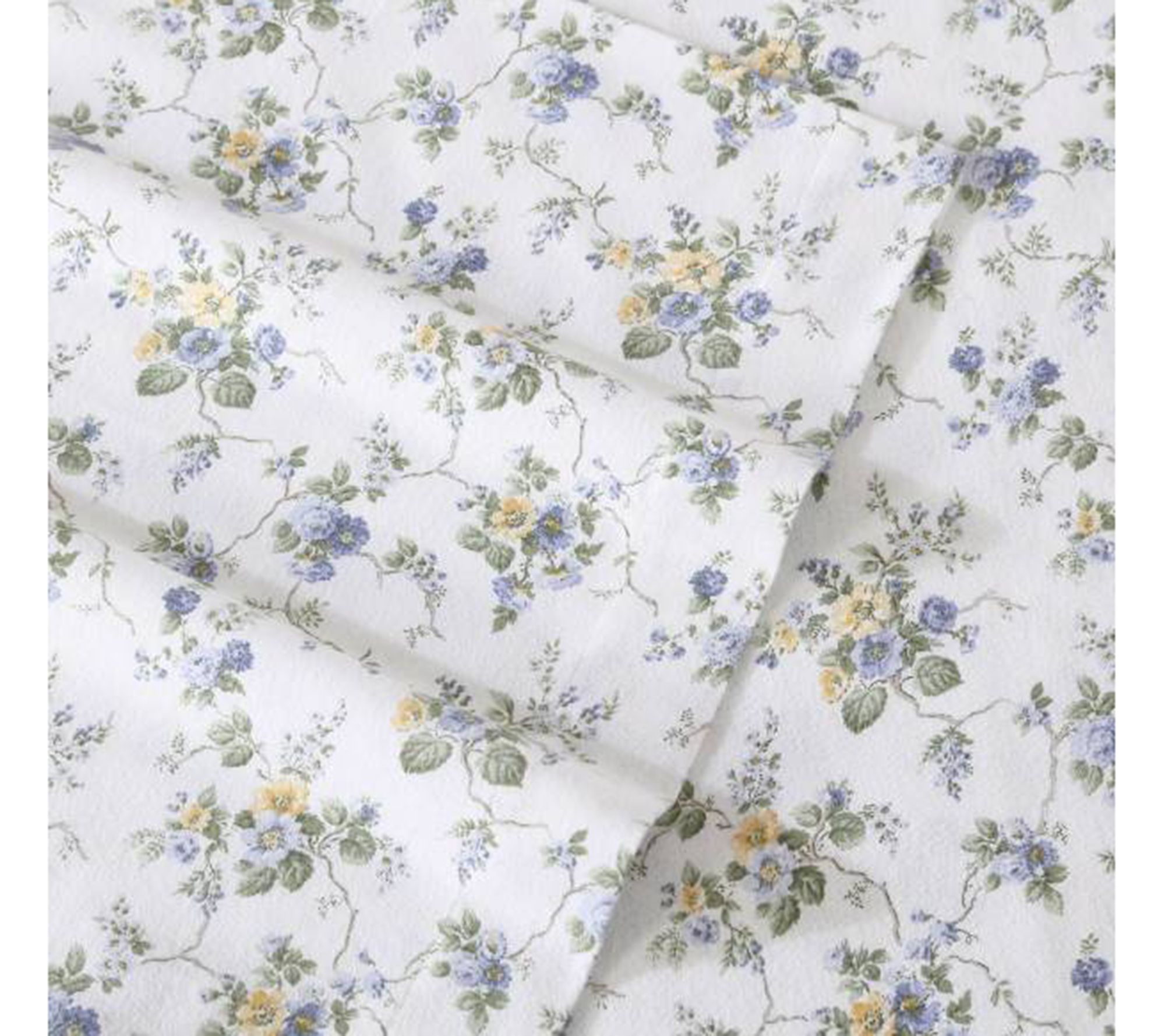 Elevate your bedroom decor with the Laura Ashley Le Fleur Blue Queen Sheet Set, featuring a charming floral pattern and ultra-soft cotton flannel for a cozy, comfortable night's sleep. From Laura Ashley.