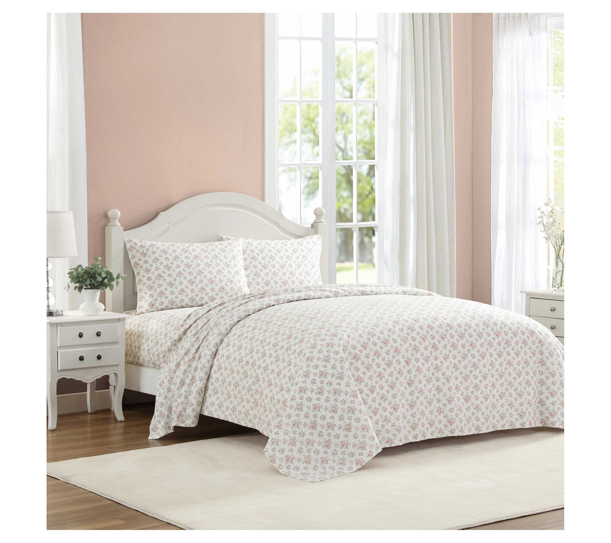 Add a touch of romance to your bedroom with the Laura Ashley Leanna Rose printed percale sheet set. The timeless floral design in a lovely mauve pink shade is sure to brighten up your solid white bedding ensemble and provide a charming appeal. From Laura Ashley.