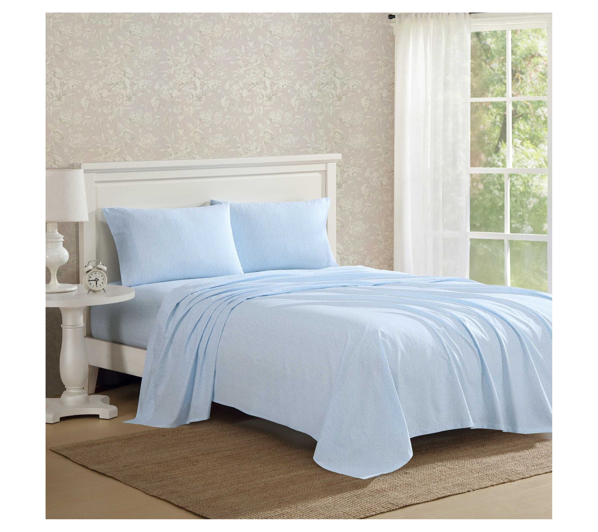Outfitting your bedroom with crisp percale sheets is an instant upgrade to relaxation, and this Laura Ashley full sheet set brings a touch of floral charm with year-round comfort. Crafted from 100% cotton, these sheets offer a smooth feel, promising softness and durability night after night. From Laura Ashley.