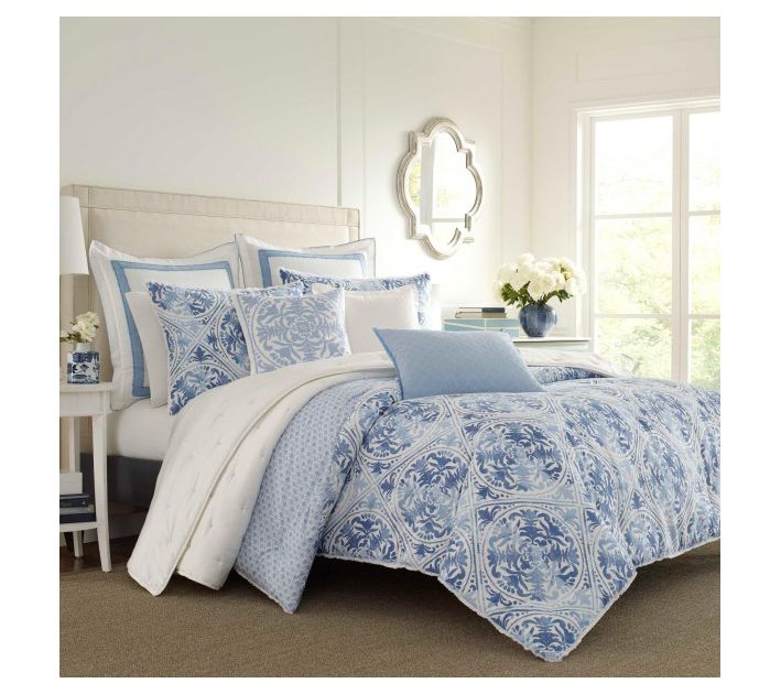 Decorate your bedroom with a modern update to traditional style. This pillow features a blue embroidered medallion design on a white background, for a chic style to add to your bedding collection. From Laura Ashley.