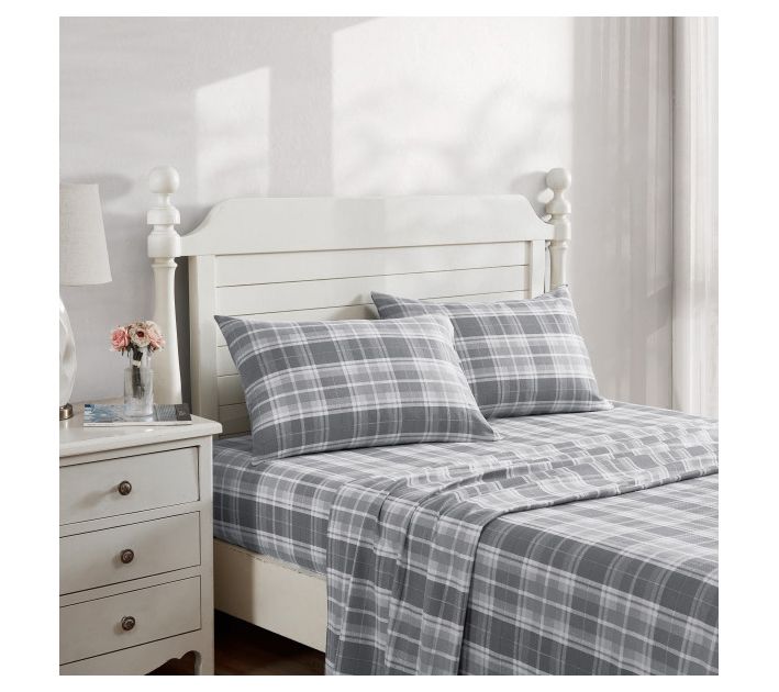 Elevate your bedroom decor with the Laura Ashley Mulholland Plaid Grey Twin Sheet Set. This set combines the timeless charm of plaid with the soft comfort of 100% cotton flannel, offering a cozy and stylish addition to your bedding collection. From Laura Ashley.