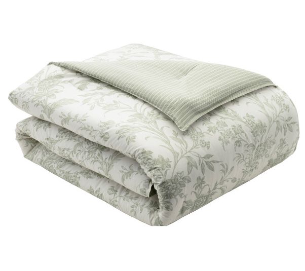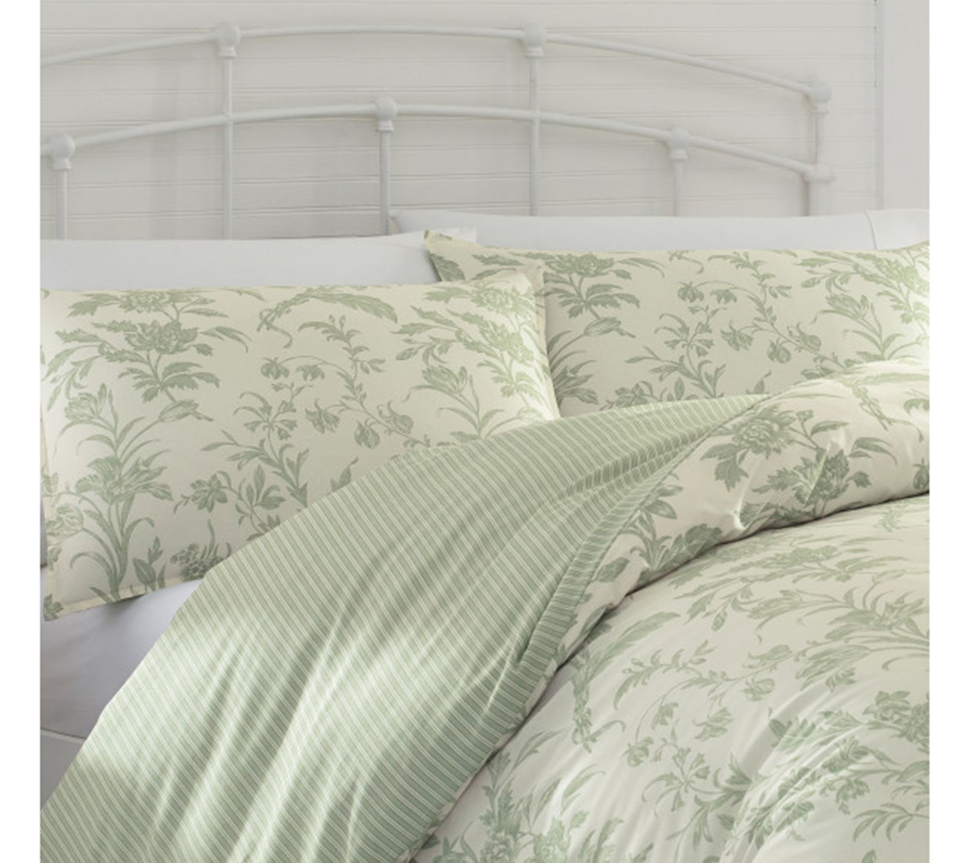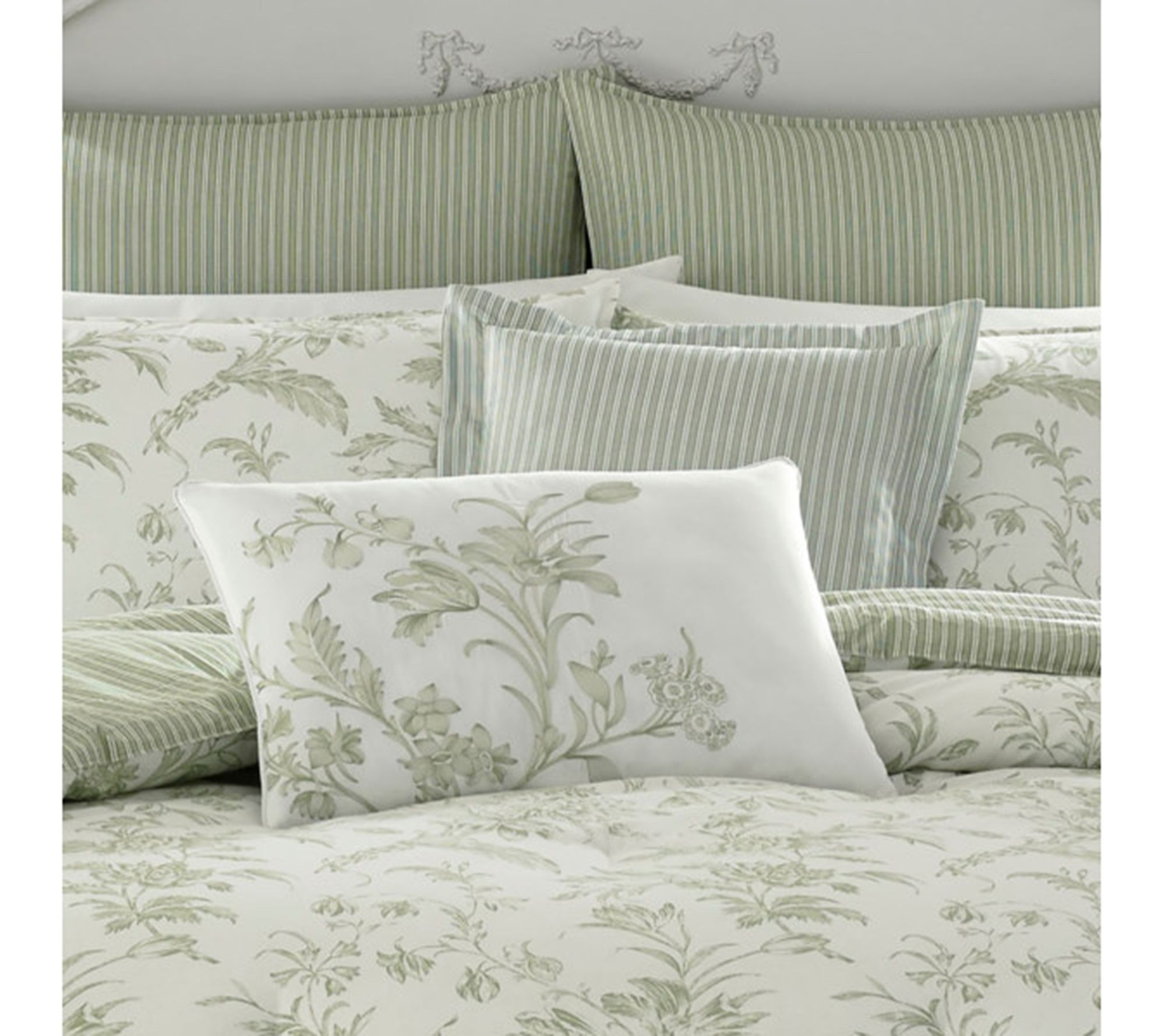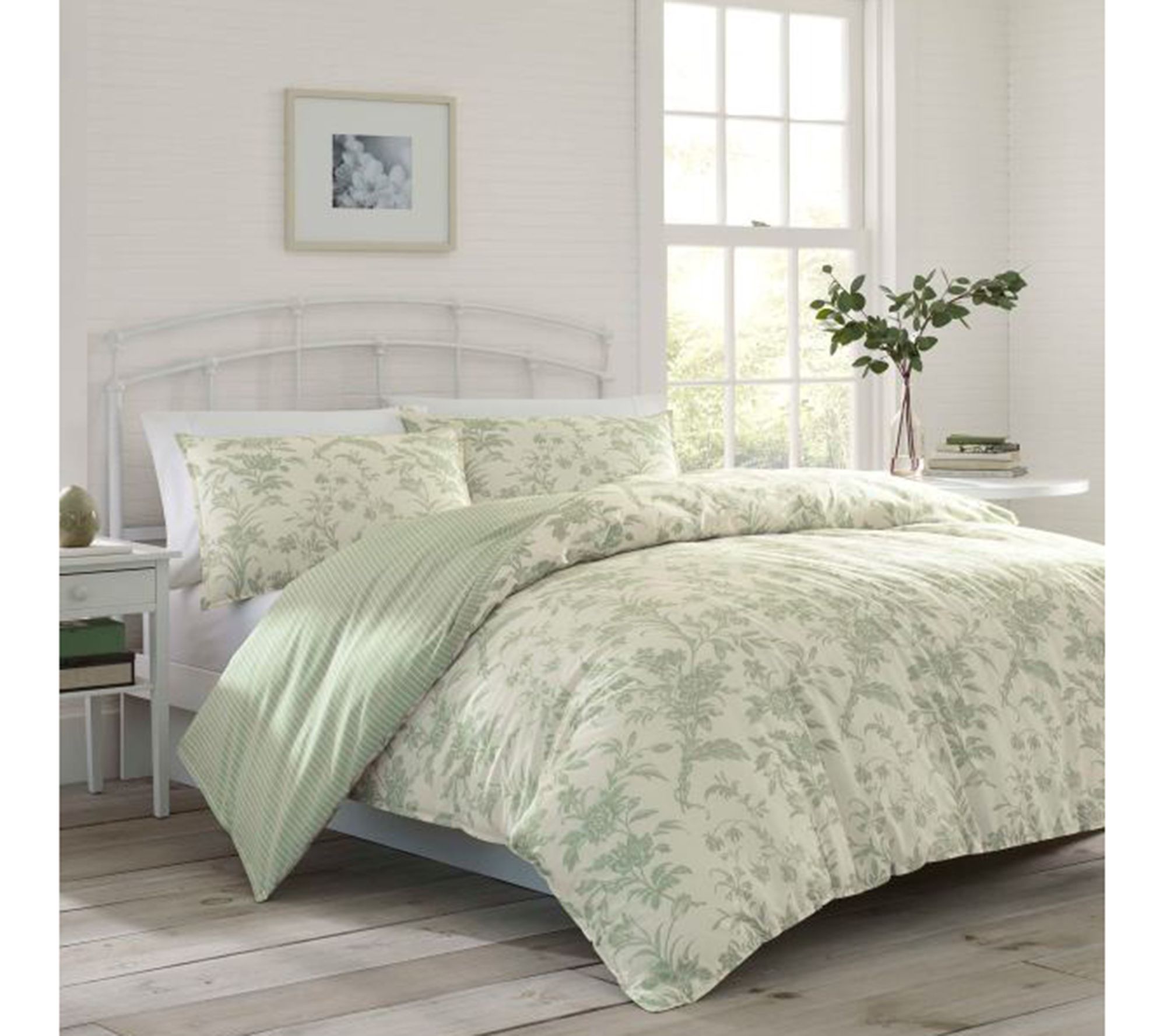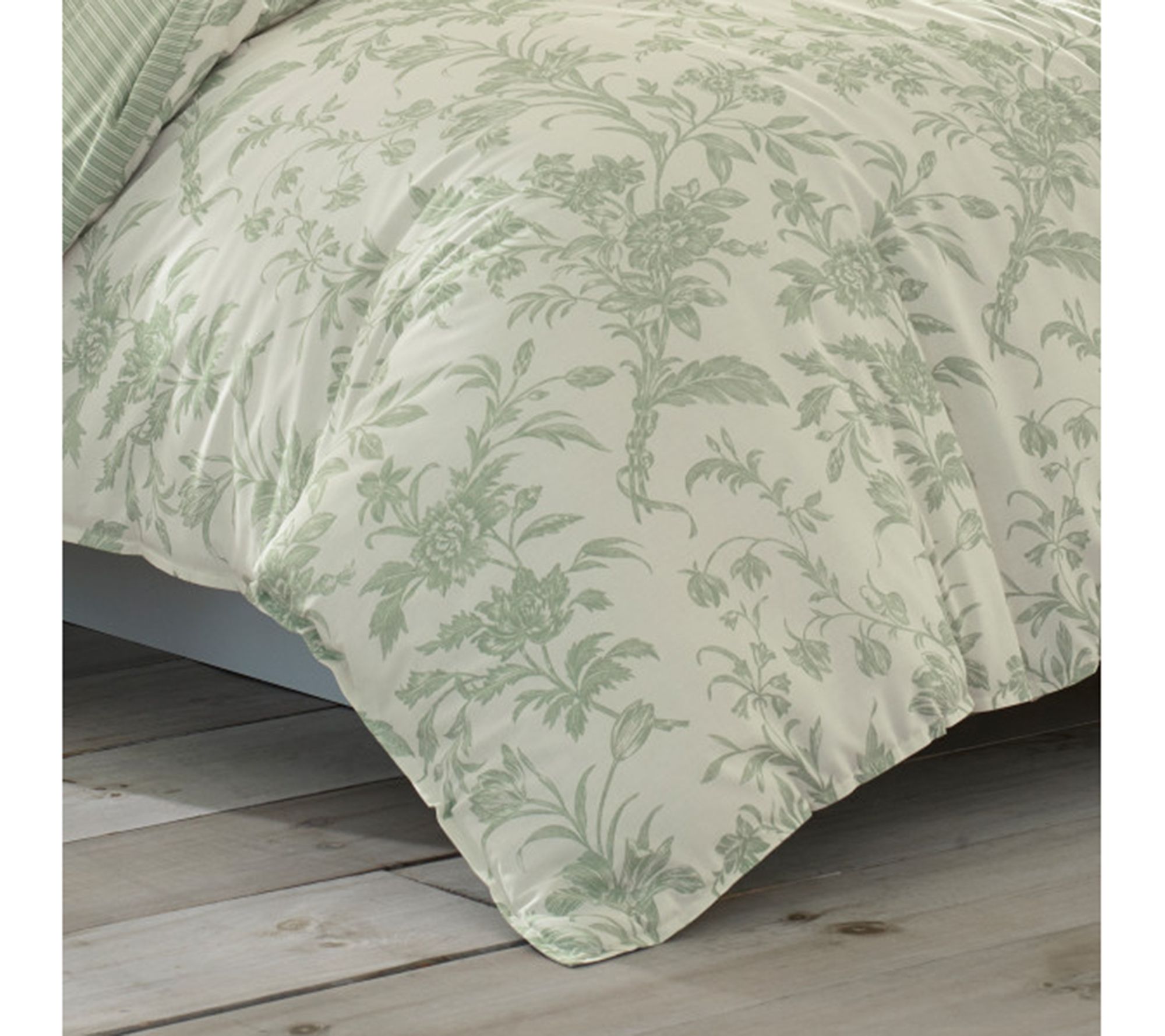 Transform your bedroom into a serene retreat with the Laura Ashley Natalie duvet cover set. The jade green floral toile pattern on a cream cotton ground exudes timeless elegance, while the reversible design offers versatile styling options. From Laura Ashley.