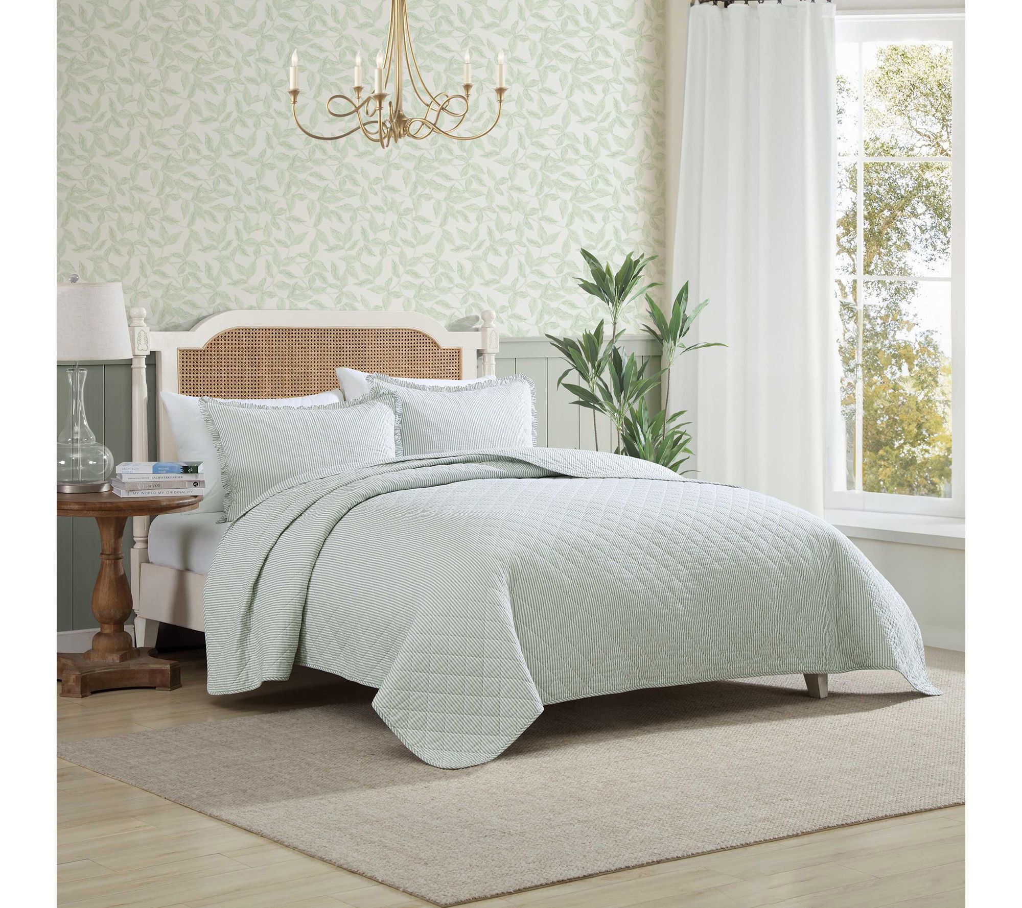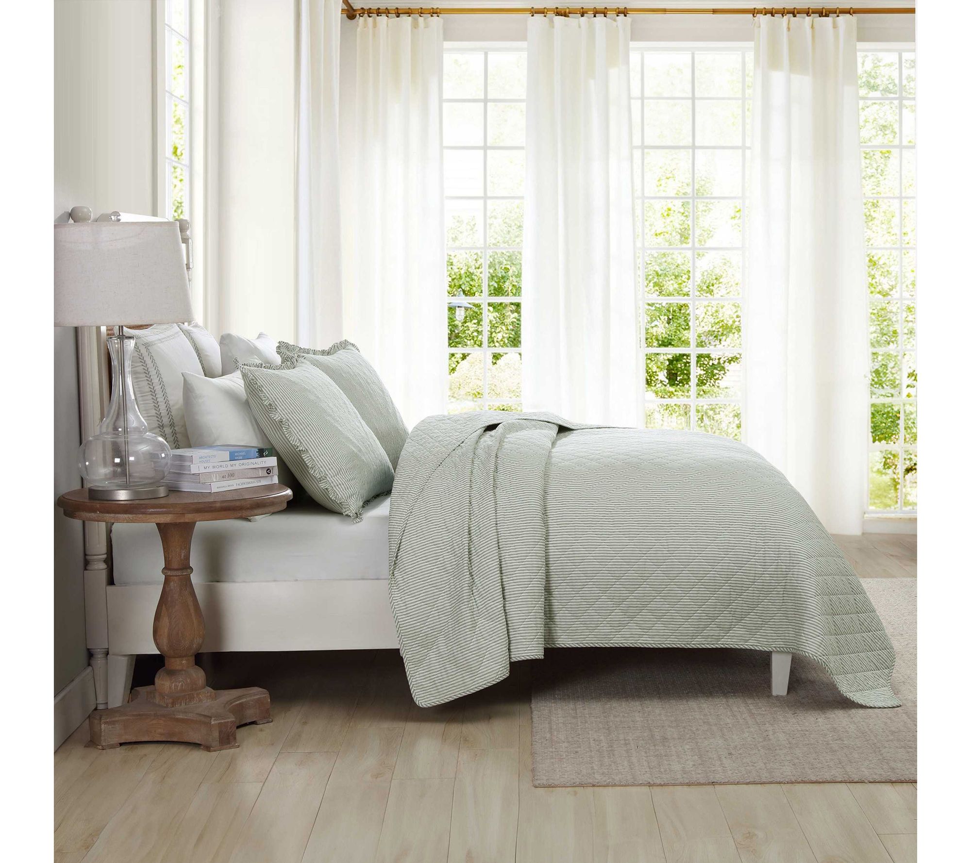 Create a serene retreat with the Laura Ashley Oxford Stripe quilt and sham set. The sophisticated green and white Oxford Stripe print brings a timeless elegance to any bedroom, while the soft cotton fabric ensures comfort for a restful night's sleep. The ruffled shams add a delicate touch to complete the look. From Laura Ashley.