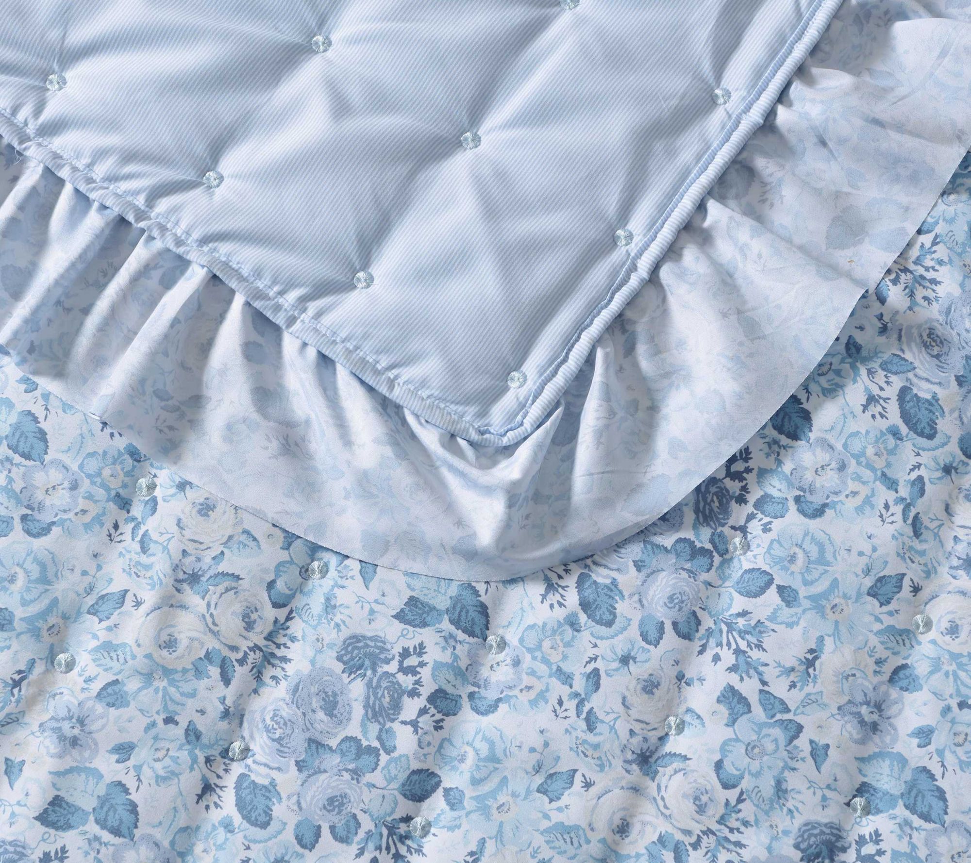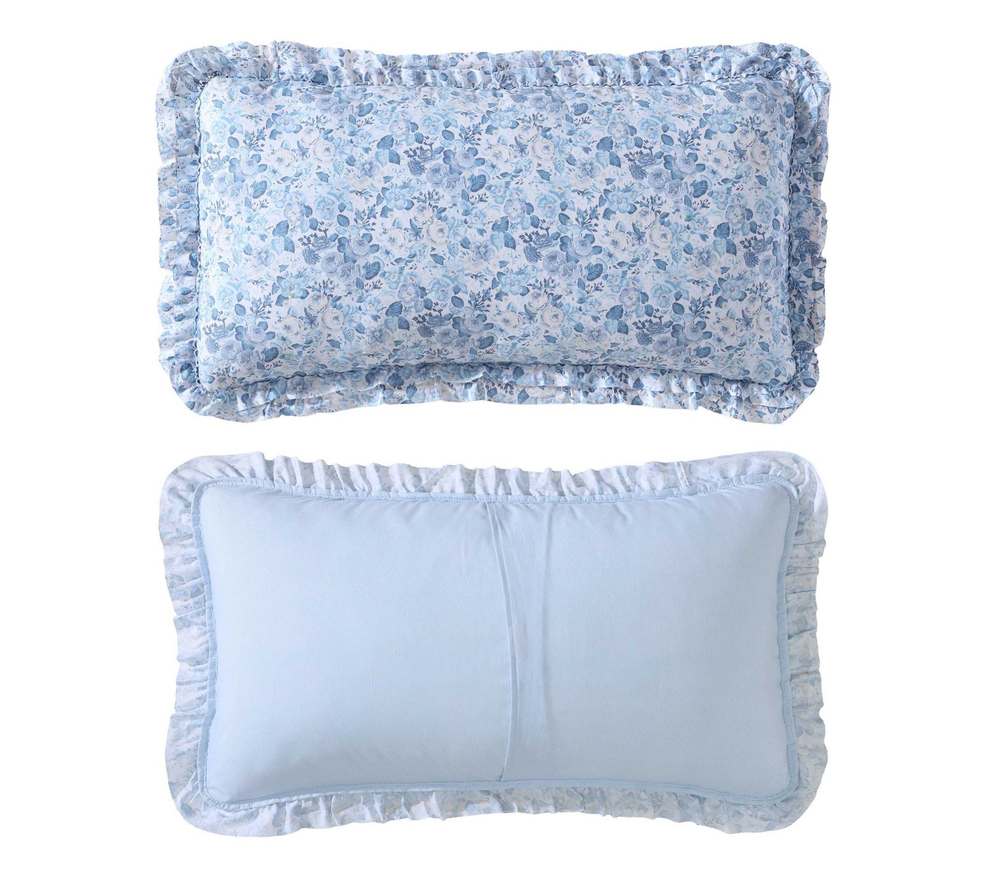 Bring a touch of elegance and comfort to your bedroom with the Laura Ashley Quartet Blue Full/Queen quilt and sham set, featuring an encapsulating floral design and sophisticated double ruffle embellishments. From Laura Ashley.
