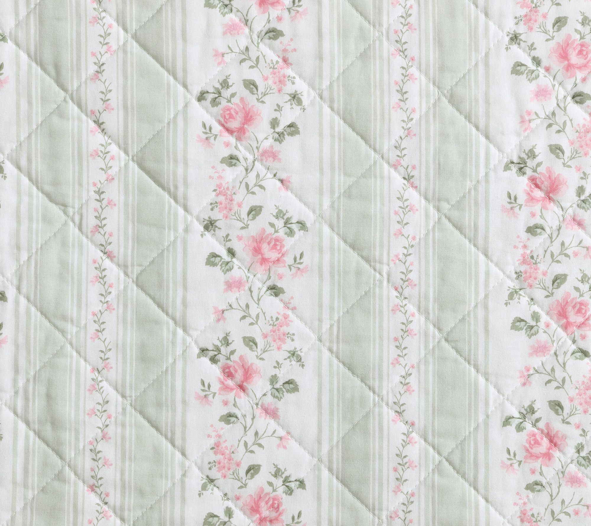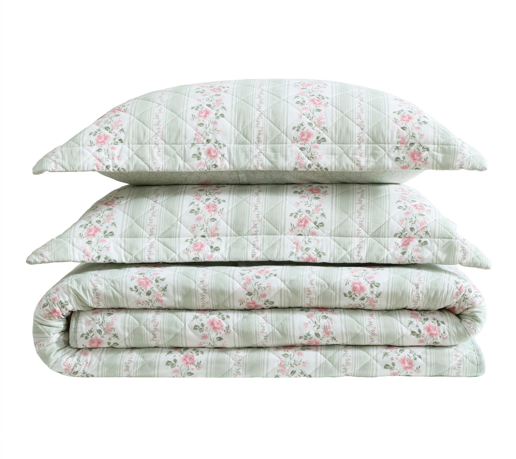 Laura Ashley Rosebud Stripe Sage Green Cotton King Quilt Set