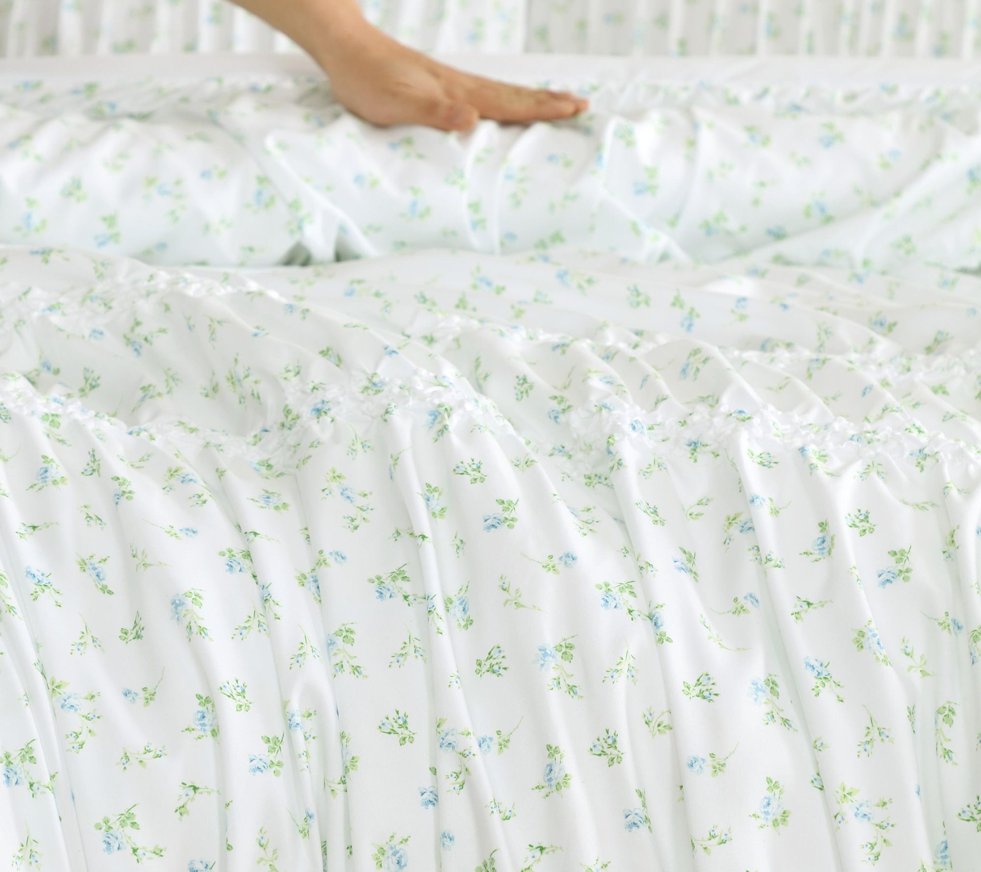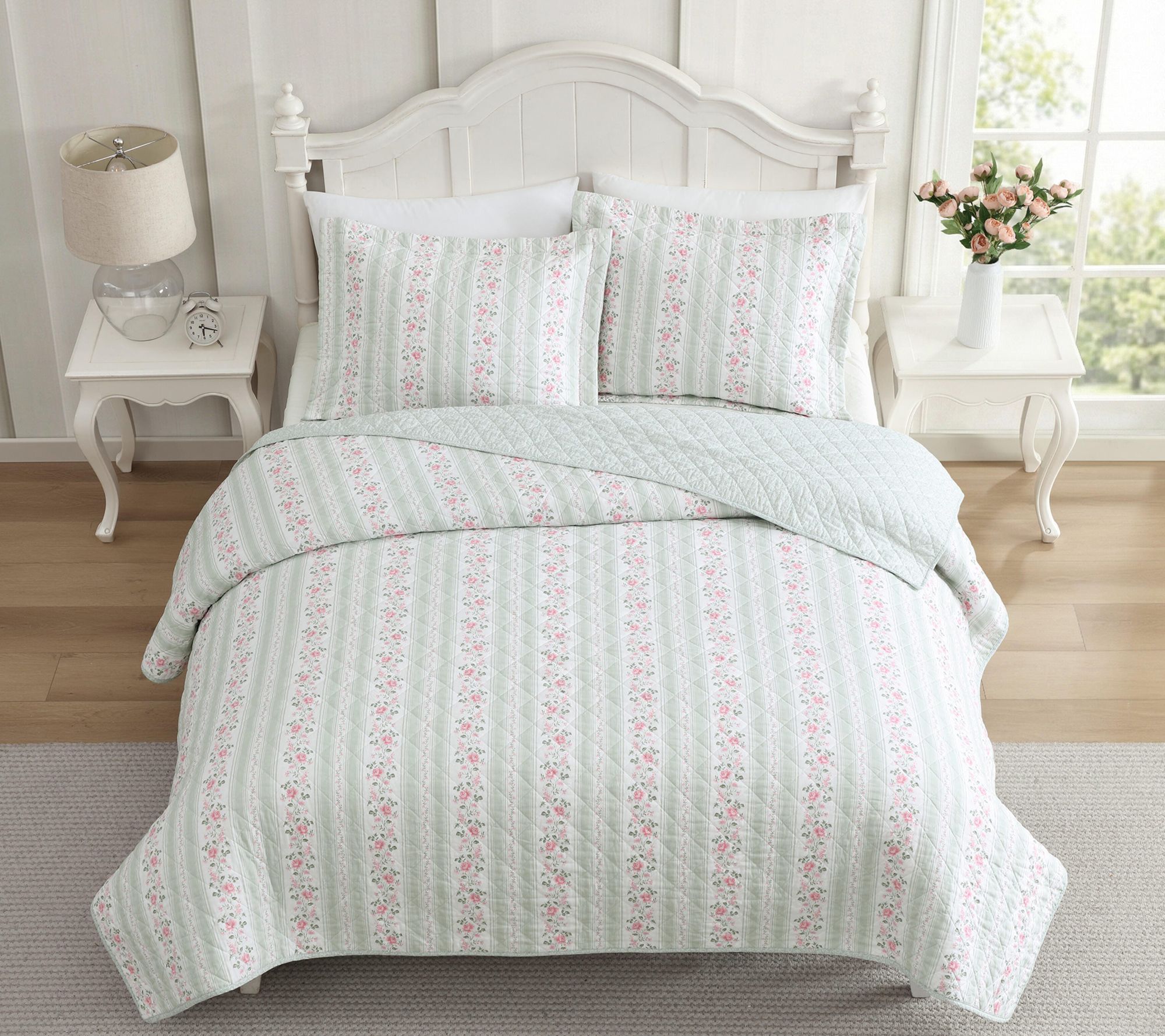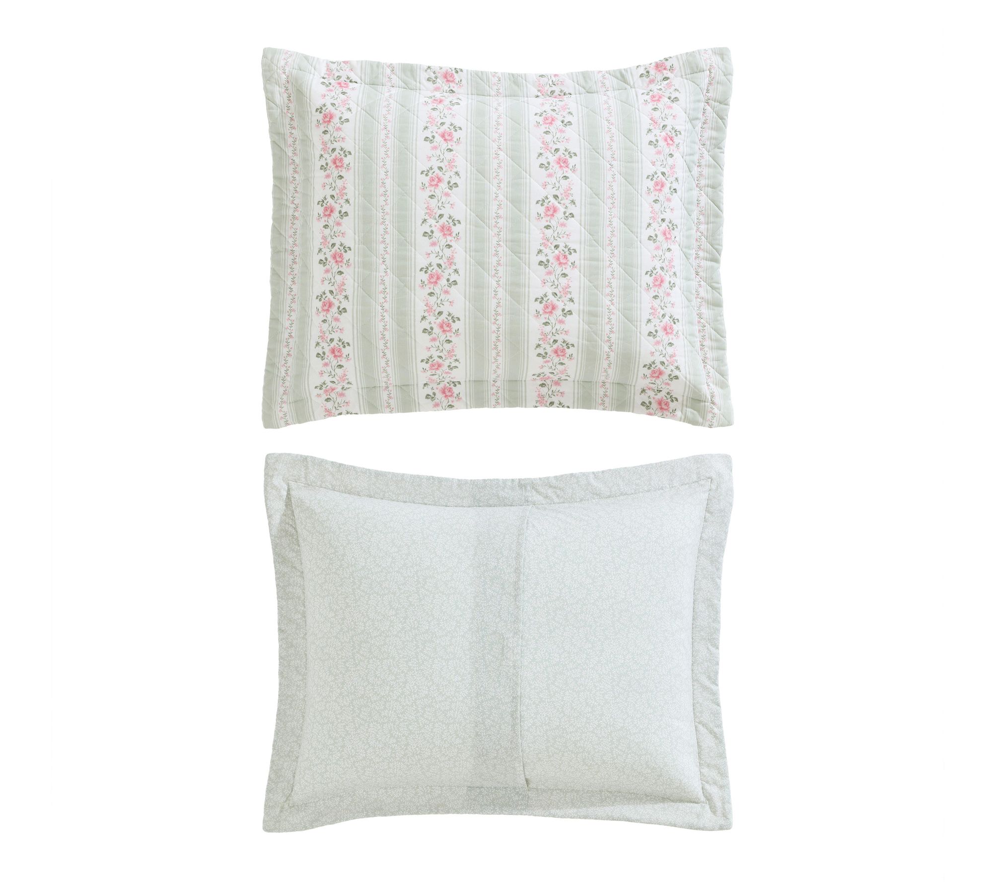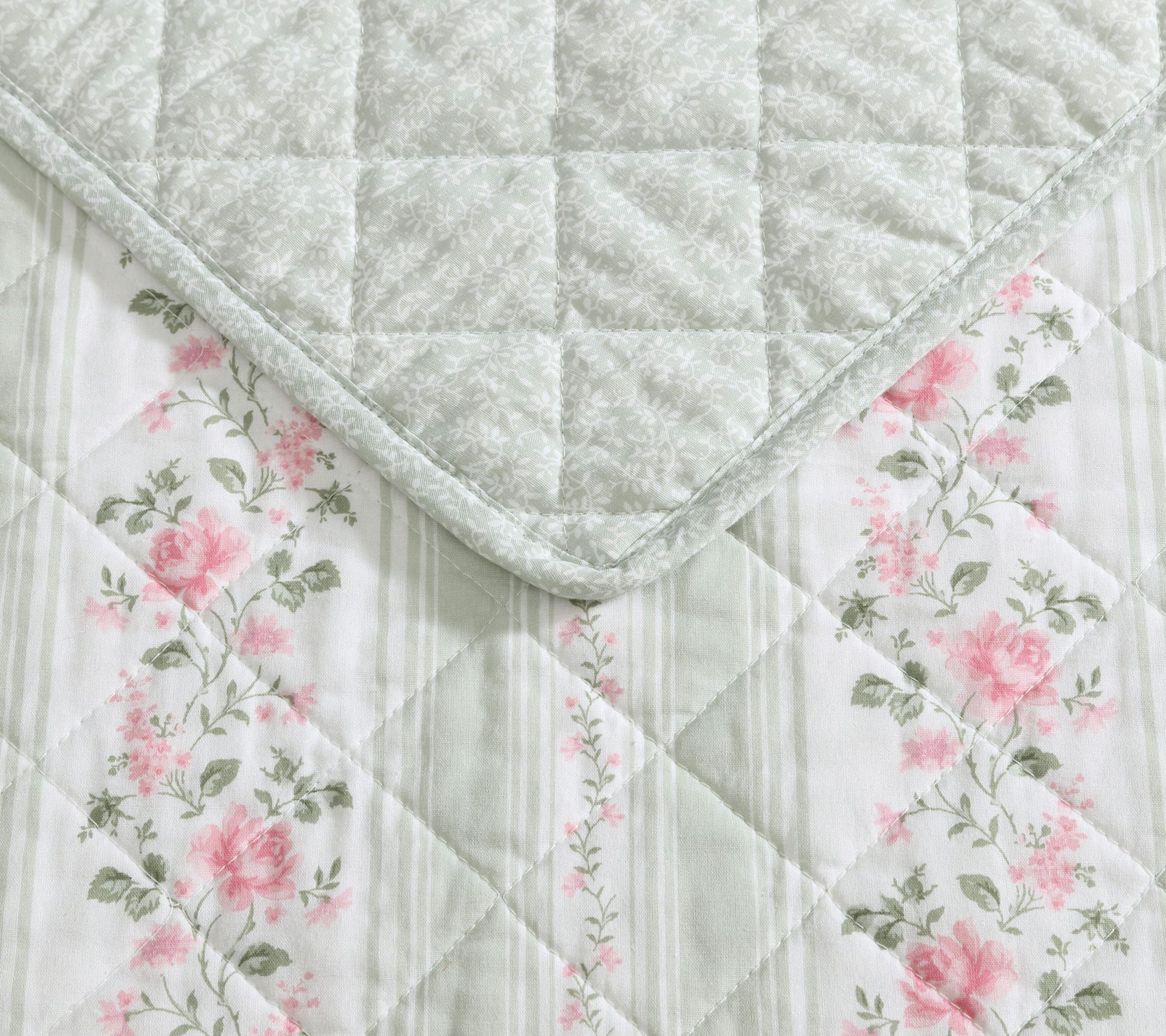 • Reversible quilt set showcases rosebud florals and refined stripes for tailored elegance