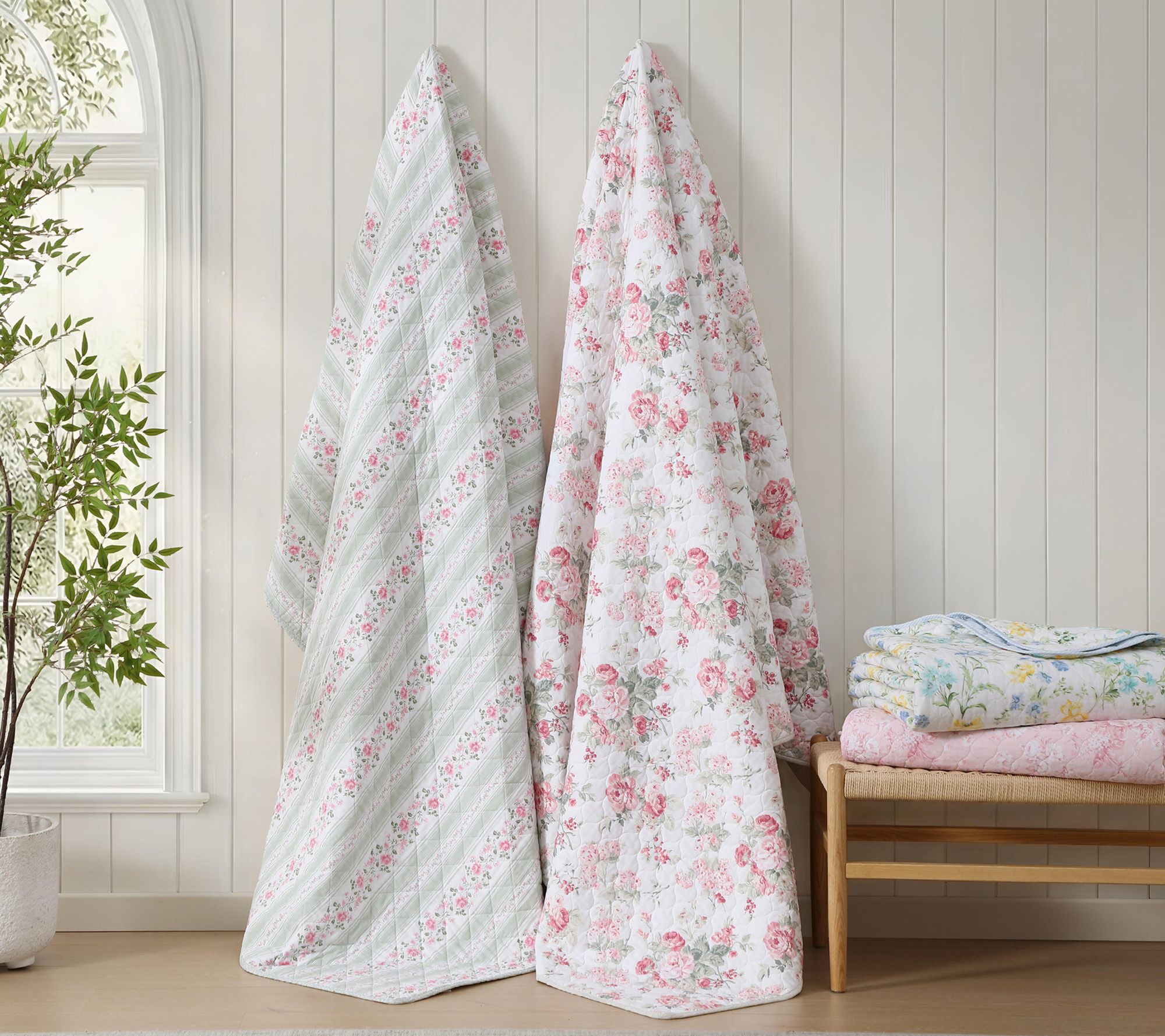 Transform your bedroom into a haven of relaxed sophistication with this quilt set, where vintage-inspired rosebud florals and crisp striped detailing create a calming retreat. The reversible design and breathable cotton offer effortless comfort, whether you seek a cozy layer on cool nights or a light cover during warmer months. From Laura Ashley.