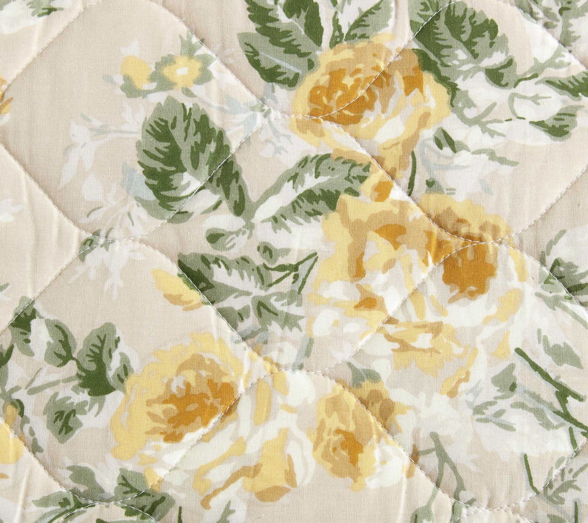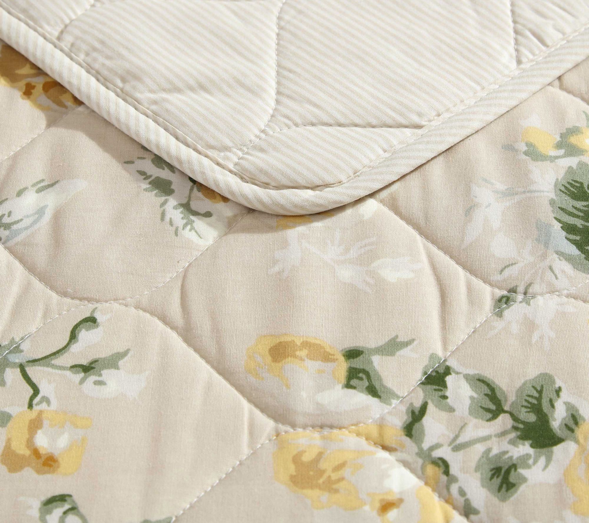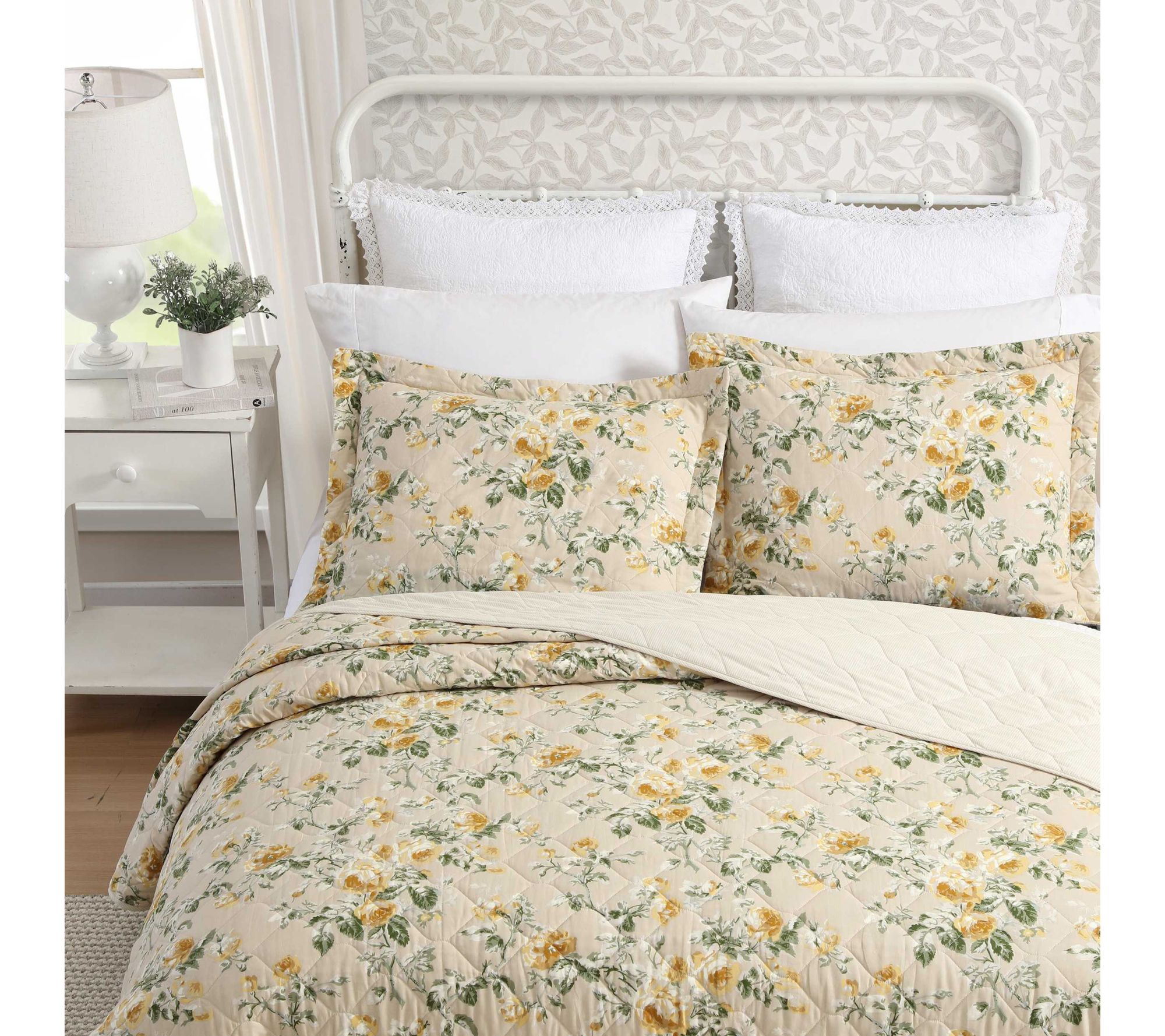 Enhance your bedroom decor with the Laura Ashley Roses Gold King quilt and sham set. This beautiful set features a timeless floral pattern and a soft, cozy feel, making it perfect for year-round use. From Laura Ashley.