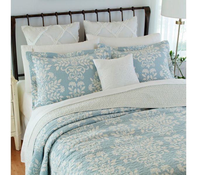 Laura Ashley's Rowland quilt set combines timeless damask with casual style, featuring a soft aqua and white damask print paired with a geometric design on the reverse side. Prewashed for softness, this cotton quilt set becomes cozier with each wash. From Laura Ashley.