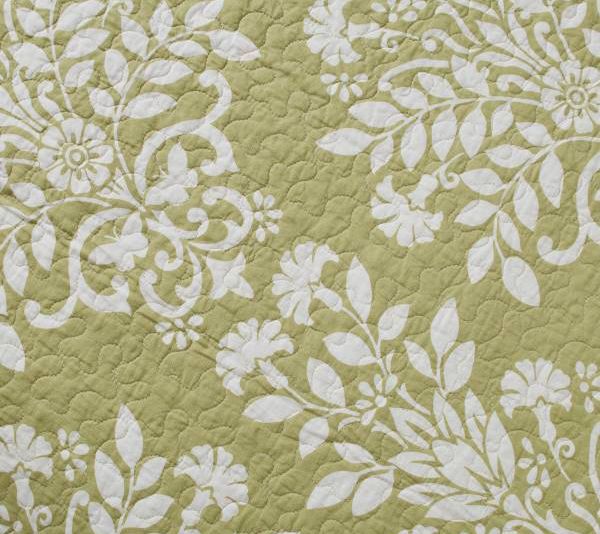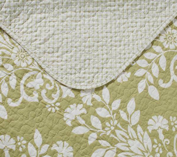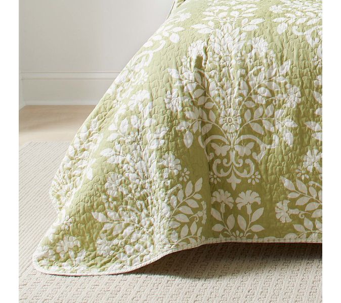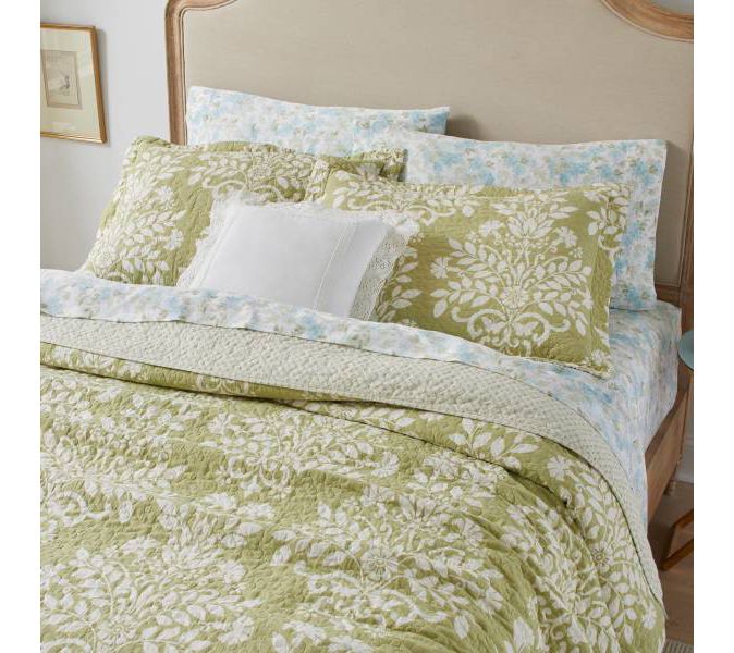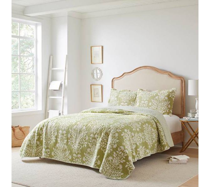 Bring a touch of timeless elegance to your bedroom with the Laura Ashley Rowland green twin quilt-sham set. This set combines a classic damask print in sage green and white with a geometric reverse design, ensuring versatility and style. From Laura Ashley.